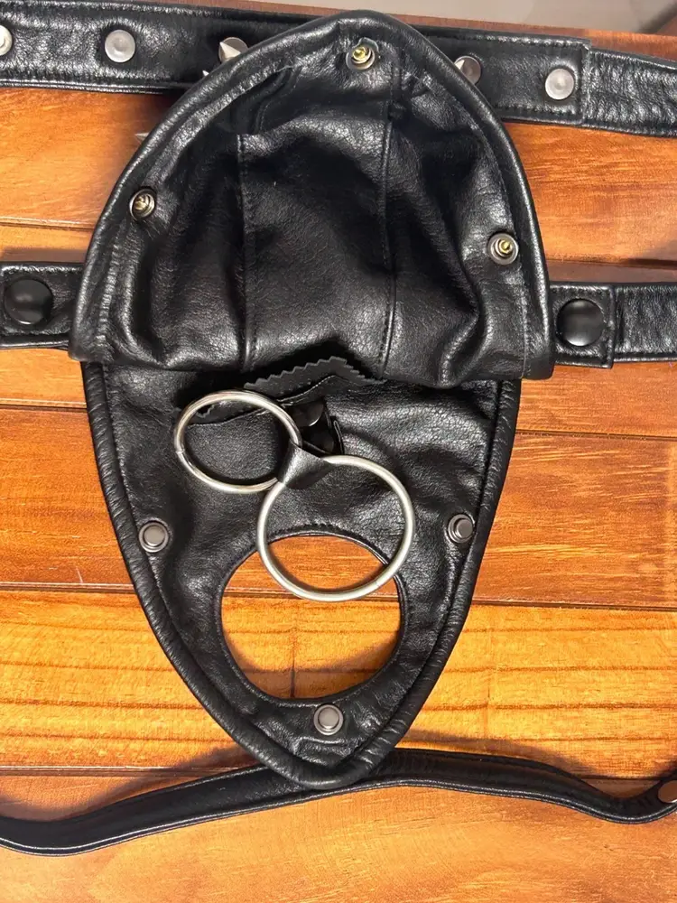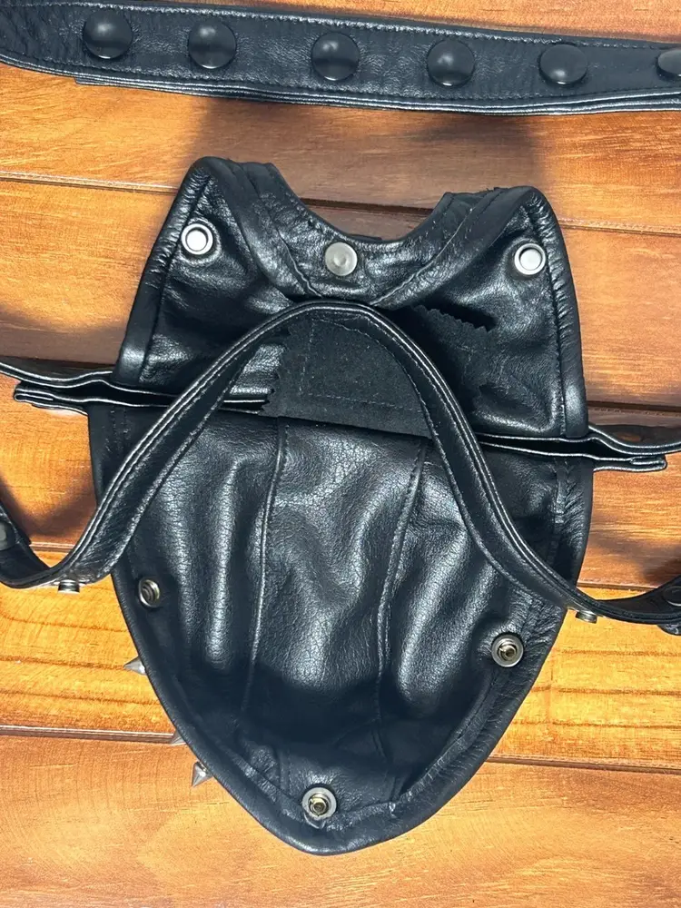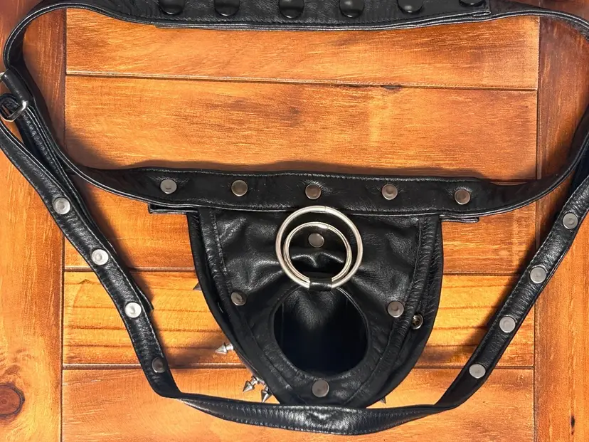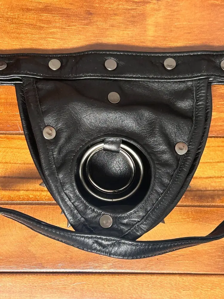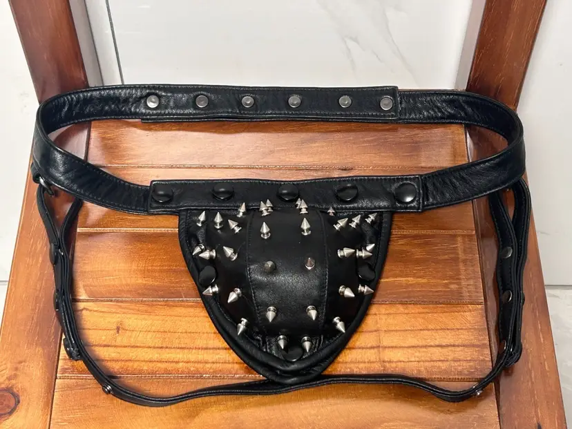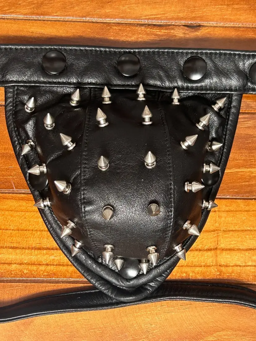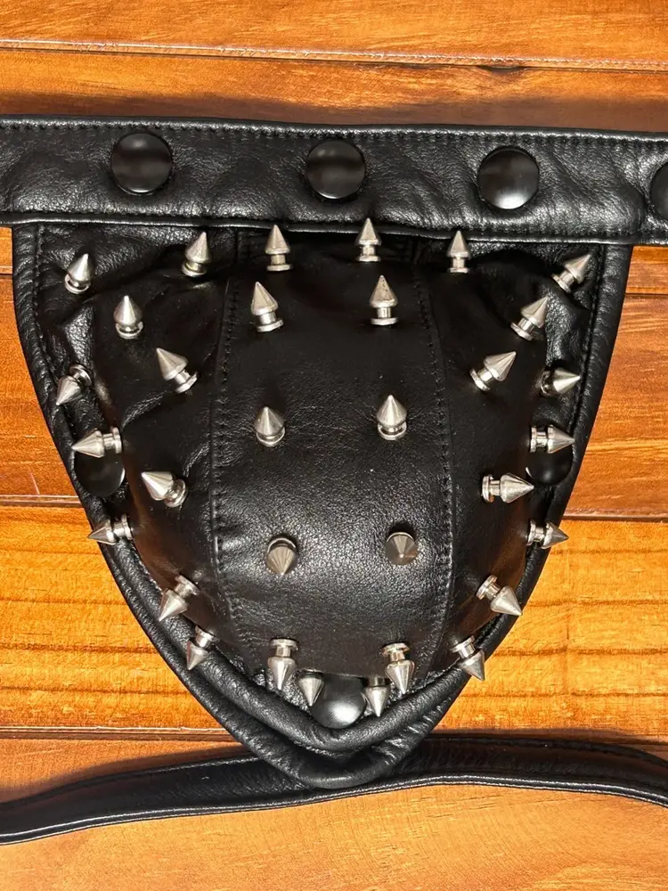 This is a men's black genuine leather thong featuring an open-strap design and multiple metal cone studs on the front pouch. The leather is firm and structured, giving the piece a bold visual impact. Suitable for cosplay, performance, or statement styling. The back features a looped strap system with adjustable fit, focusing on decorative appeal and style expression.