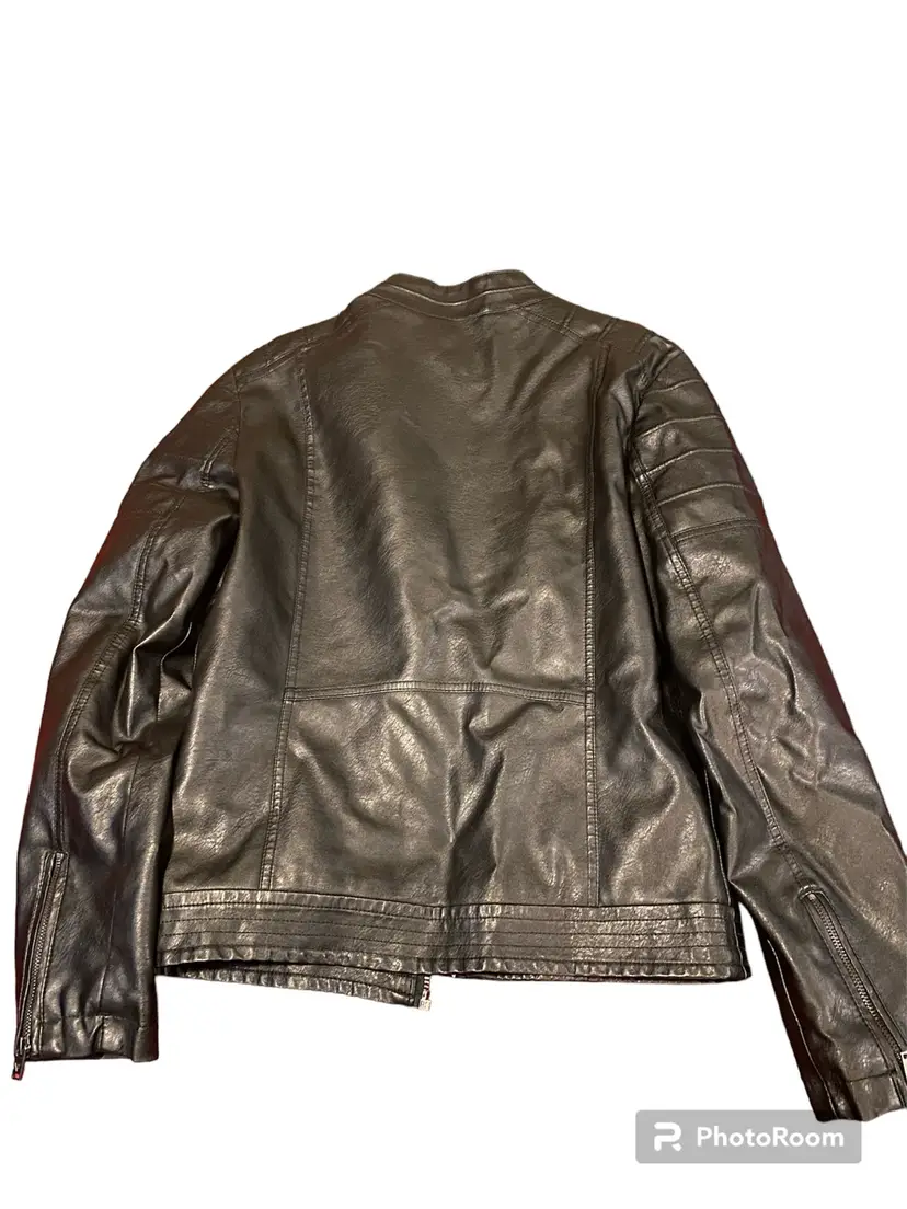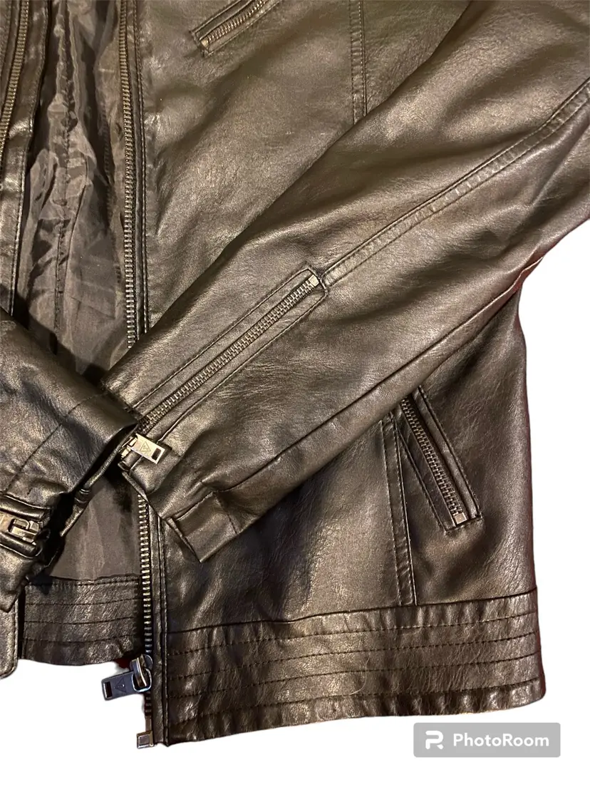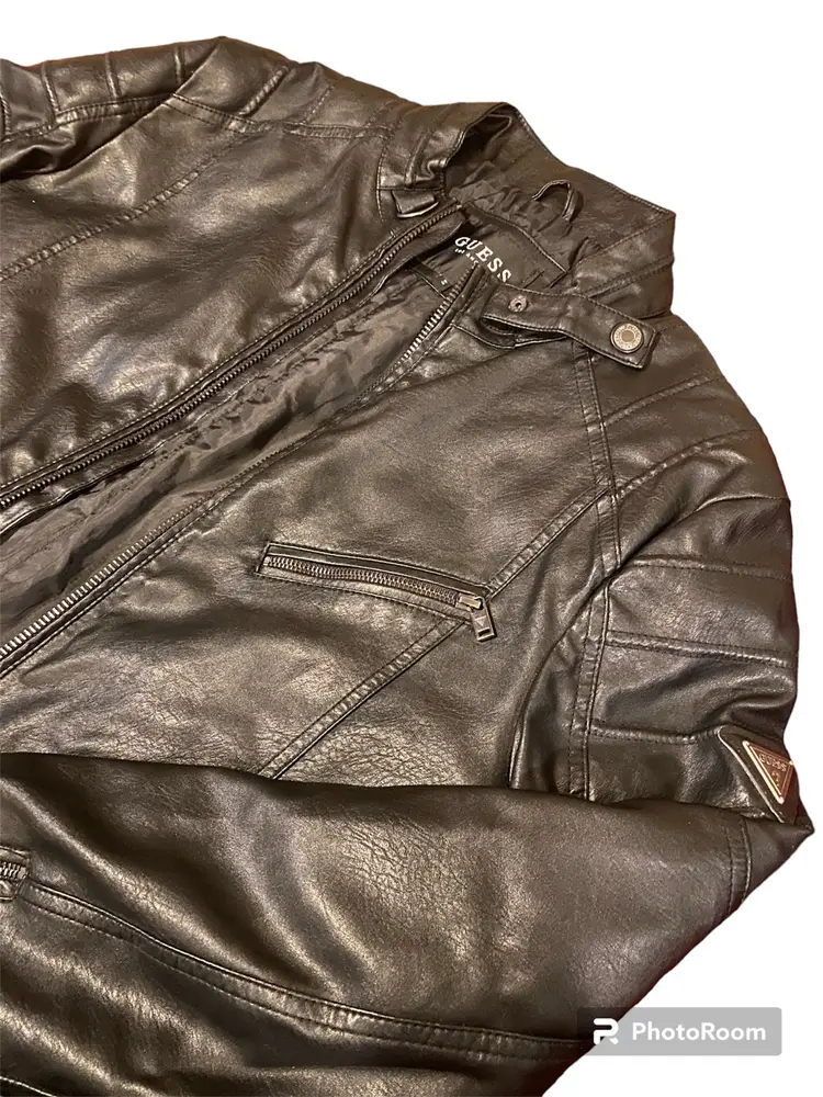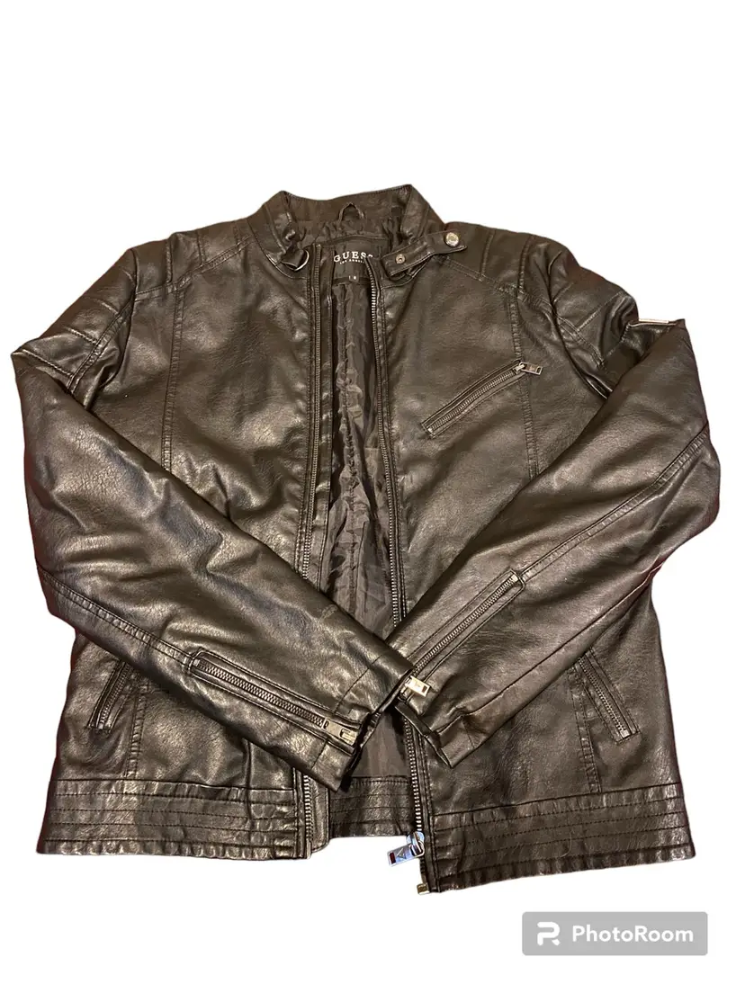 Very nice Guess faux leather jacket, size small in men’s. No rips, tears or gouges, appears to be very gently used. Super nice material, nice hardware and cool design. Perfect jacket for a fall motorcycle ride or a night out. Thanks!