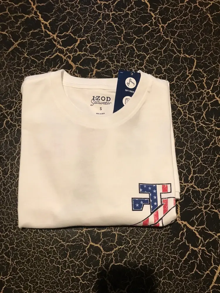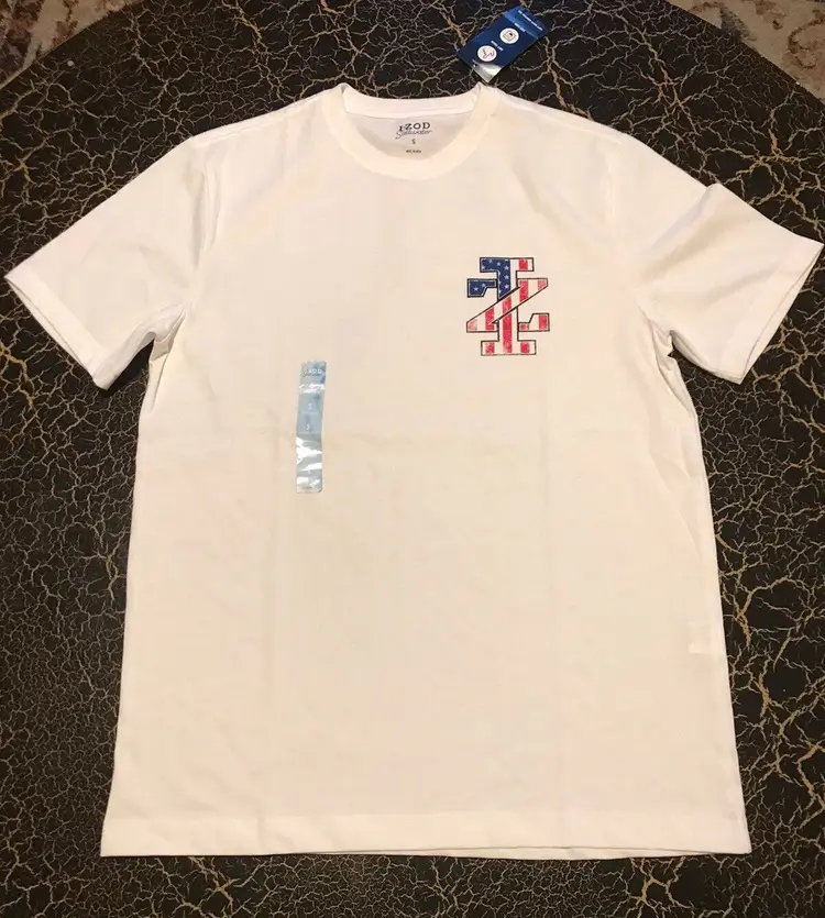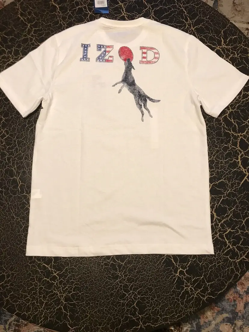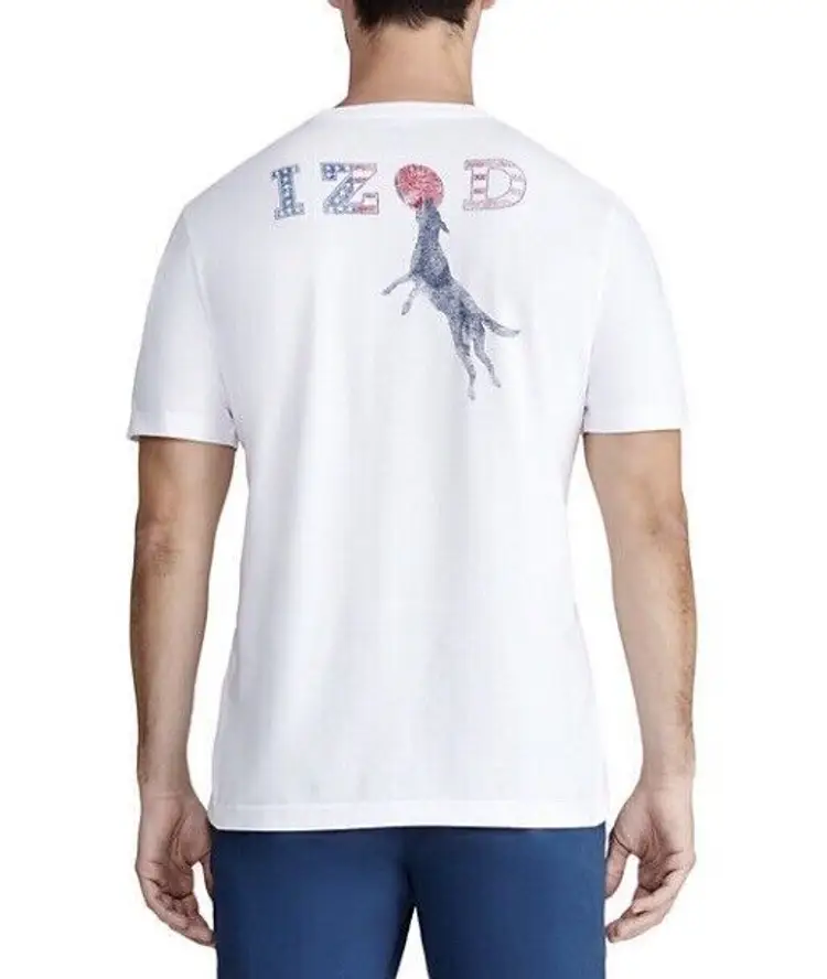 Elevate your beach look with this men's short sleeve T-shirt from IZOD's Saltwater Collection. The solid blue shirt features a fun graphic print of surfboards and sharks, perfect for your next beach adventure. Made of a comfortable cotton blend fabric, this shirt fits true to size with a regular fit. #64-0/2298-1 The shirt also features a crew neckline and vintage accents, giving it a classic beachy feel. Whether you're fishing or just soaking up the sun, this T-shirt is perfect for all seasons. Add it to your collection today!