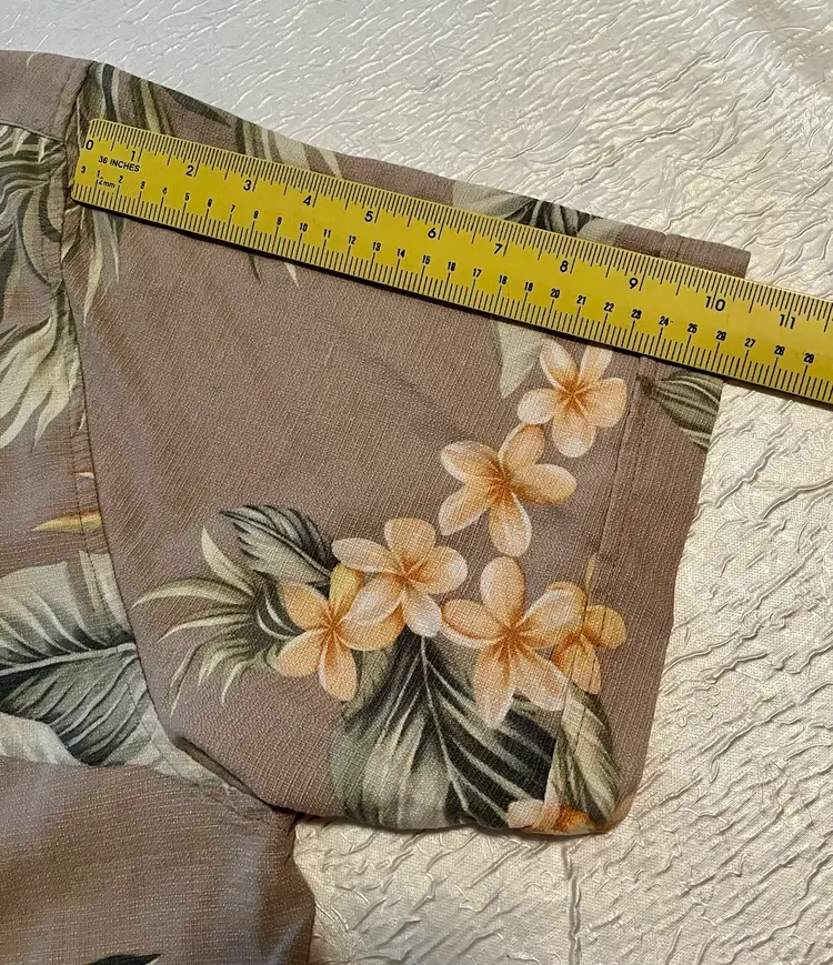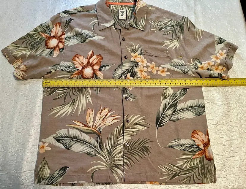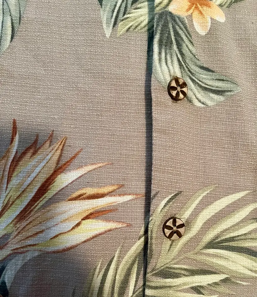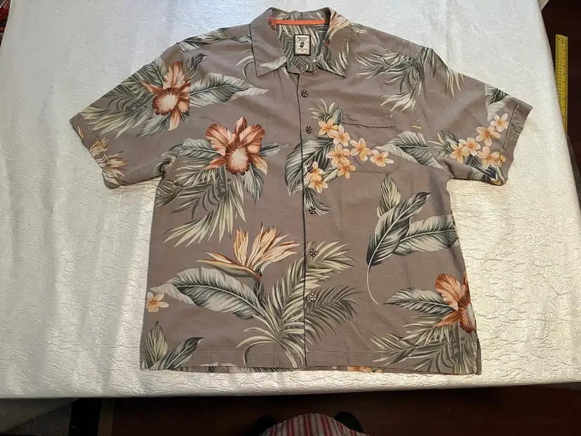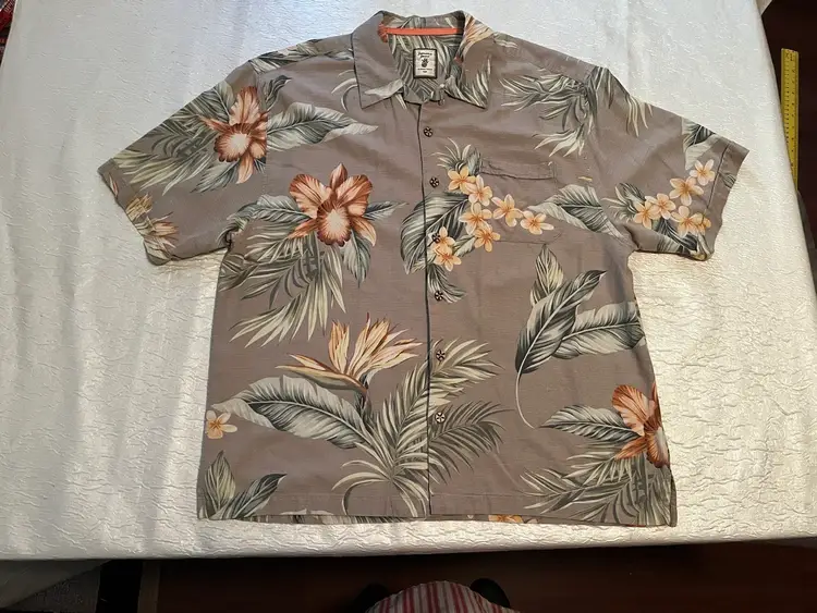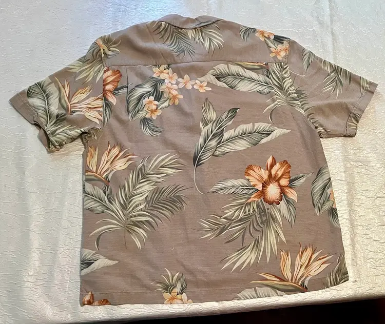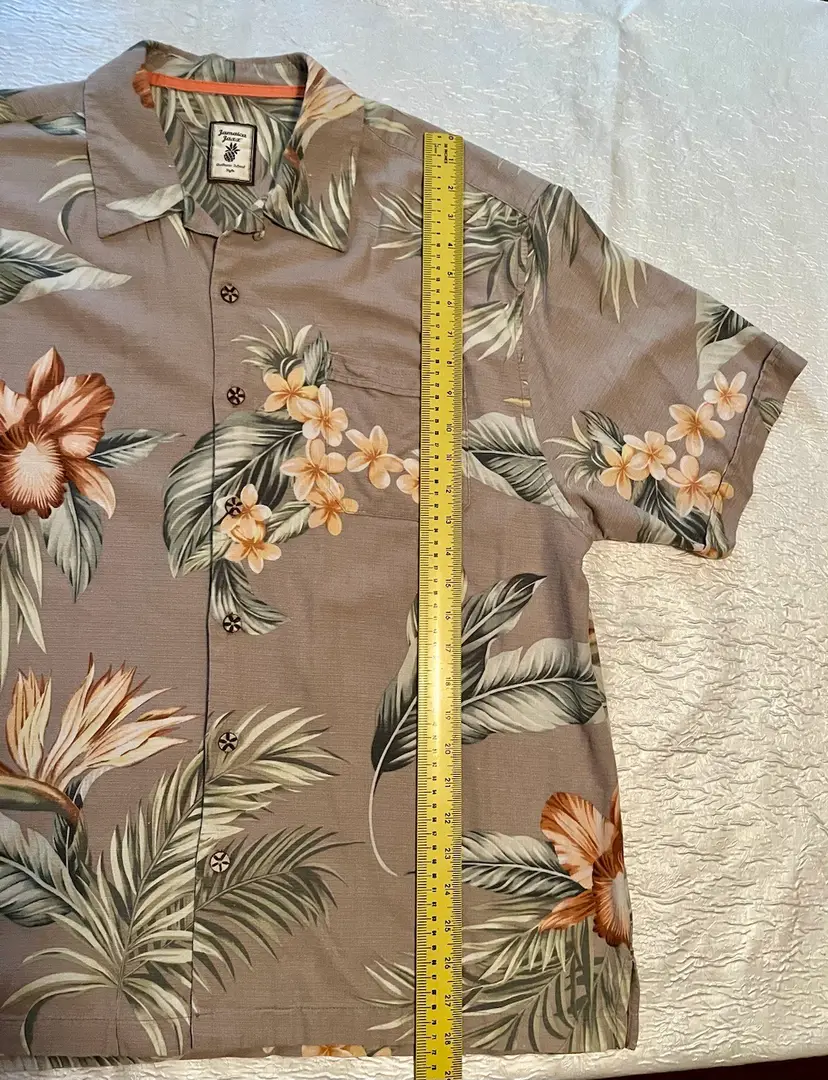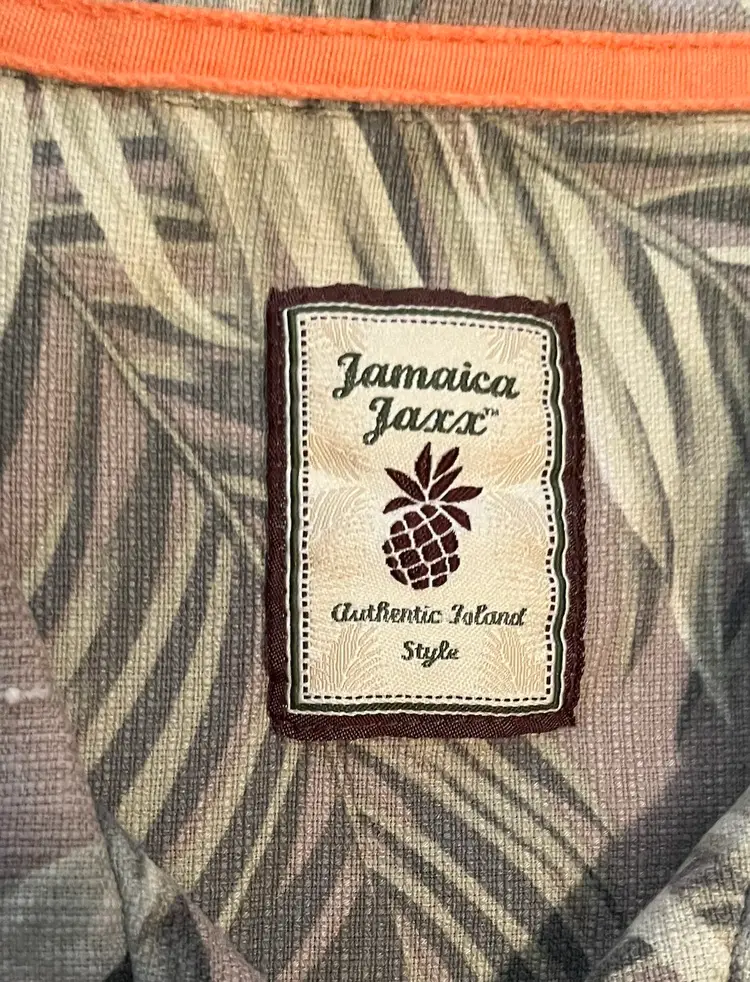 This gently pre-owned Jamaica Jaxx shirt with a spread collared neckline and short sleeves, it's perfect for many types of occasion, whether you're traveling, on a cruise, at work, or just hanging out. Made of high-quality silk, this shirt is both comfortable and travel worthy, and comes in a beautiful beige multi-color tropical/Hawaiian pattern.