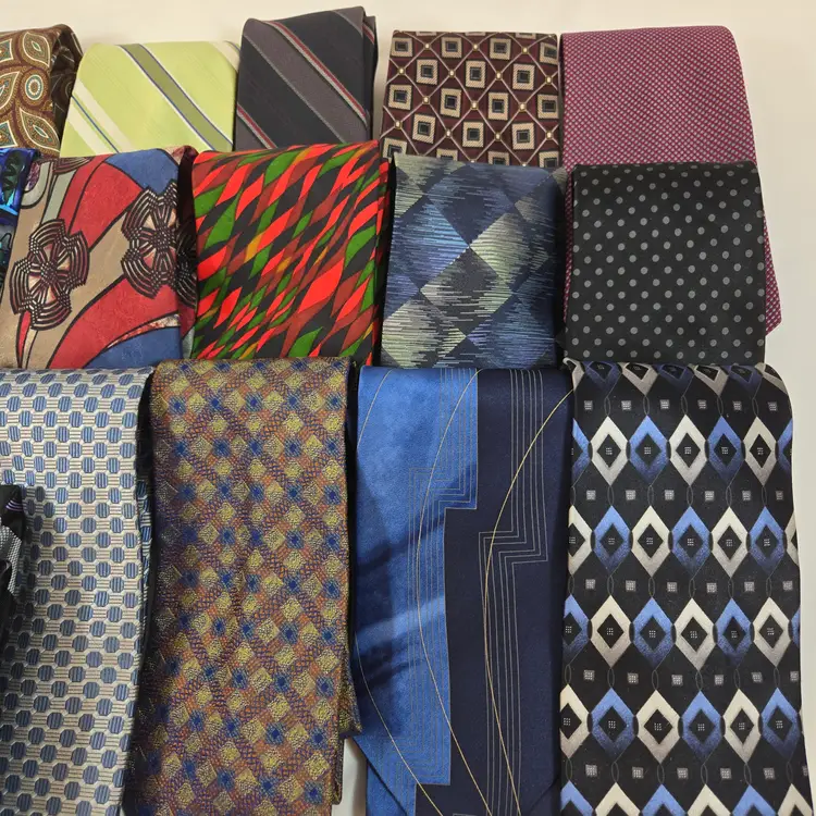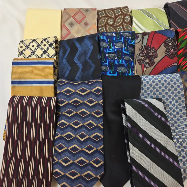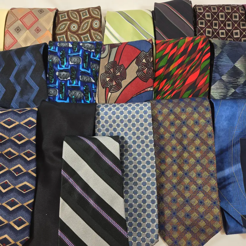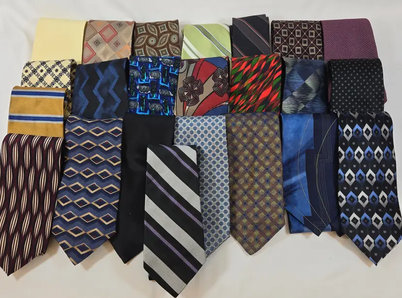 Collection of 23 men’s neck ties in a mix of brands, colors, and styles, ranging from bold stripes and geometrics to classic solids and patterned designs. A fun variety that brings back the look of office days, formal dinners, and the endless tie gifts that always showed up at birthdays or holidays. Great bundle for resale, crafting, or anyone wanting a wide tie selection at once.