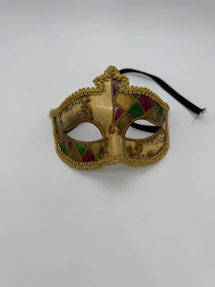 This handmade paper mache half mask features a unique design of music notes, perfect for a Mardi Gras or masquerade party. The eye mask is crafted with a beige, purple, green, and gold fabric color scheme, making it a versatile accessory for various costume and theme occasions. With a vintage flair and in one size fits all for adult men’s wear, this Venetian-inspired mask is sure to add a touch of authenticity and style to any special event.