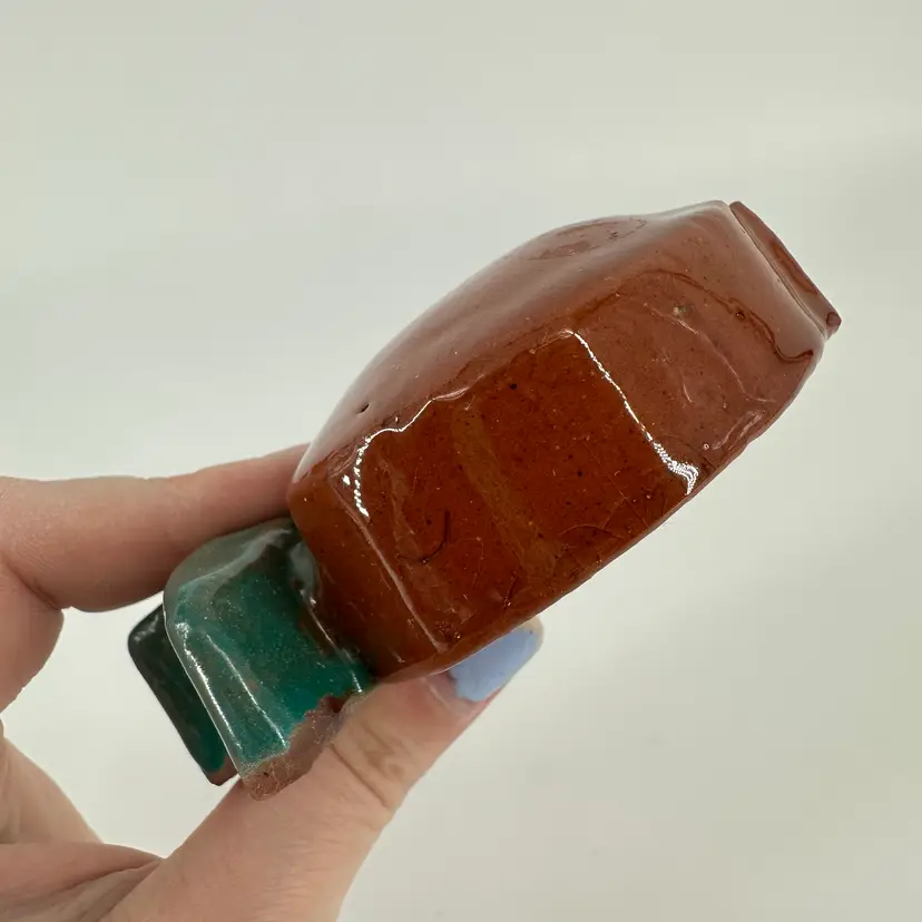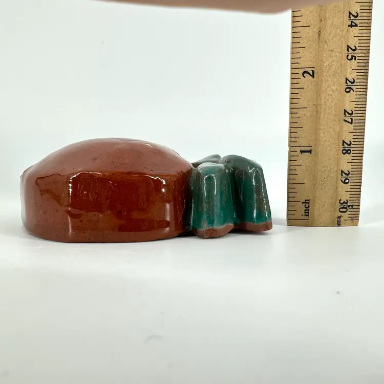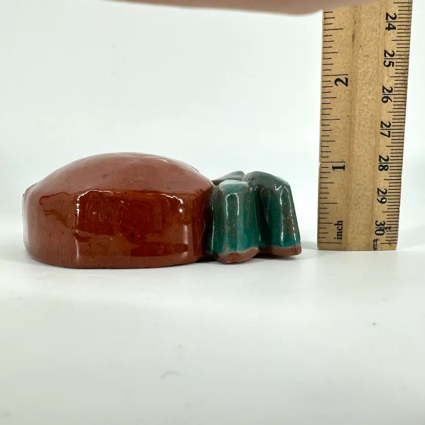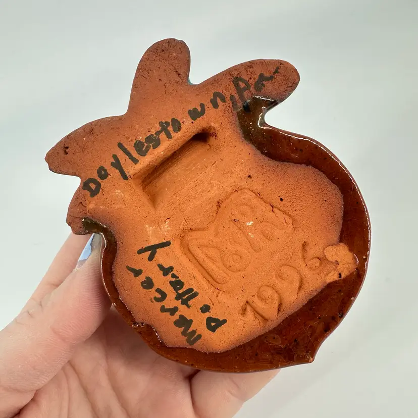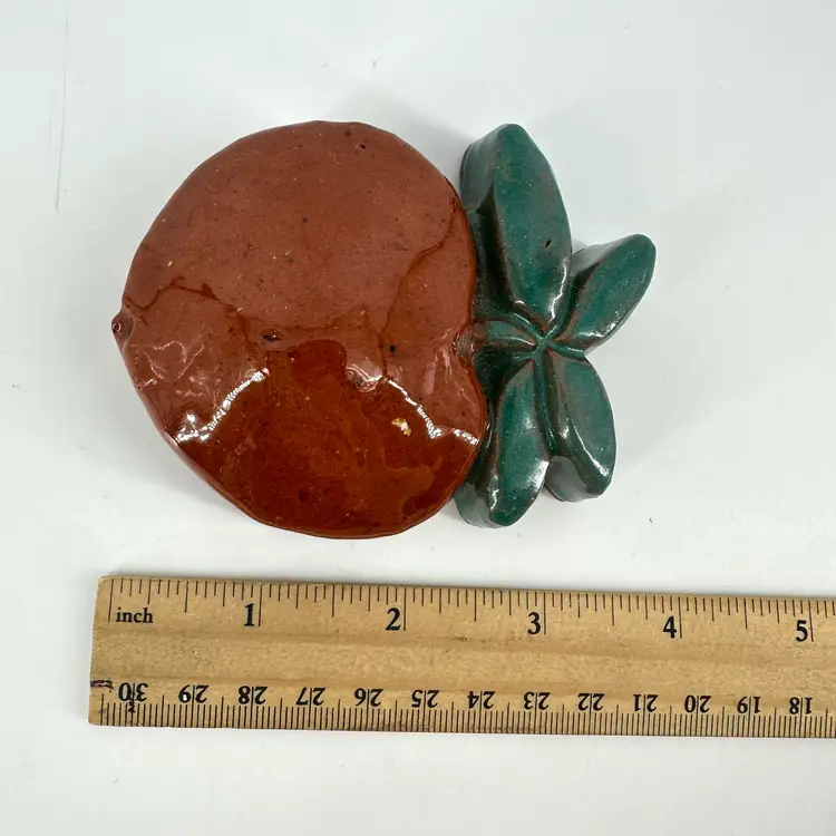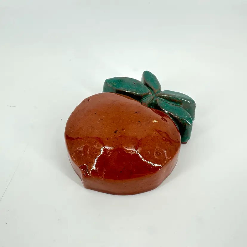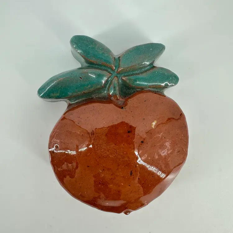 Small redware peach wall hanging made by Mercer Pottery in Doylestown, PA. Stamped logo and signed on back. See photo. Measures approximately 4”x2.5”. Crazing is present in glaze. A tiny bruise in the glaze can be seen from the front.