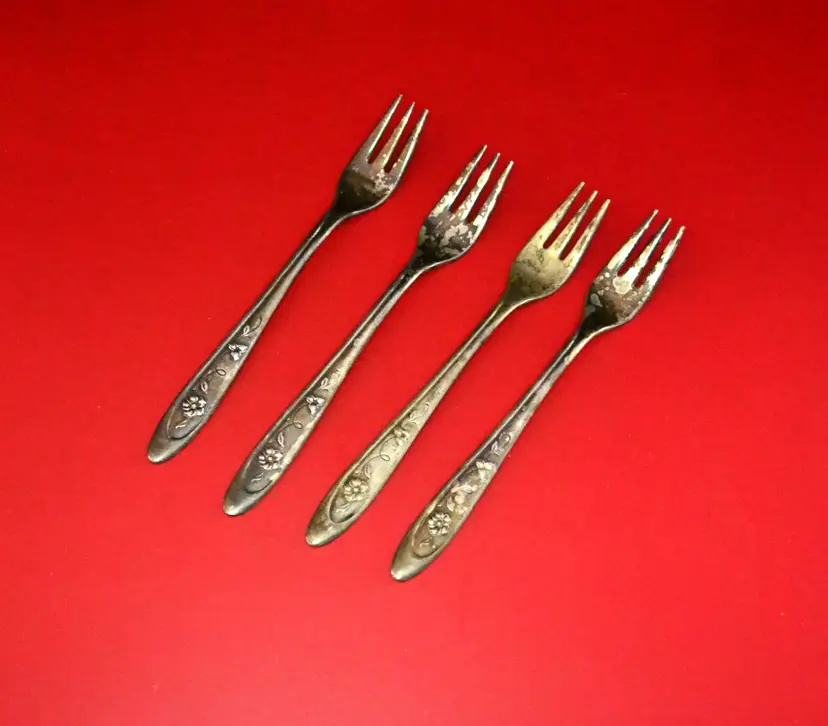 Set of 4 cocktail forks by Meridian Silverplate Company. 5 inches long. From about the 1940s to 1950s. Great addition to a vintage barware collection.