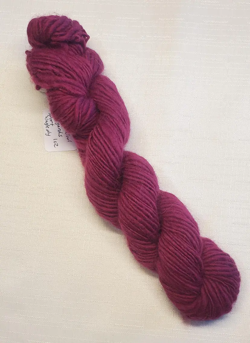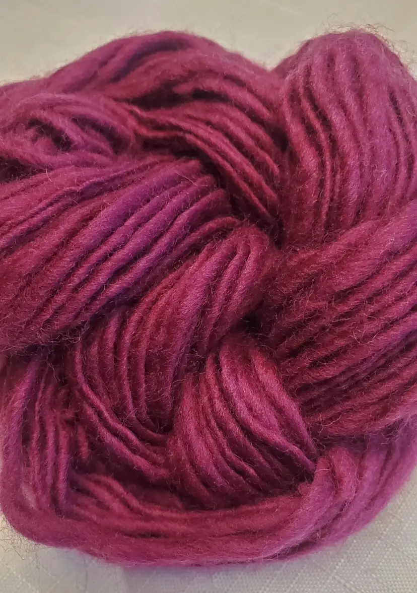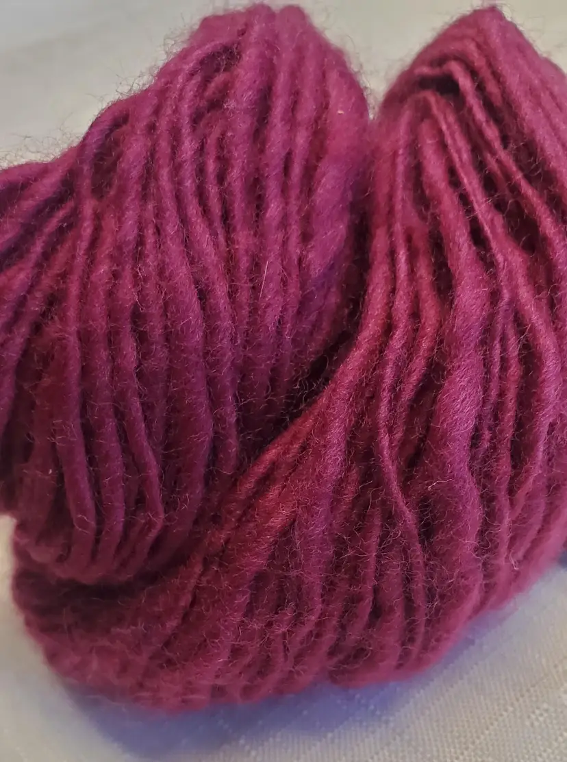 This listing is for 1 mini skein of hand spun wool yarn in a deep raspberry red.