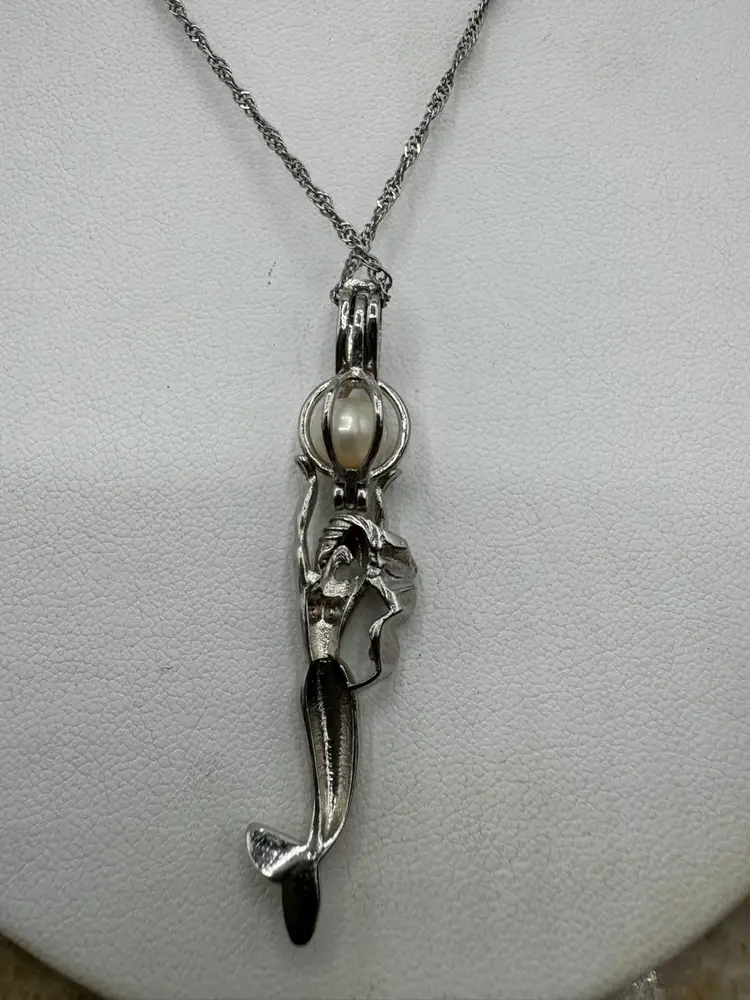 The Mermaid Genuine Caged Pearl Pendant Necklace is a stylish and elegant piece of jewelry featuring a genuine pearl as the main stone. The pendant style adds a touch of sophistication to any outfit, making it a versatile accessory for both casual and formal occasions. The unique caged design adds a modern twist to the classic pearl necklace, making it a statement piece for any jewelry collection. Perfect for those who appreciate high-quality craftsmanship and timeless beauty. Excellent condition. Chain Measures 18” Pendant Measures 2 1/4” X 1/4”