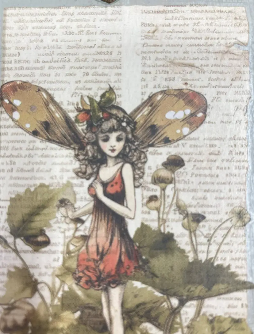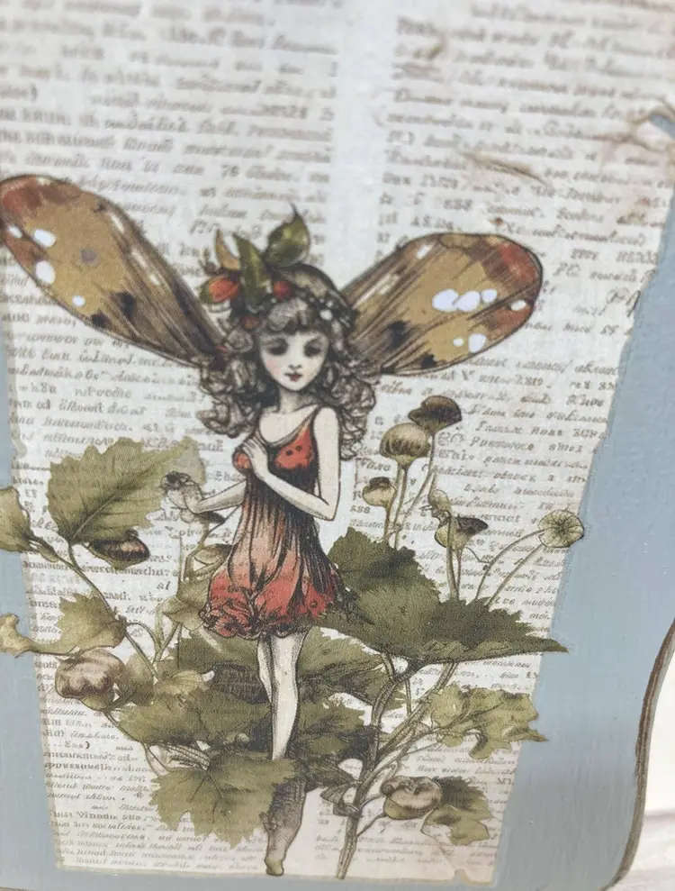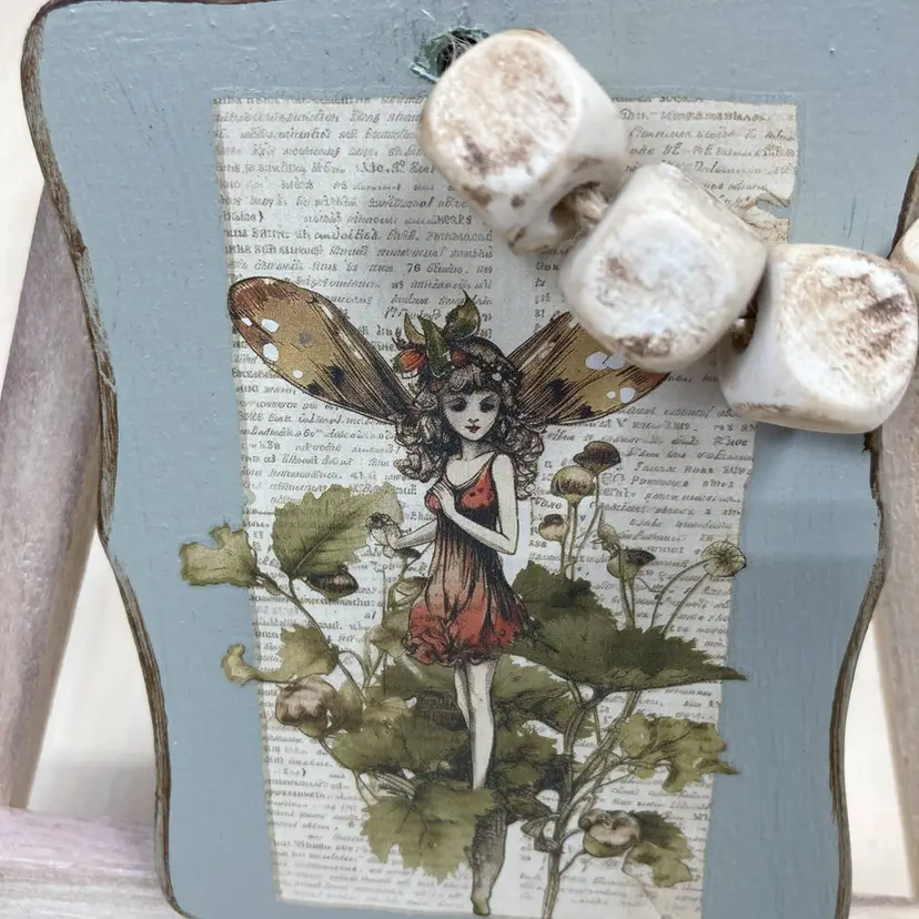 Merry Fairy Christmas Tree, Shelf or Wall Decor IOD Rub-On Transfer on Green Painted and Stained/Antiqued Wood Measures approximately 4.5 x 3.25 x .5" Jute Hanger with Antiqued White Square Wood Beads One-of-a-Kind Unique Christmas Tree Ornament or gift for that hard to buy for person. Hand made, Unique Farmhouse or Vintage Look Decor