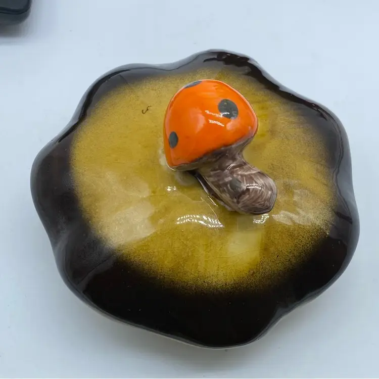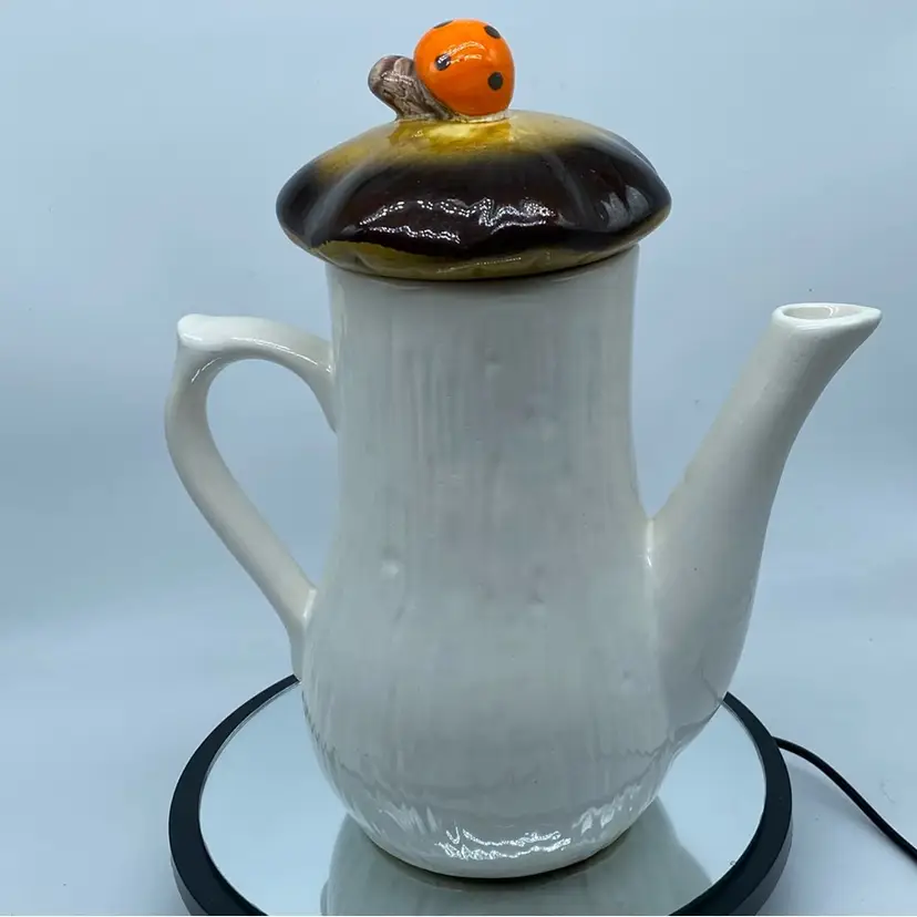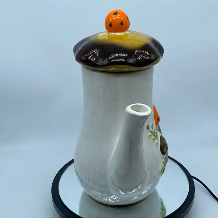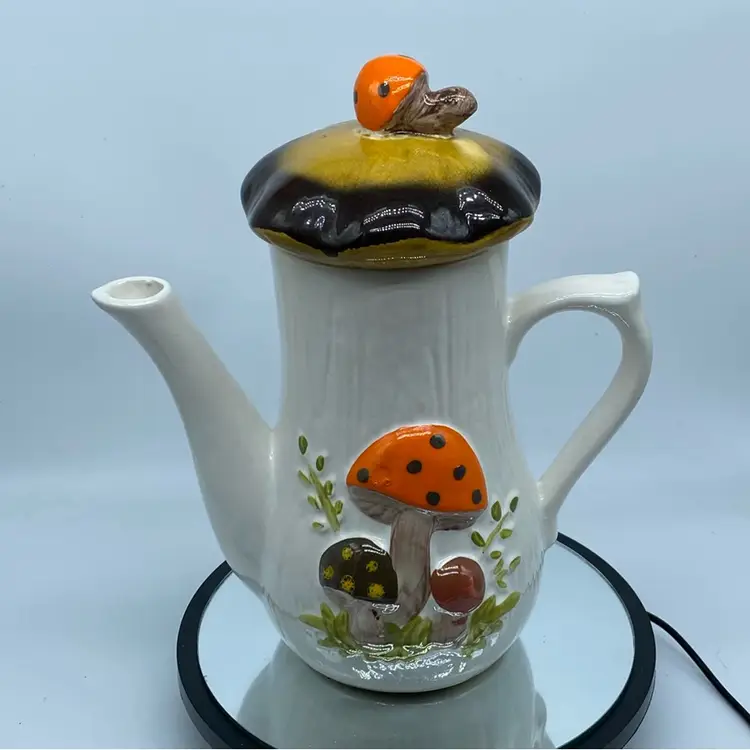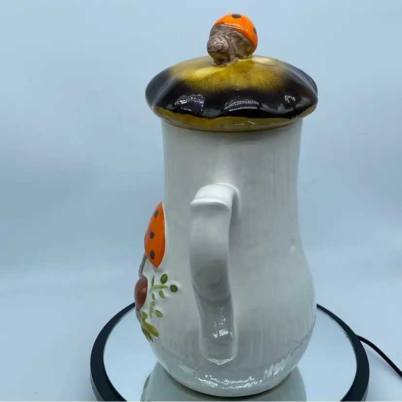 No chips or cracks 11 inch tall The 'Mushroom Mania' trend gained popularity in the 1960s and 1970s, influencing various aspects of design, including kitchenware. Ceramic coffee pots featuring mushroom motifs became a common sight in many households, reflecting the era's fascination with nature and whimsical aesthetics. These coffee pots were often hand-painted and mass-produced, making them accessible to a wide range of consumers.