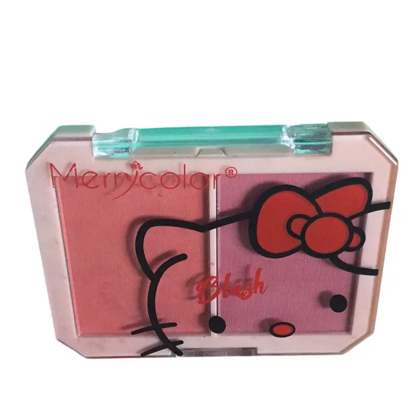 dual-color blush palette by Merrycolor featuring a Hello Kitty design. Here's some additional information: Product: Dual-color blush palette Brand: Merrycolor Design: Features Hello Kitty, a popular character created by Sanrio. Hello Kitty is a global marketing phenomenon. Colors: The palette includes two shades of blush, a lighter peach and a darker pink