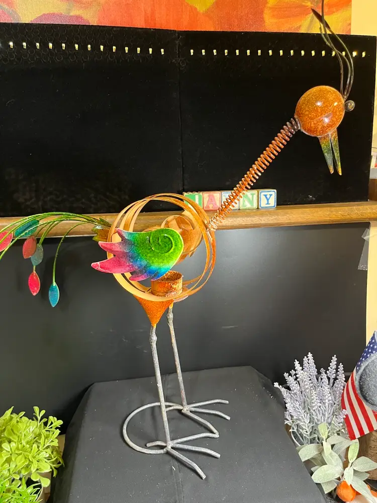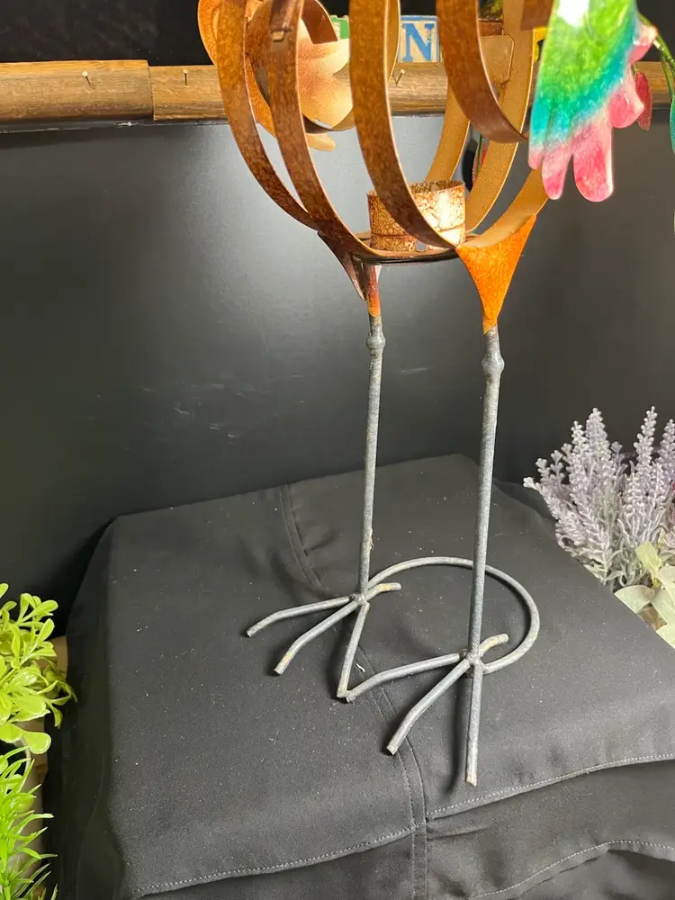This is so cute. Kitsch....The tail feathers are removable. He is a lanky fellow. But O so darling. No call outs. Is in good pre loved condition. From top of head feather to feet he stands approx 22.5" With tail feathers attached 18" W, 6" Deep, 1 1/4 Lb. He will ship alone.