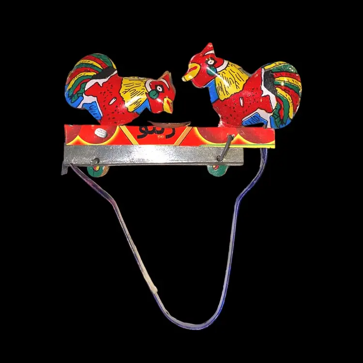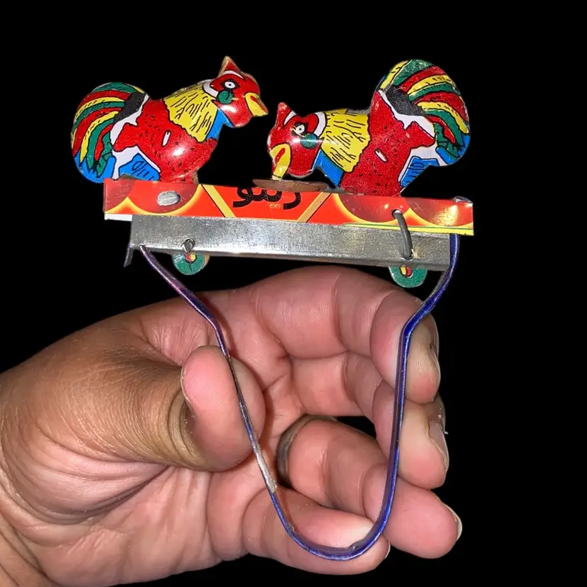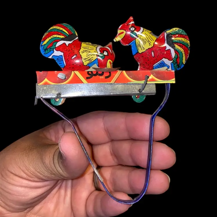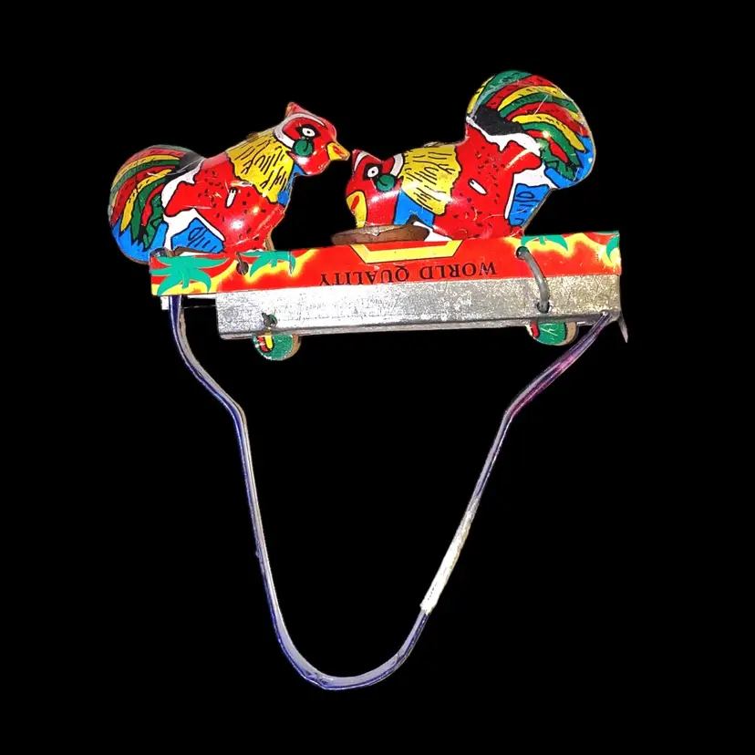 •metal (aluminum?) chicken toy where you squeeze the metal at the bottom and release, causing the chickens to take turns pecking the feed bowl in the middle •has some minor scratching/wear, feed bowl looks rusted
