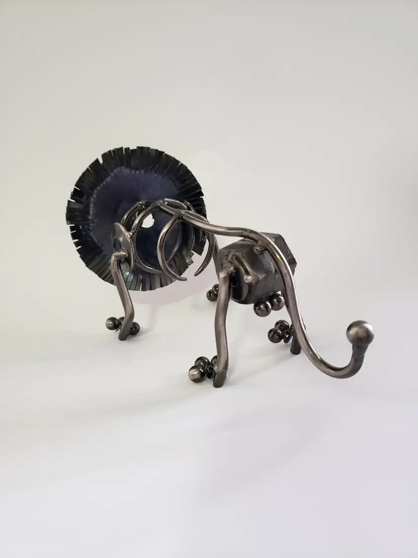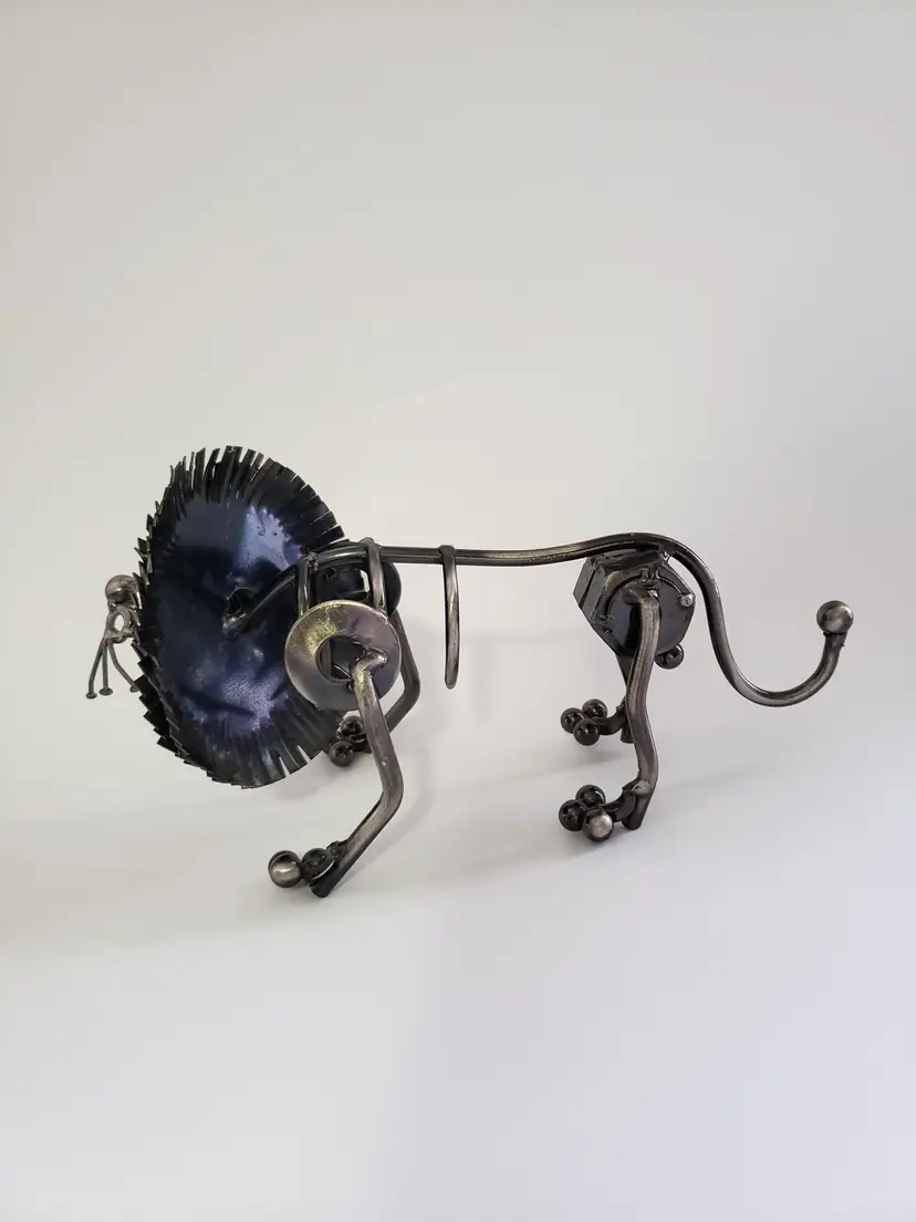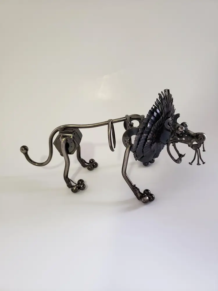 Very well made metal lion statue. He is made of nuts, bolts, nails, ball bearing, washers and other metal pieces welded together and is just so darn cool. Roughly 9in from nose to tail, about 6in tall to the top of his mane. Great condition, no missing parts.