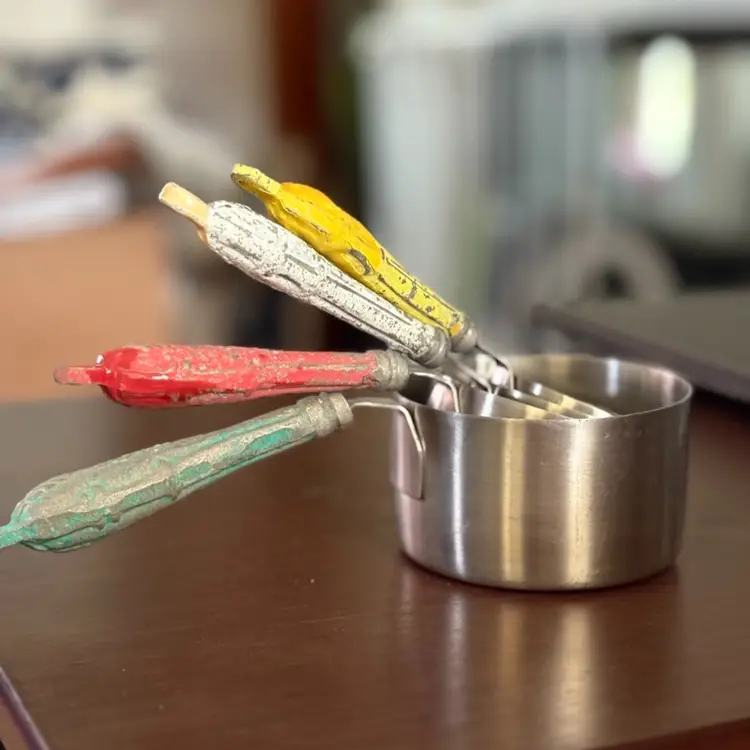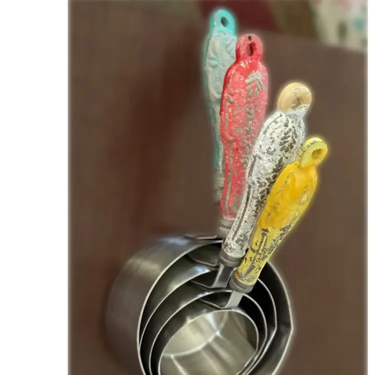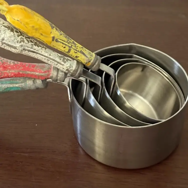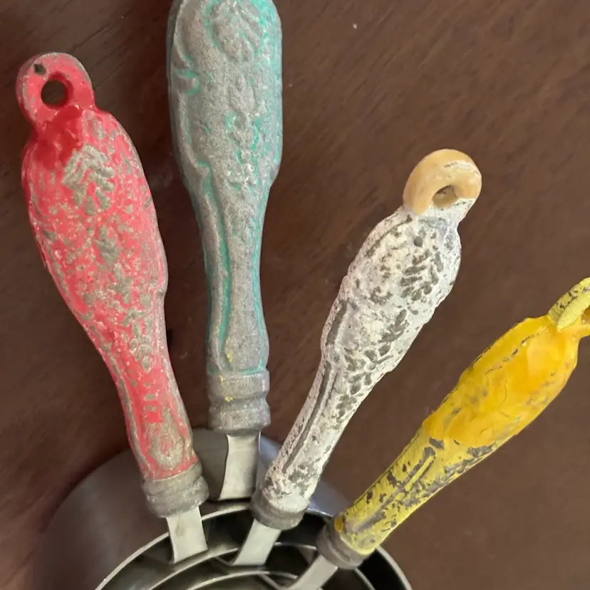 4 metal measuring cups with distressed handles. Please see the pictures of the handles. Beautiful washed out colors that make me want to go to the beach and make sandcastles with these cups