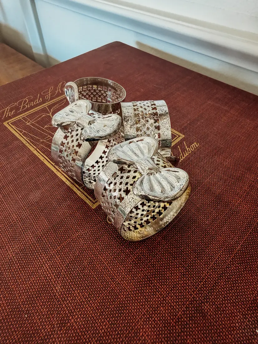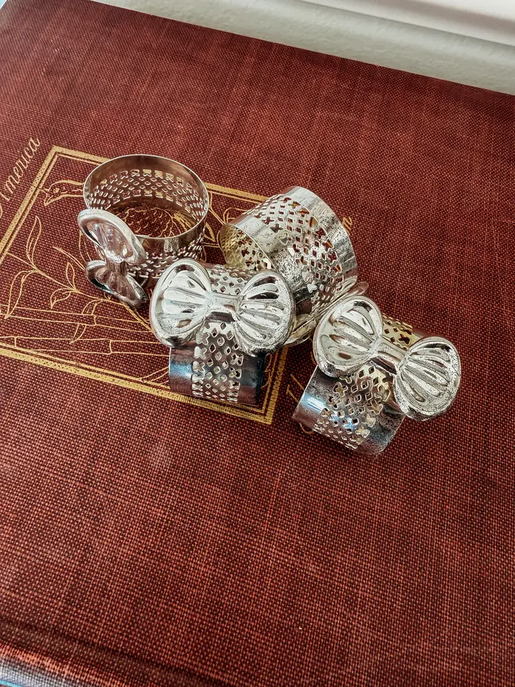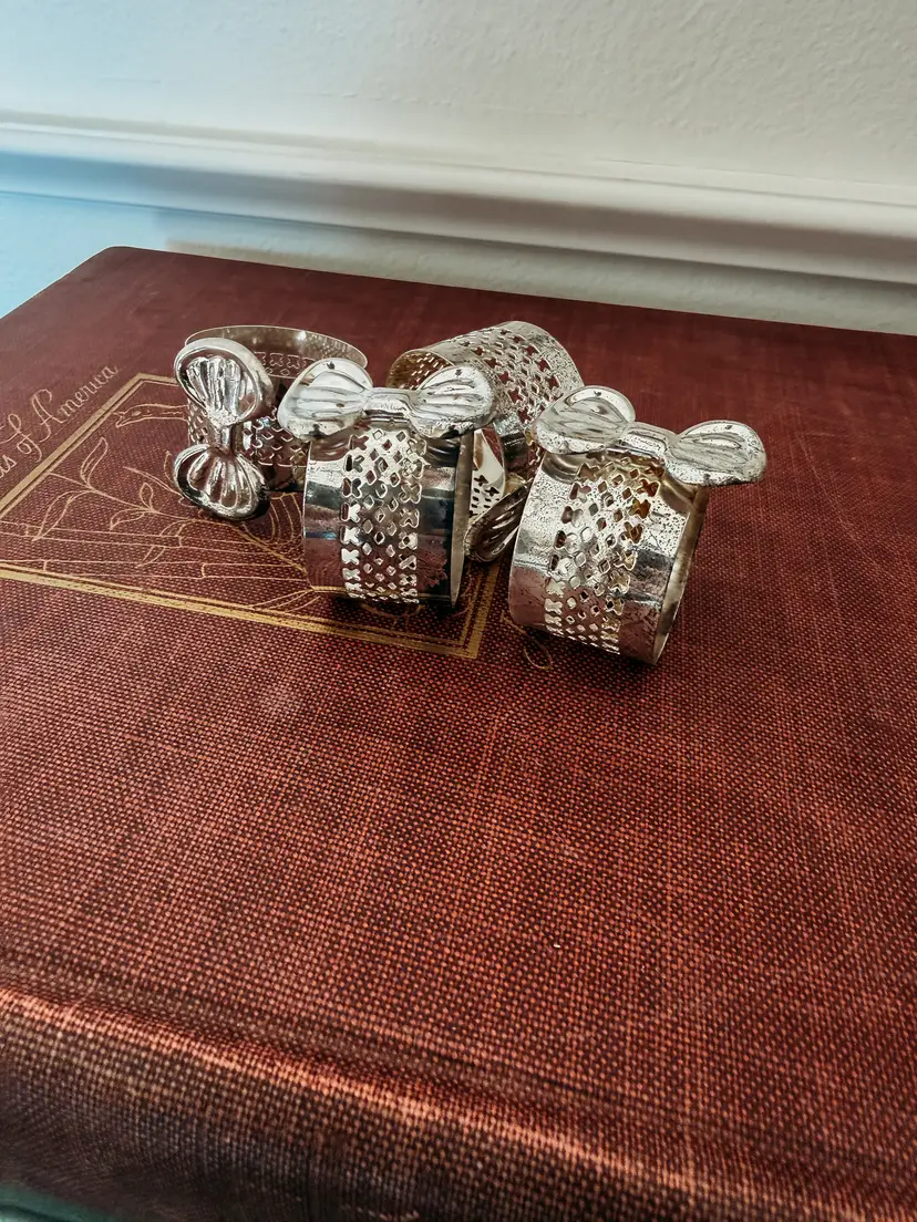 set of 4 silver plate napkin rings. These were sourced brand new in the box, but there is some discoloration/tarnish on all 4 which could be easily buffed/polished.