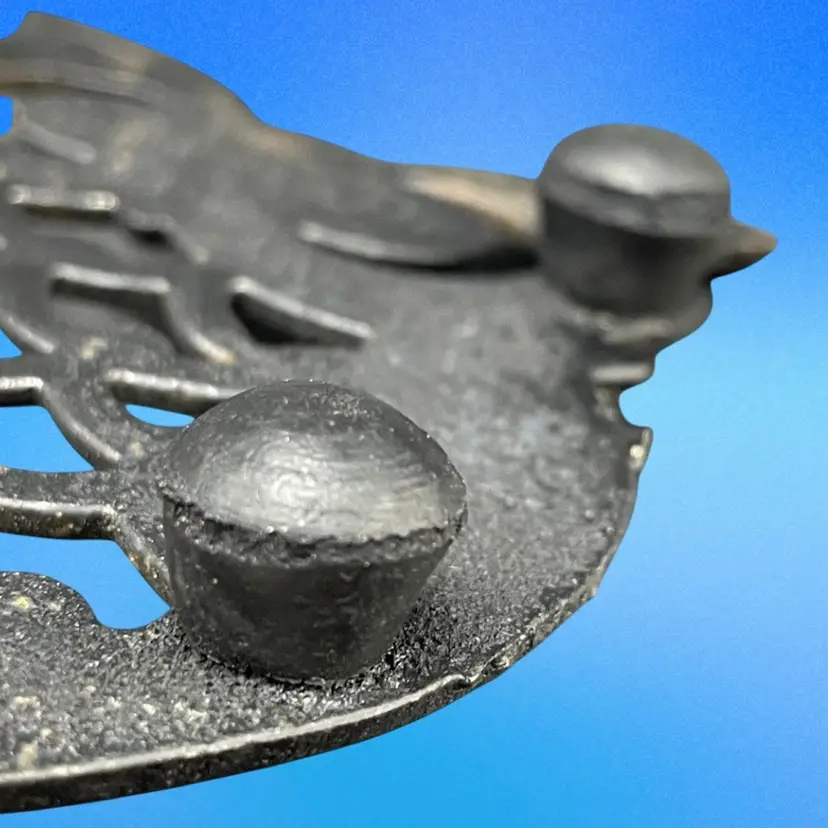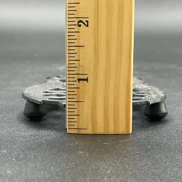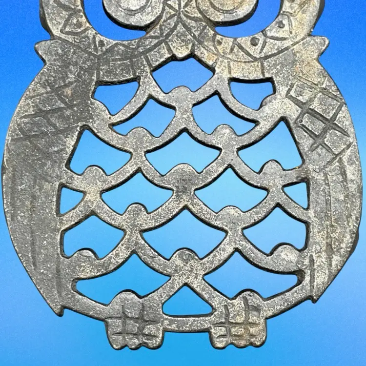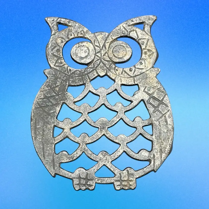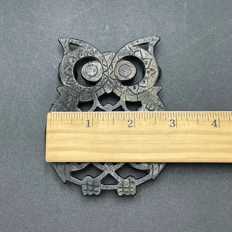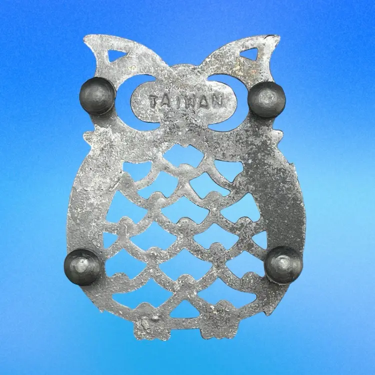 This is a small vintage metal owl footed trivet or coaster. Made in Taiwan. Measures approximately .5" tall x 3" wide x 3.5" long. There is some wear to the paint as shown in pictures. No other major flaws.