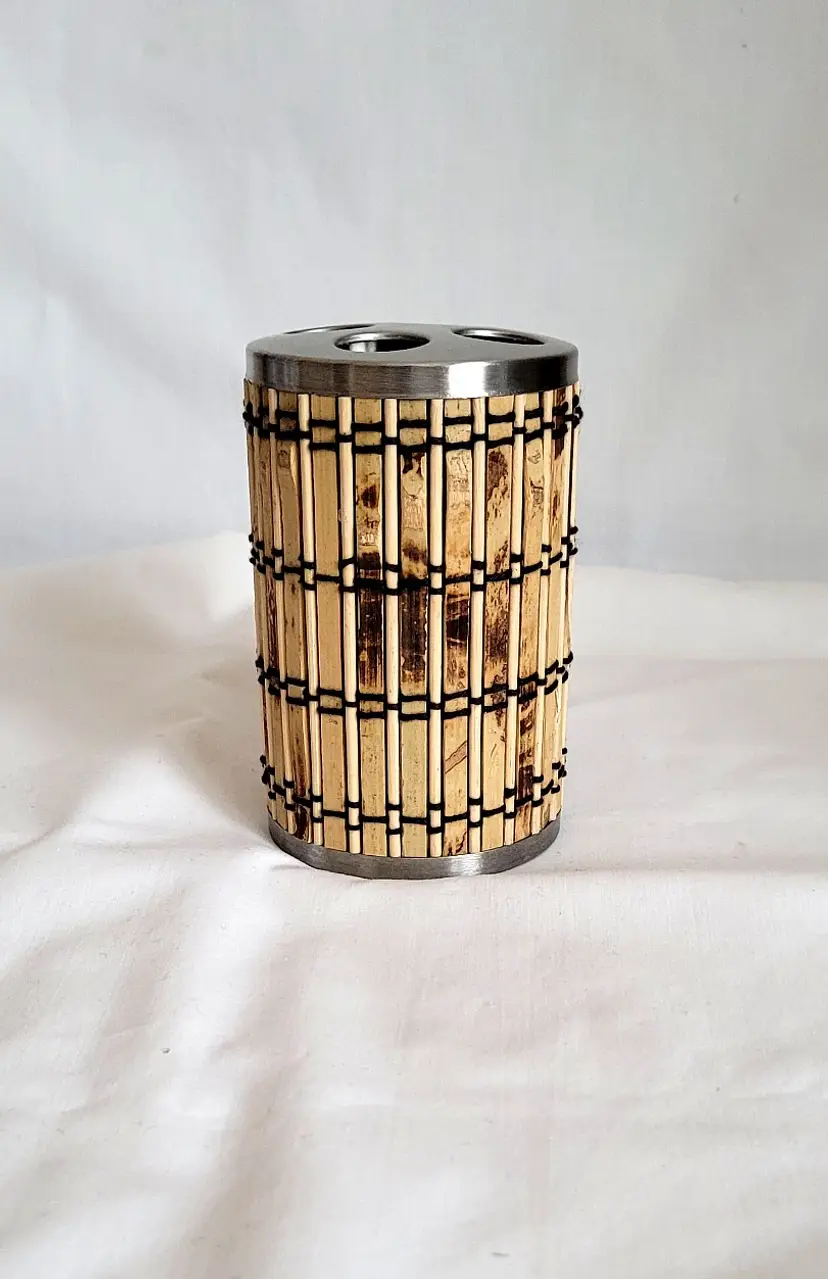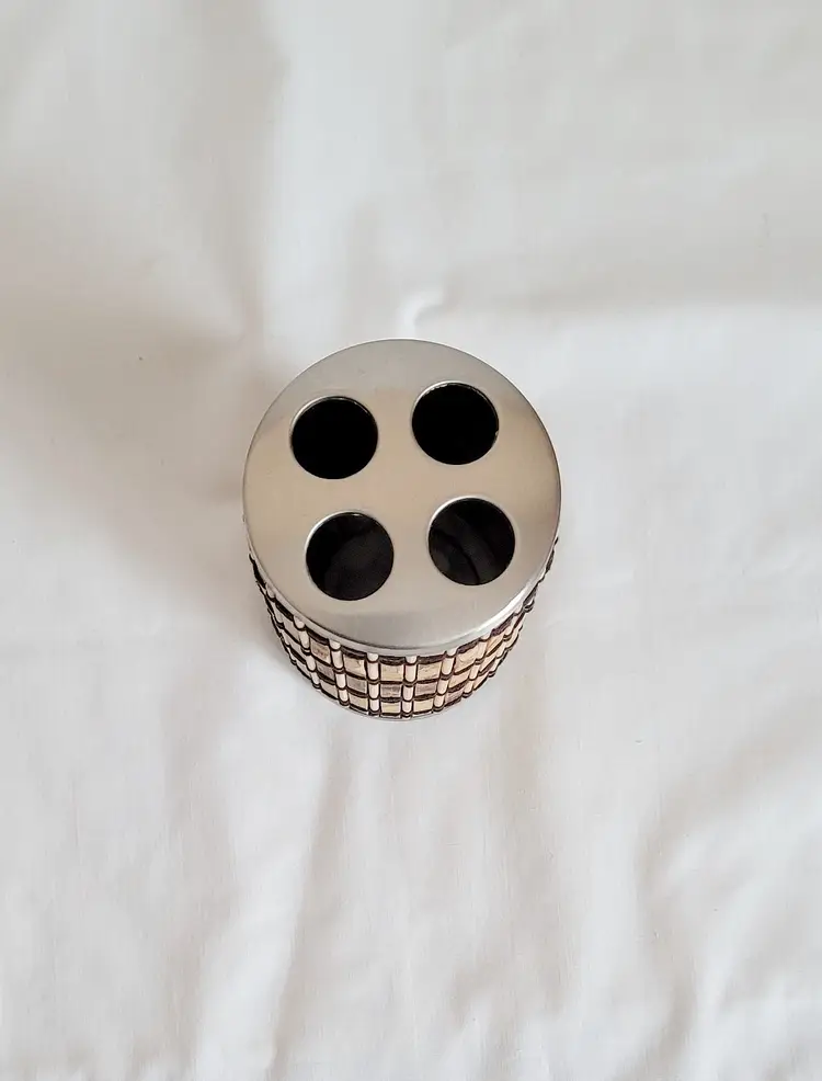 All‑metal toothbrush holder featuring a bamboo‑inspired design. It includes four evenly spaced holes to keep toothbrushes upright and organized. Compact at 4 inches tall, it’s a durable and stylish addition to any bathroom counter.