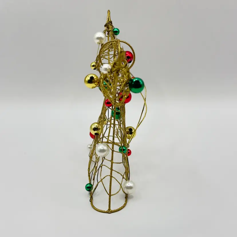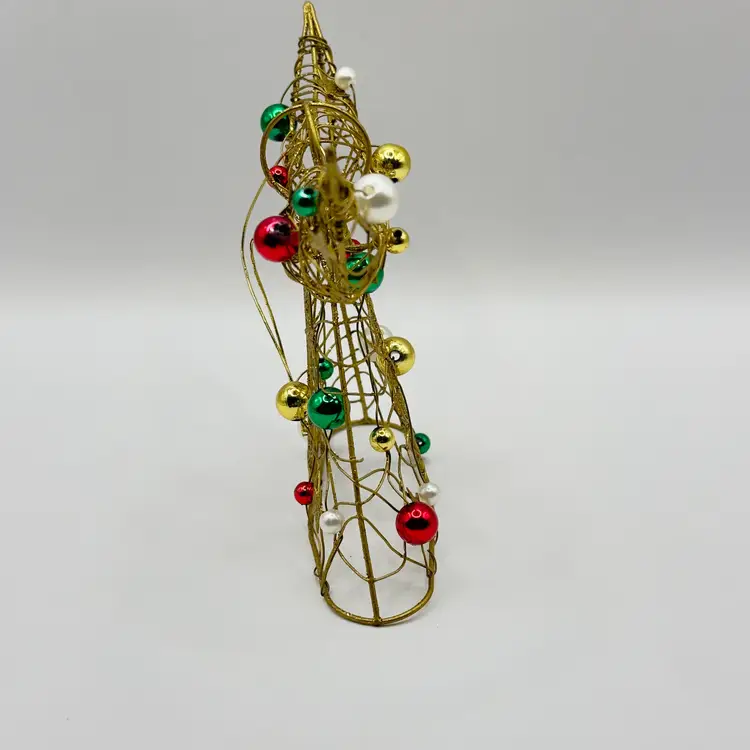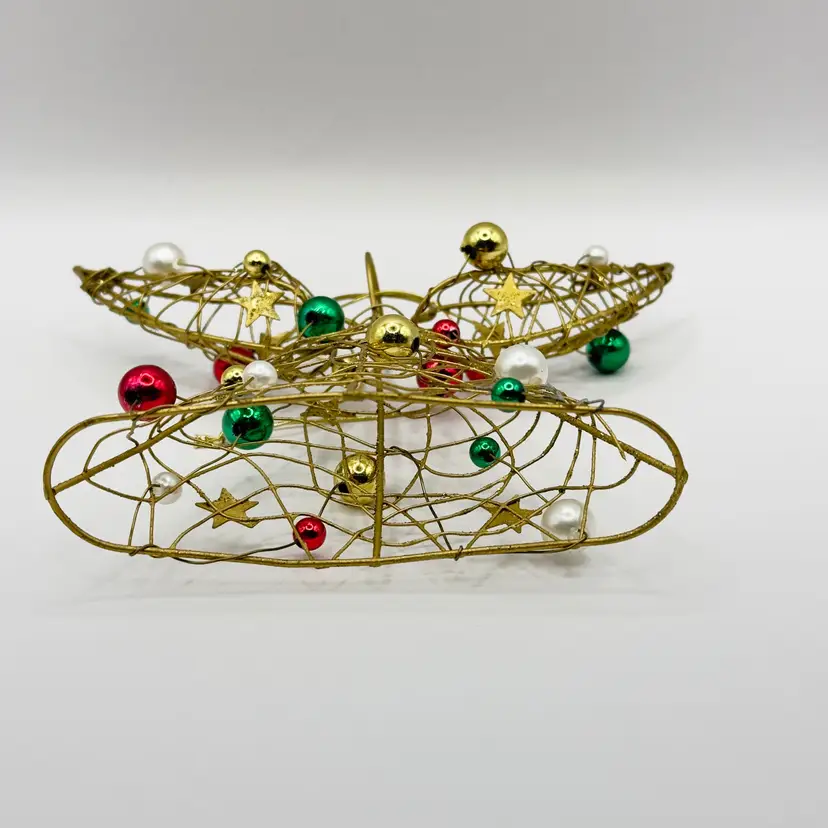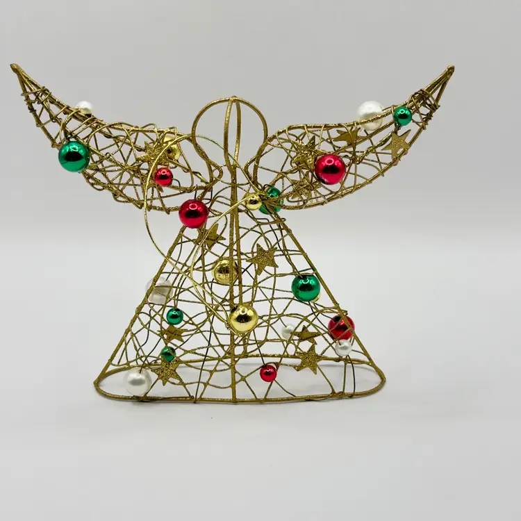 Add a touch of elegance to your holiday decor with this wire angel decoration. Adorned with colorful ornaments and golden accents, it's perfect for bringing festive cheer to any space. Ideal for collectors or as a unique gift. Excellent condition. Measures 5.5x4.5 inches. Weighs 6oz.