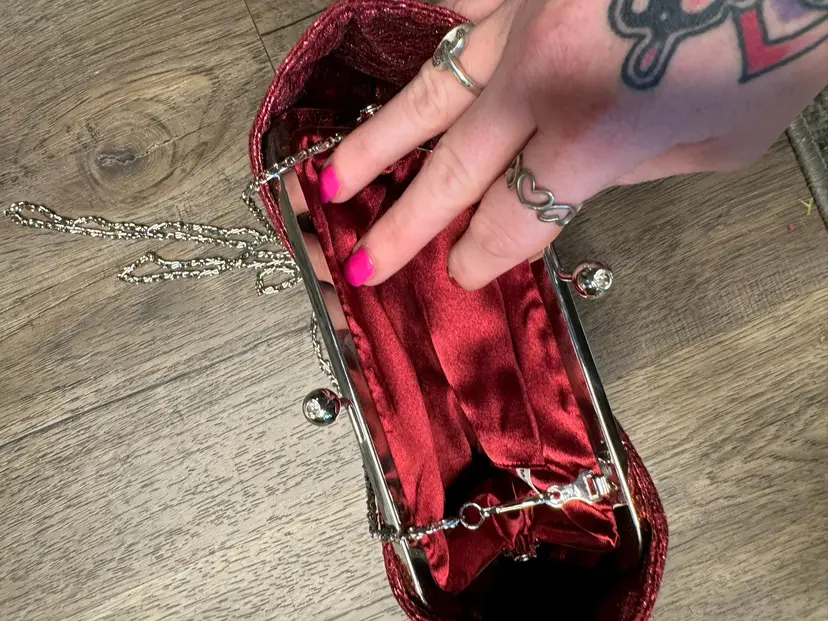 This rectangular purse is of the clutch design but it also has a silver chain shoulder strap. It is a red metallic fabric.