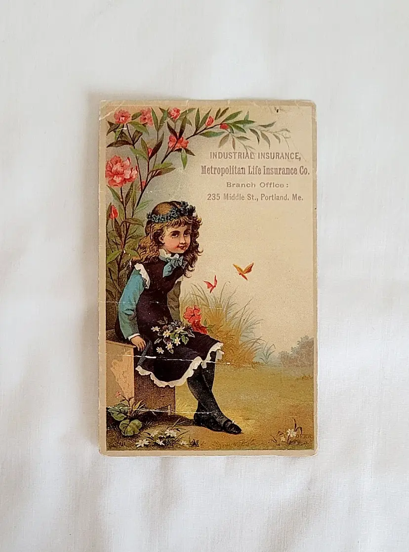 Vintage Metropolitan Life Insurance trade card featuring a colorful Victorian‑style illustration of a young girl in a garden. Issued for the Portland, Maine branch. Card shows age‑appropriate wear, including several crease lines on the front that are not visible in the photo, but the artwork still displays well.