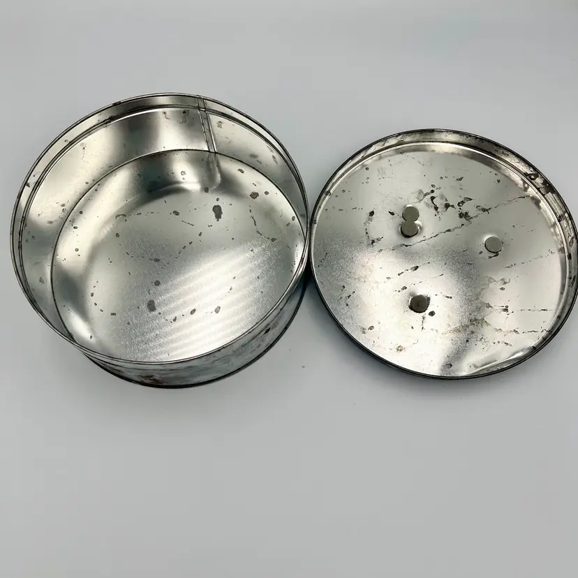 Good vintage condition. Several rust spots, other distressing. Small dent on lid. SEE PHOTOS
