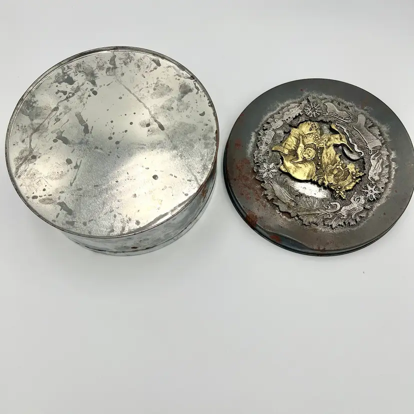 Vintage Metzke Pewter-on-Tin Christmas Collectible Tin Container