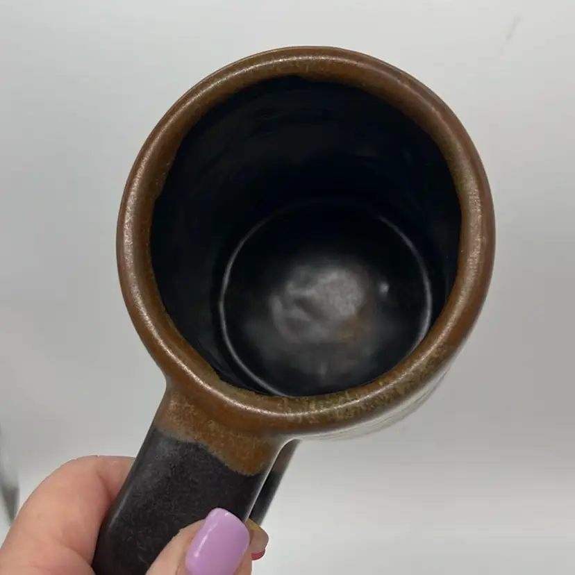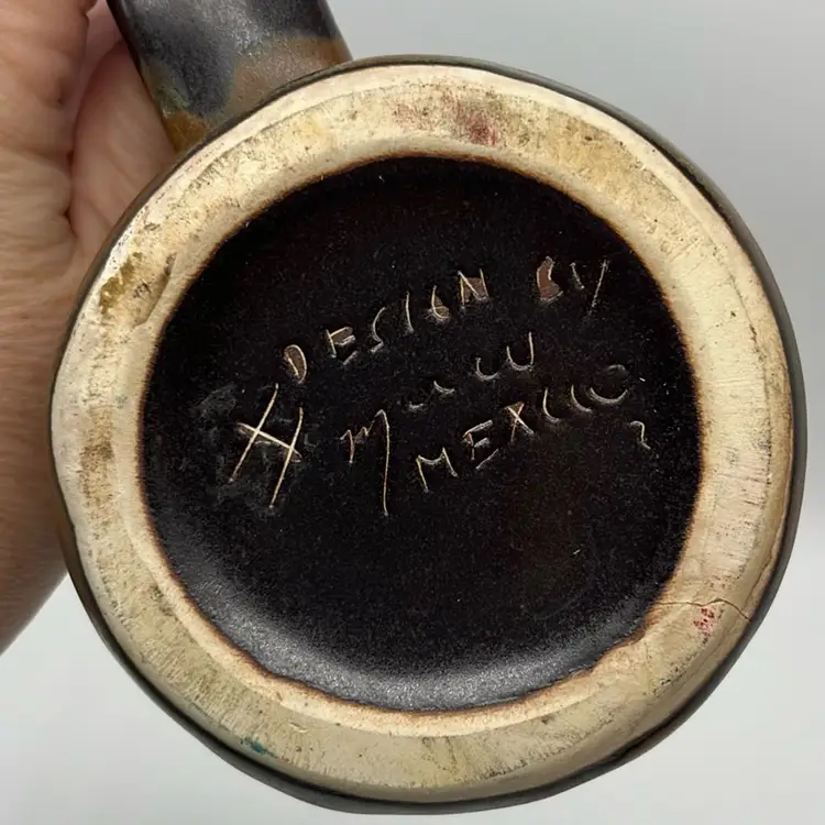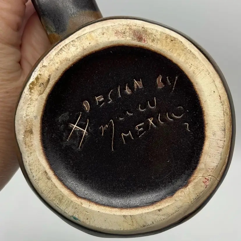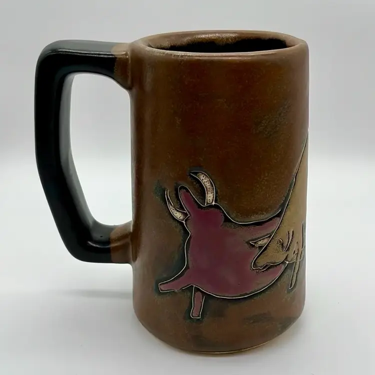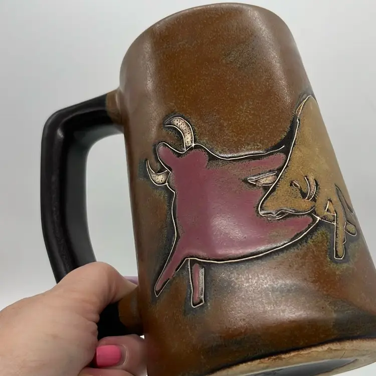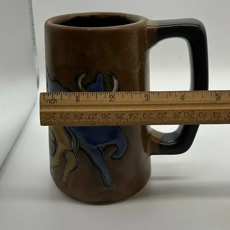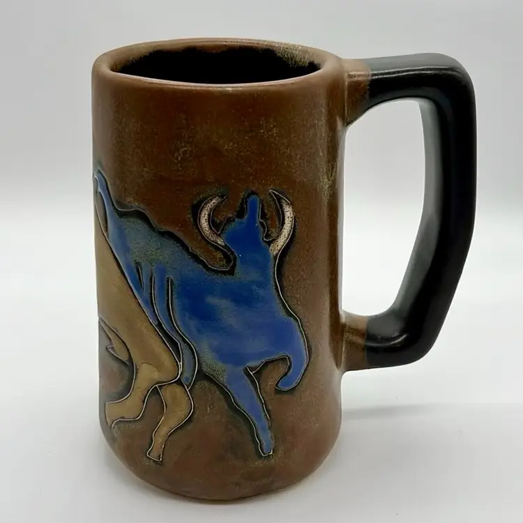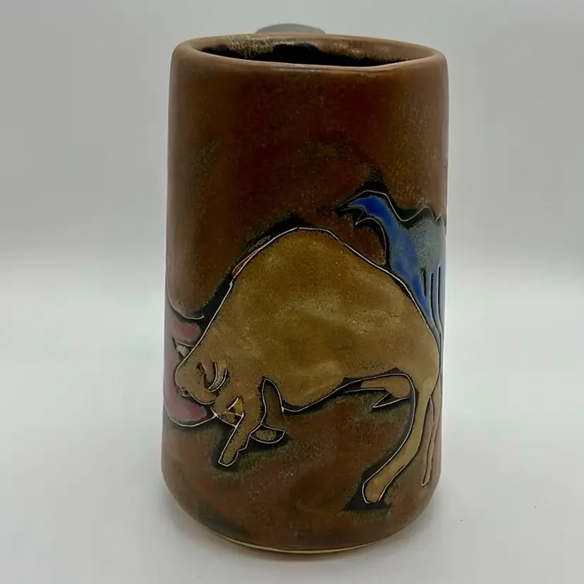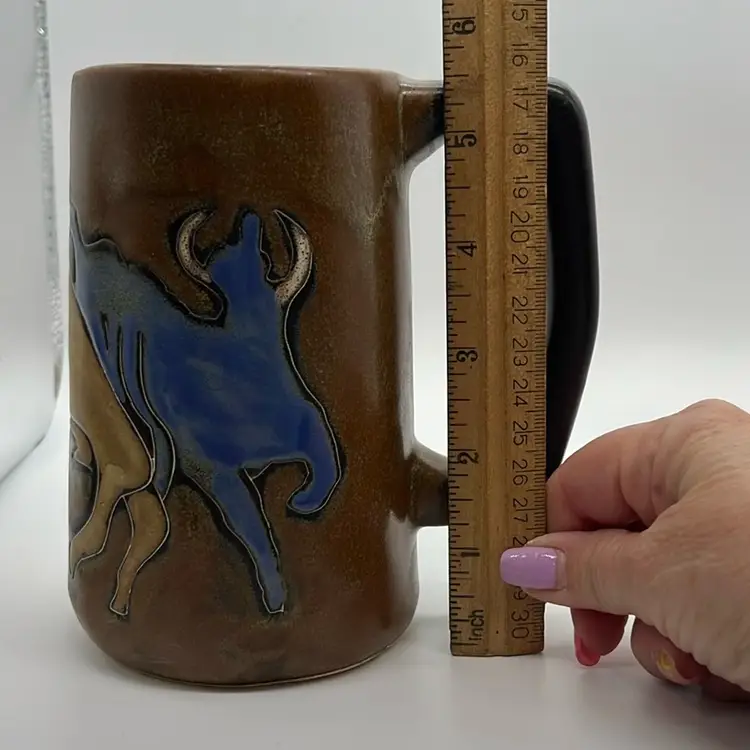 Excellent condition! Nice solid heavy mug. Blue, Tan and Red Bulls. No chips or cracks. Approx: 5.5” h x 5.25” w with handle 2.5” d