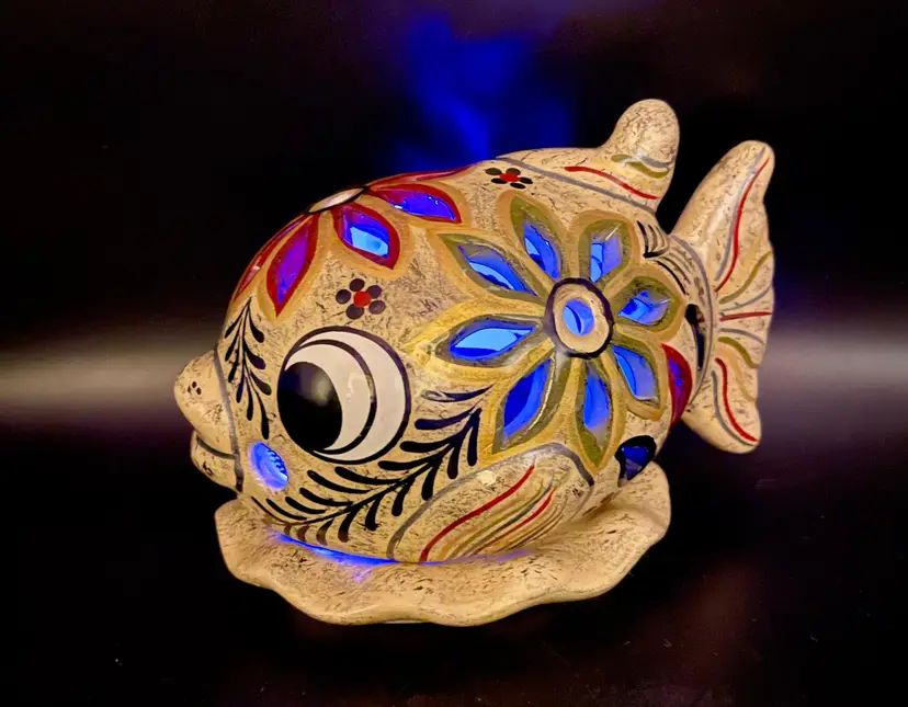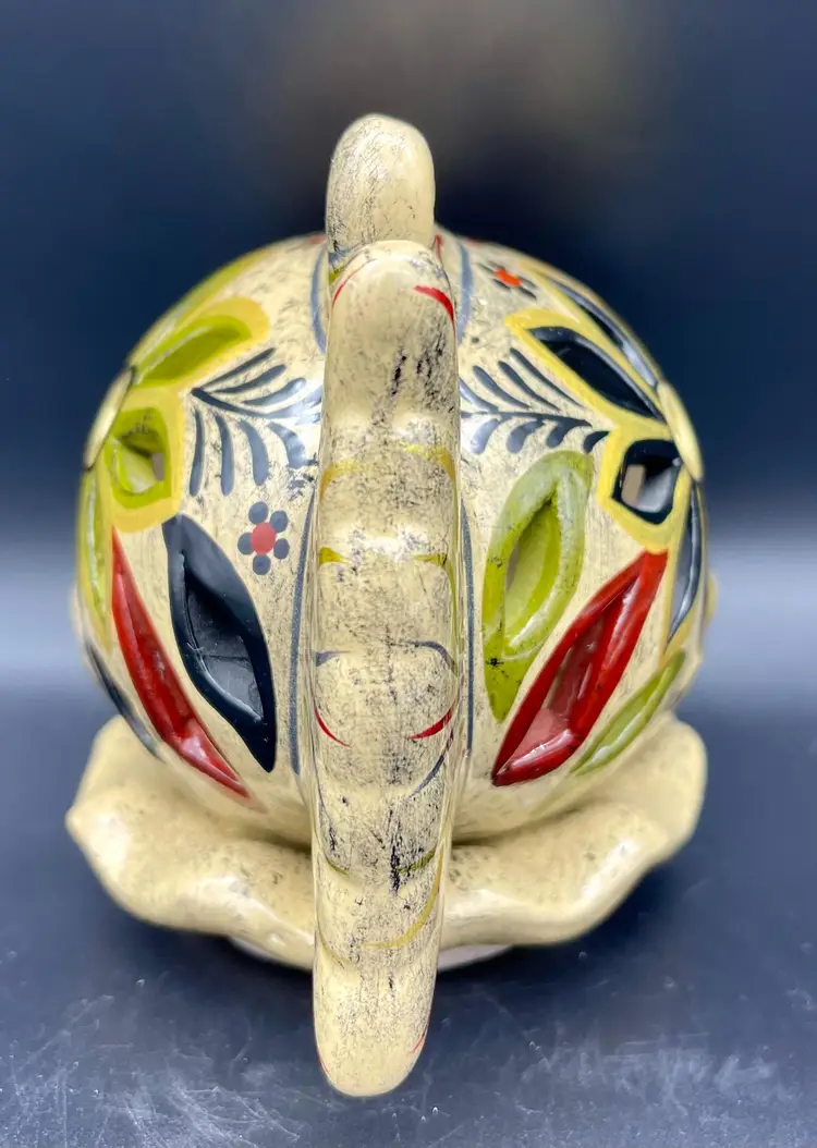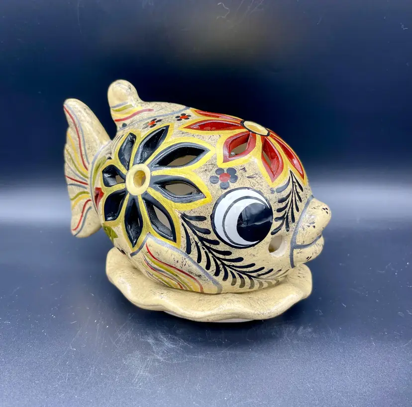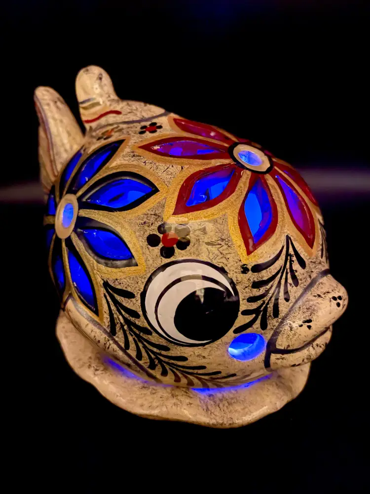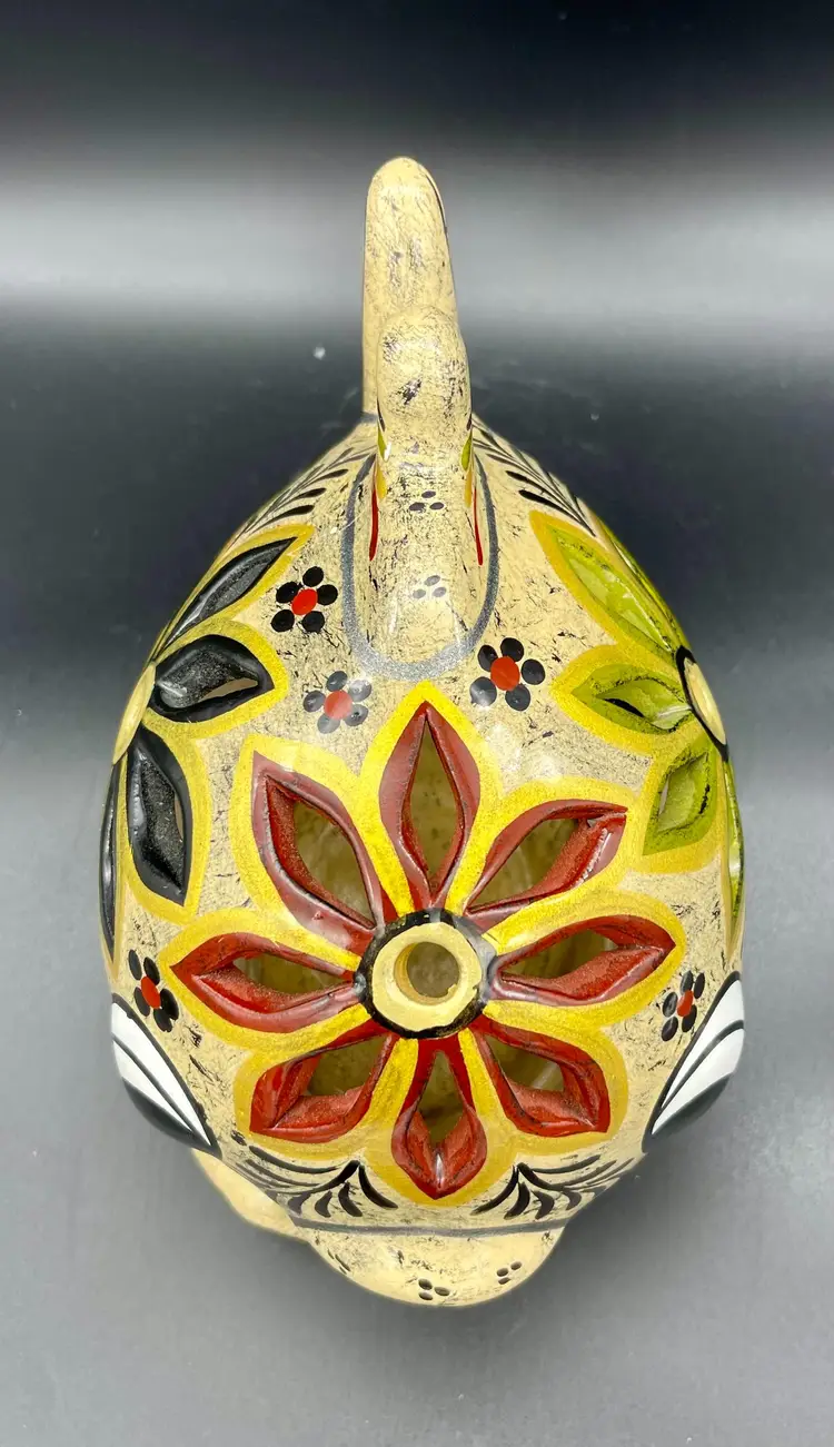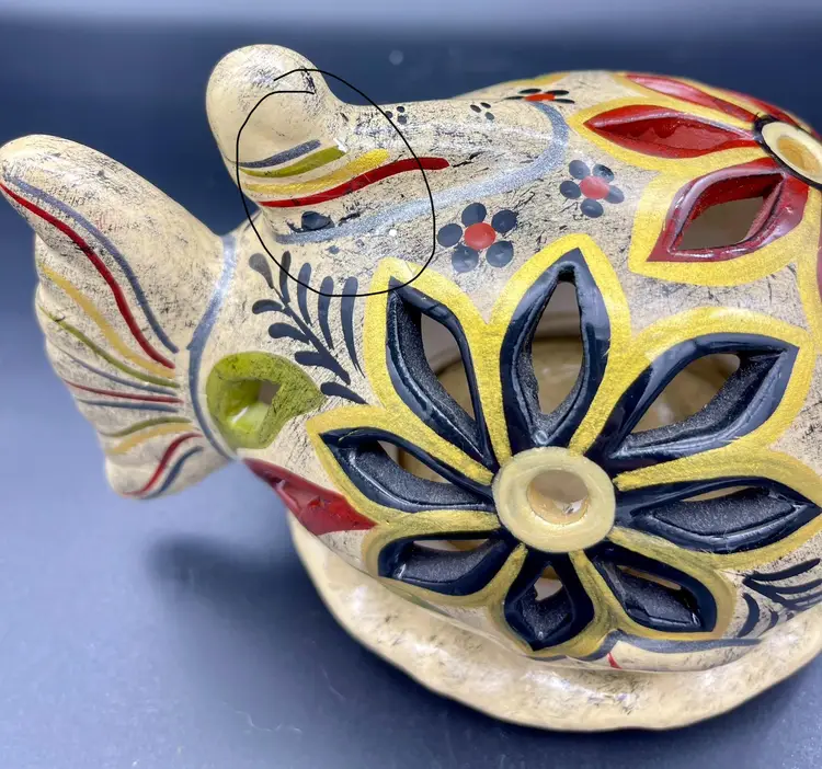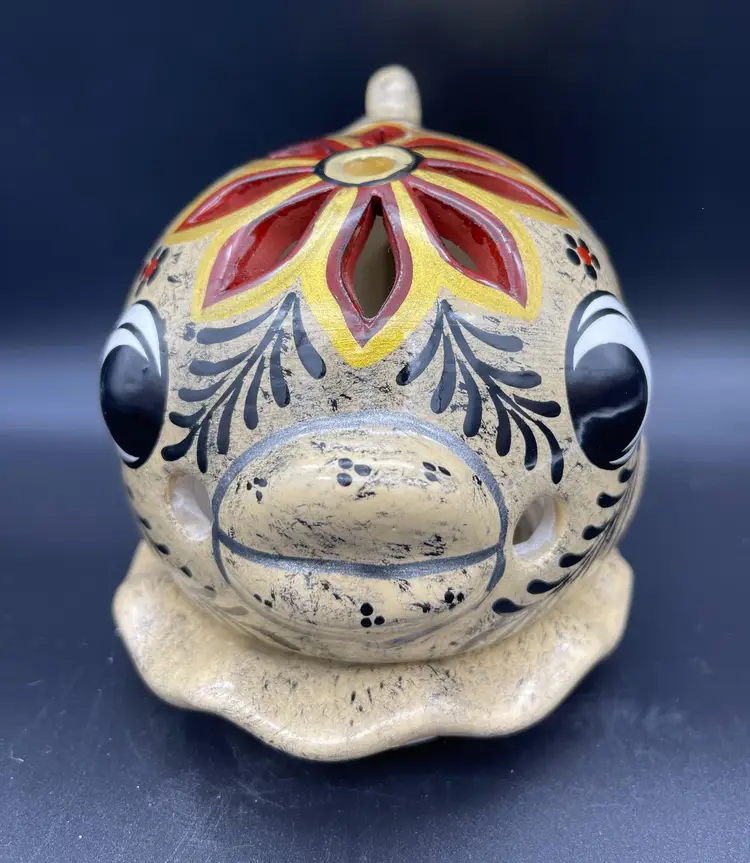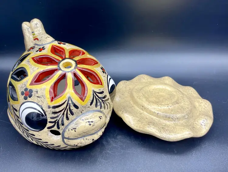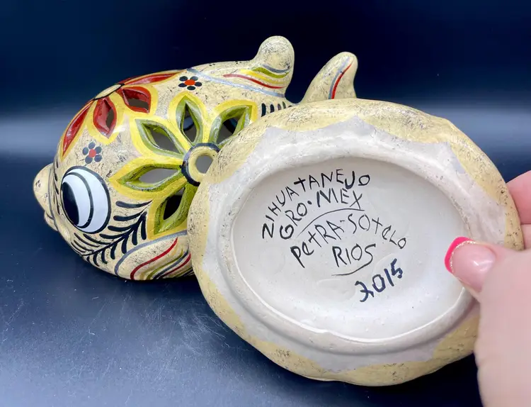 Gold and silver metallic paint details. (2pcs) Excellent pre-owned condition. No chips, cracks. 2 small imperfections in glaze as pictured. Marked: Zihuatanejo GRO.MEX Petra-Sotelo Rios 2015. Dimensions: 7" W (tail to lips) x 5" H x 4.5" at base