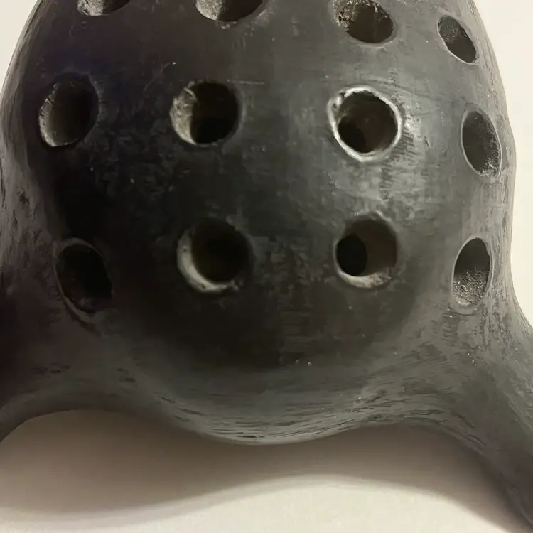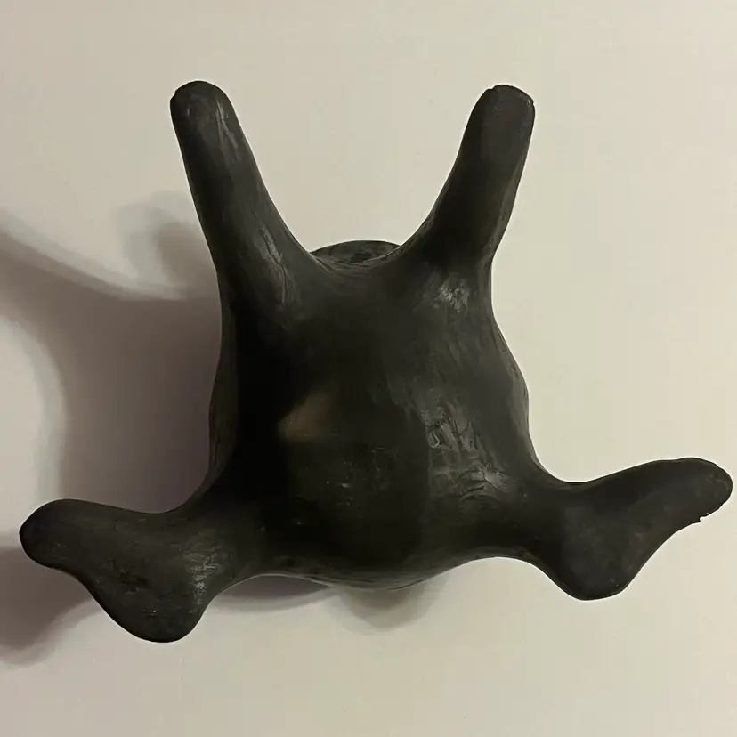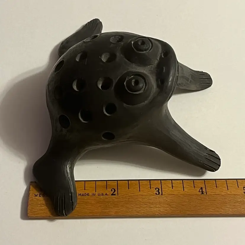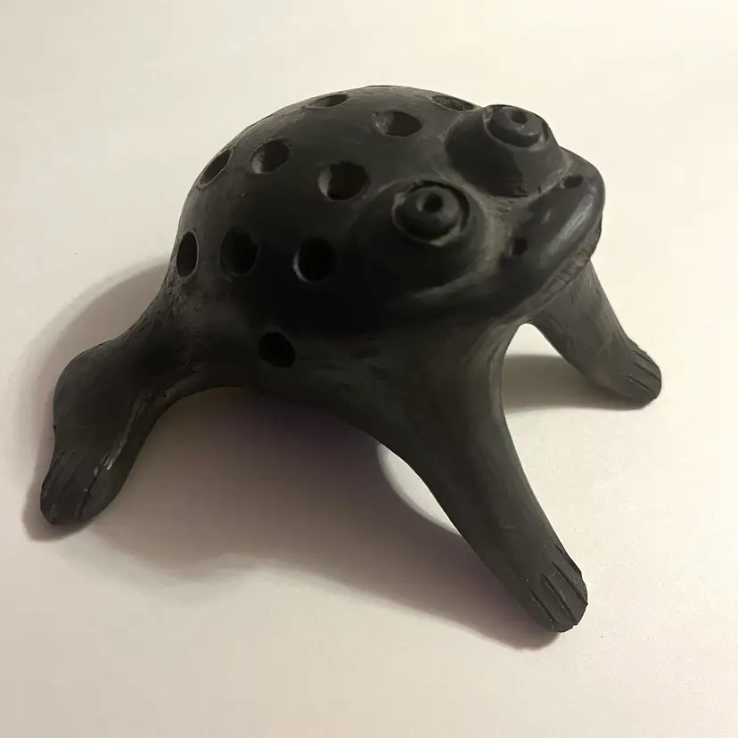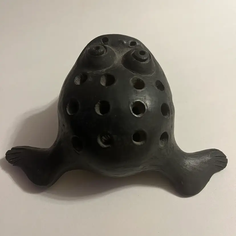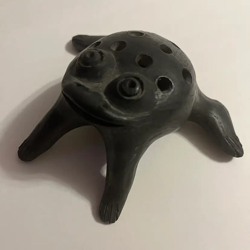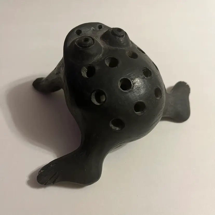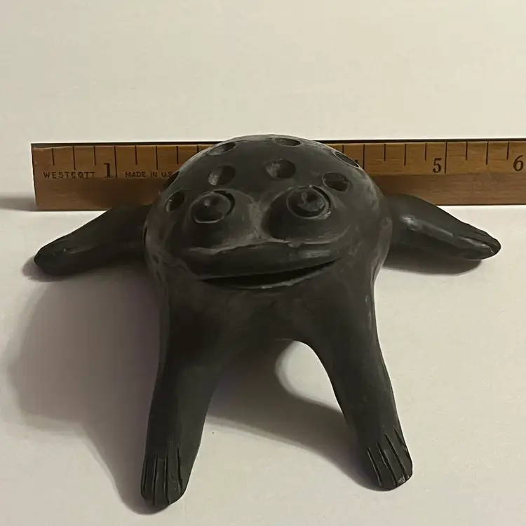 Handcrafted in Oaxaca, Mexico, this vintage black clay figural frog flower frog measures approximately 4.5" long, 5.5" wide, and 2.5" high. Hand sculpted in traditional barro negro (black clay), the frog features a matte finish and expressive folk styling, with 13 holes designed to hold floral stems or serve as a holder for incense or as a decorative accent.