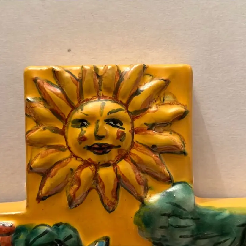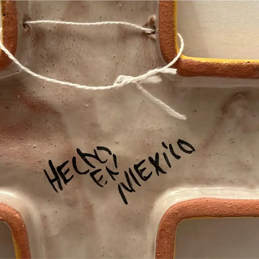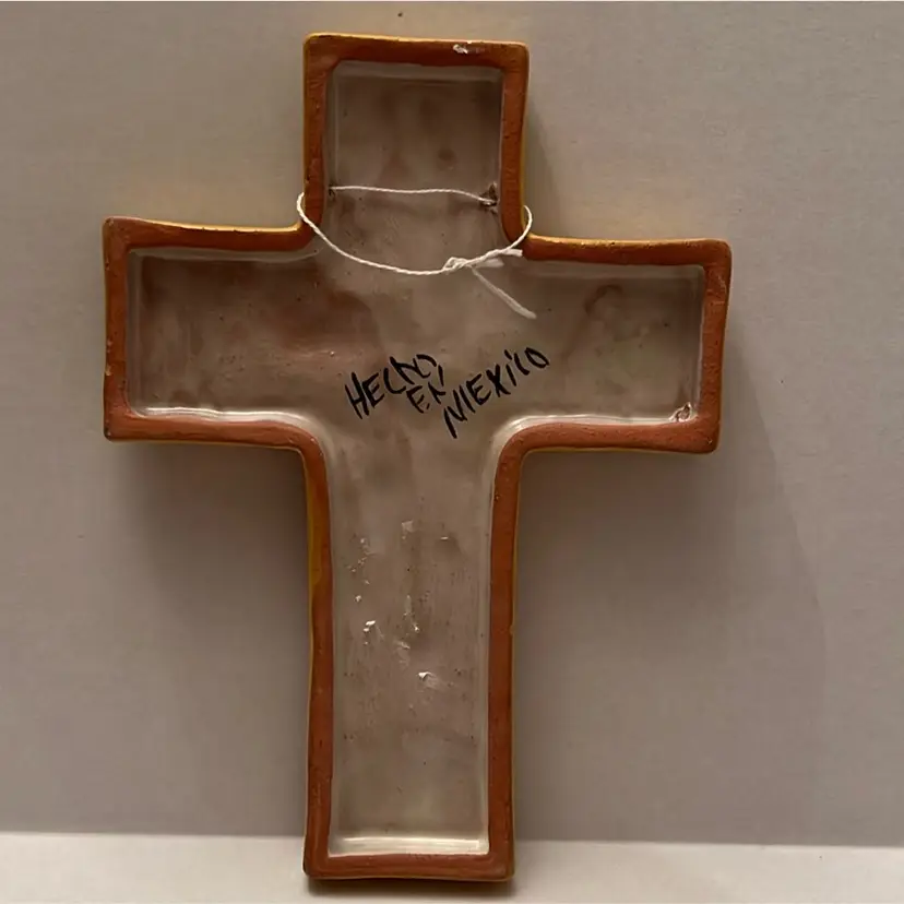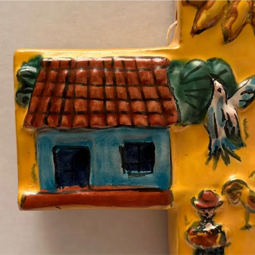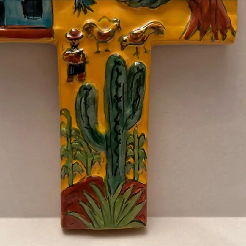 This cross is hand painted with raised pictures of Mexican landscape. Great addition to add to any home decor.9.5” Tall by 7”wide.