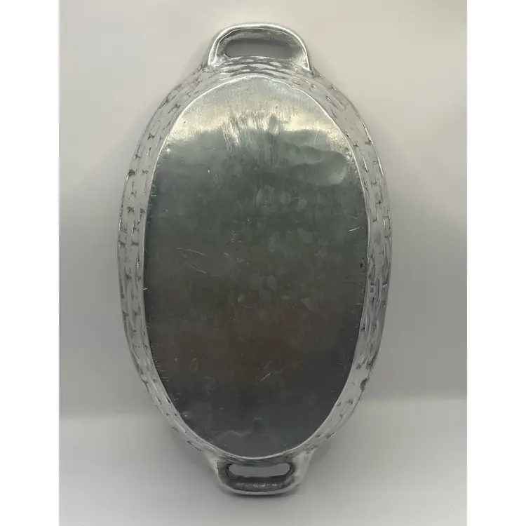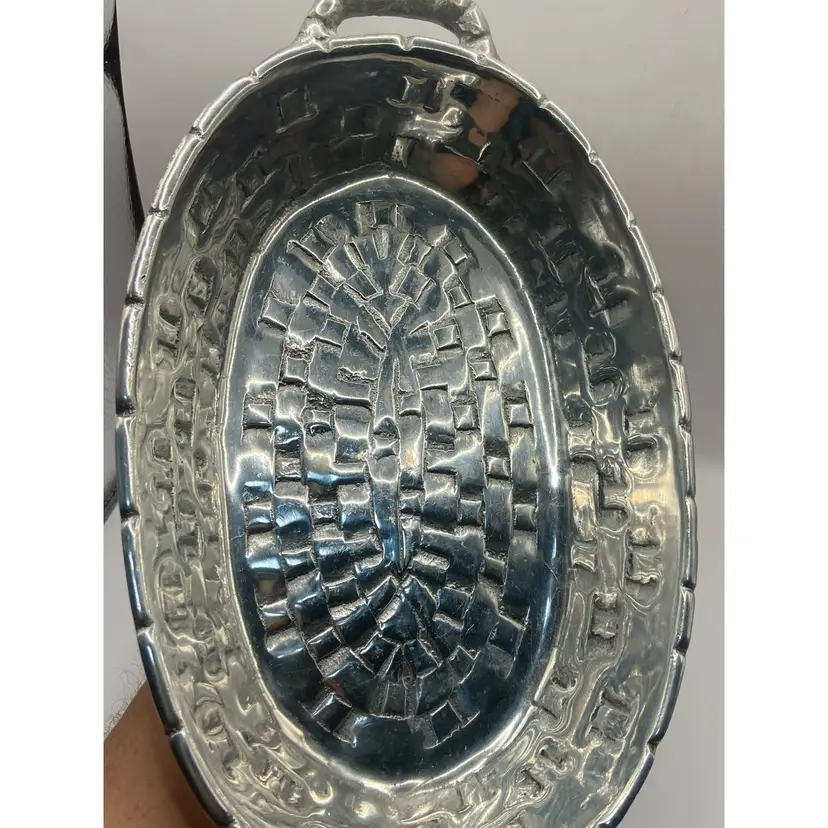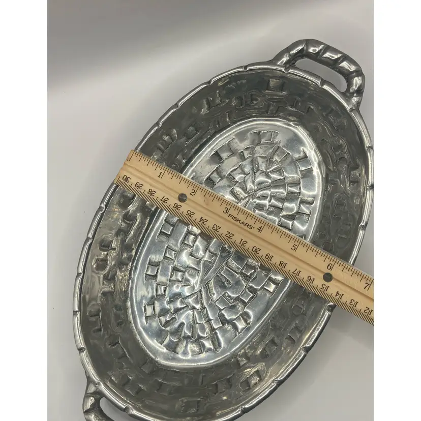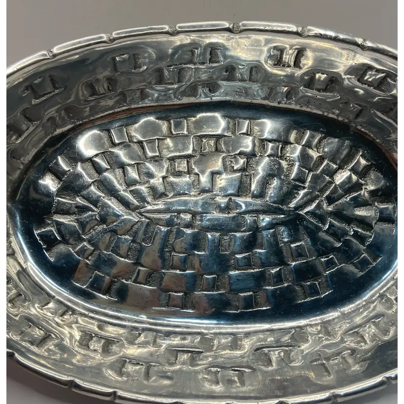 This pewter basket is adorable and perfect to use for a catch-all, display piece, platter, or decor. It has a polished bottom and in good condition.