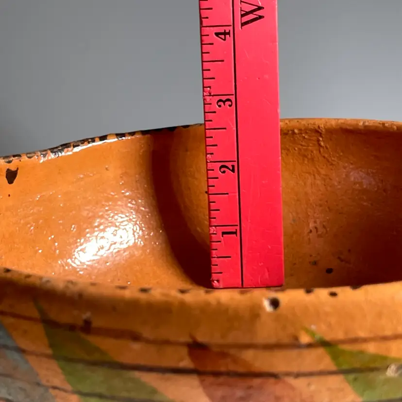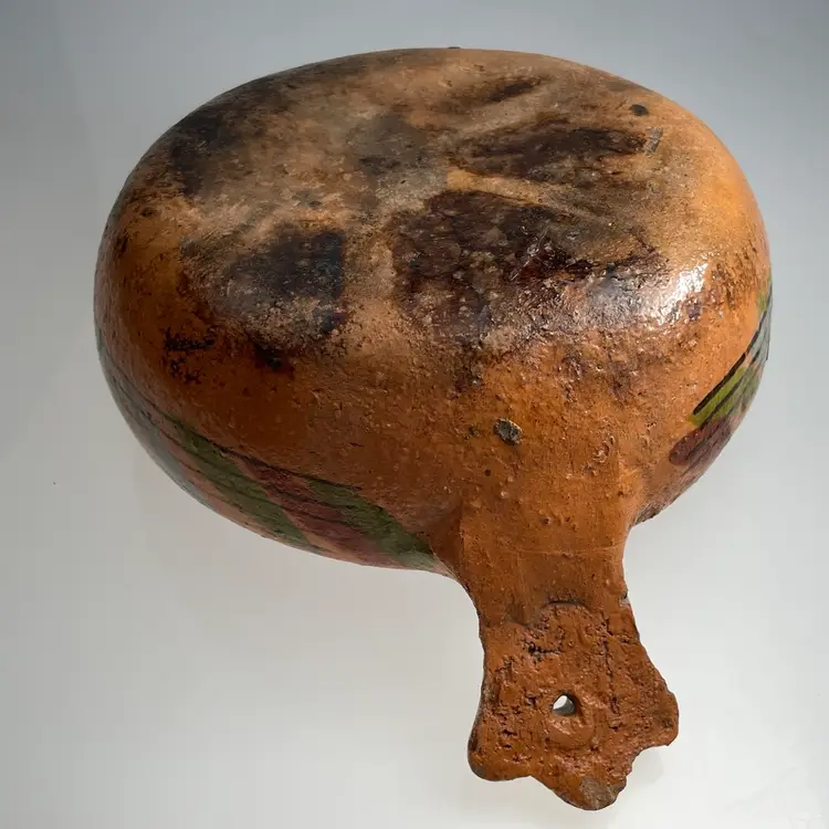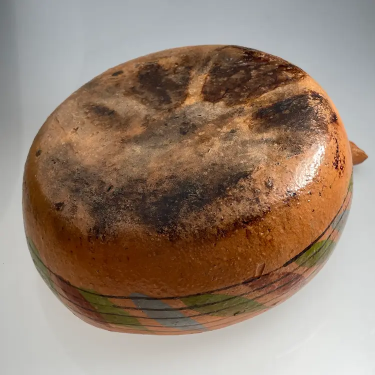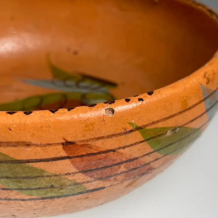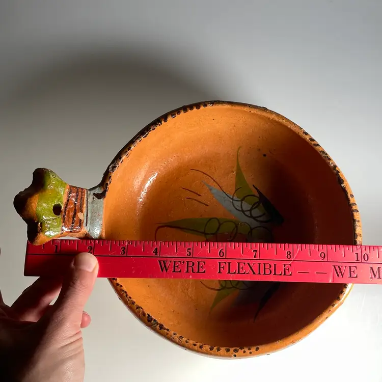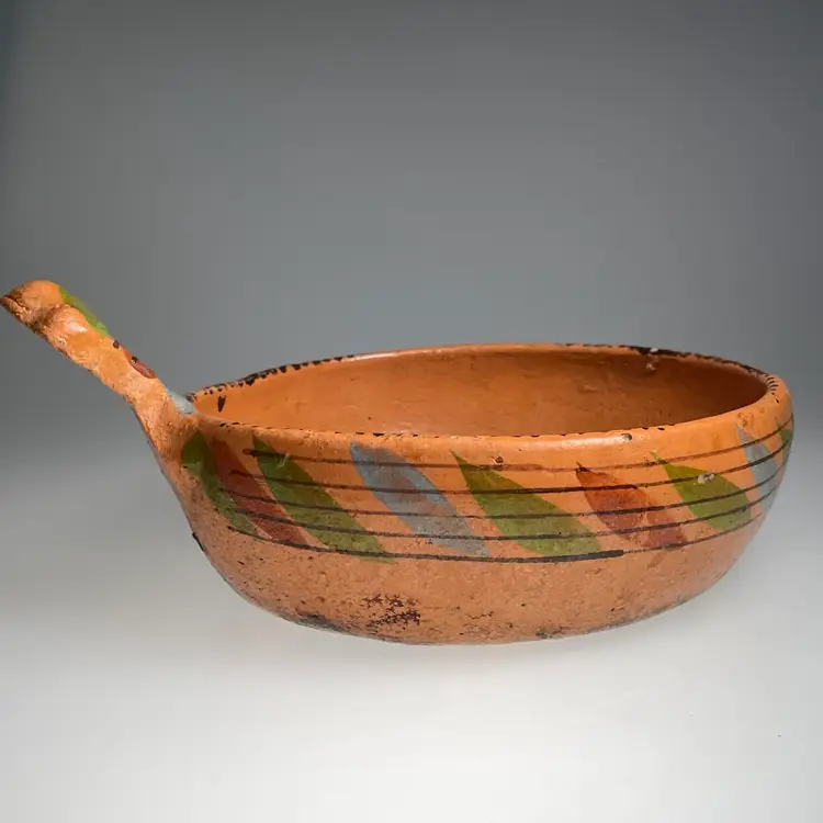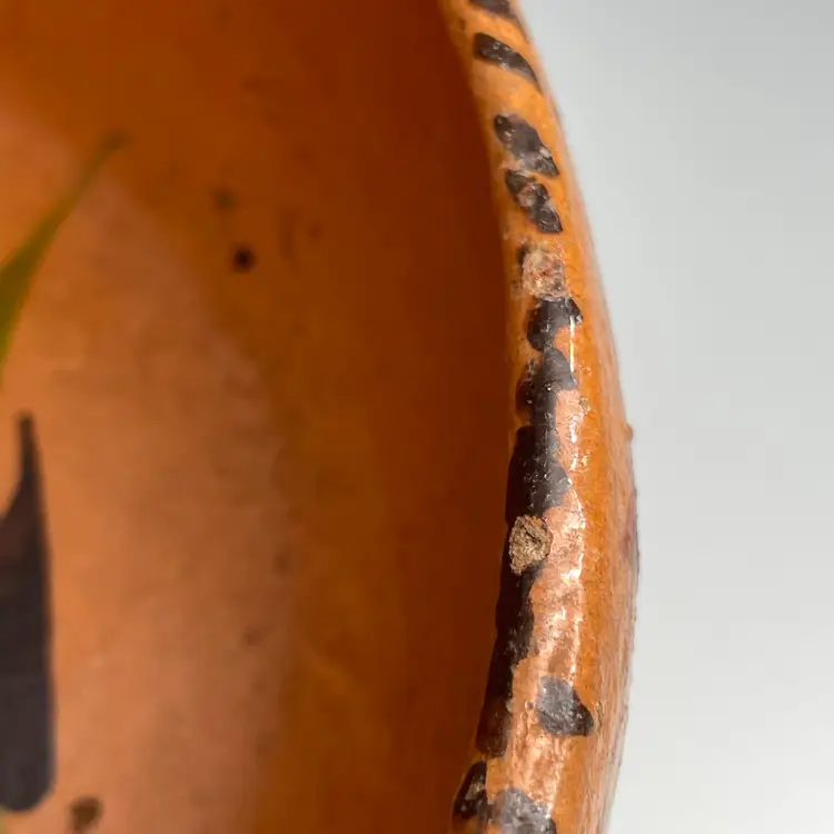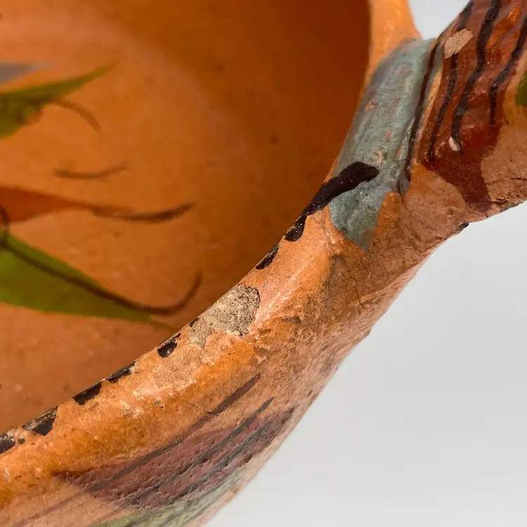 Good Preowned - visible wear and/or minor flaws present. 1 larger rim chip (pictured), followed by some smaller chips and expected imperfections from this handmade ware throughout. Some of the clay body is exposed under chipped paint, and glaze shows some crazing. No cracks. Bottom of pan shows it has been lovingly used as cookware in the past. Can live on as a storied decorative piece.