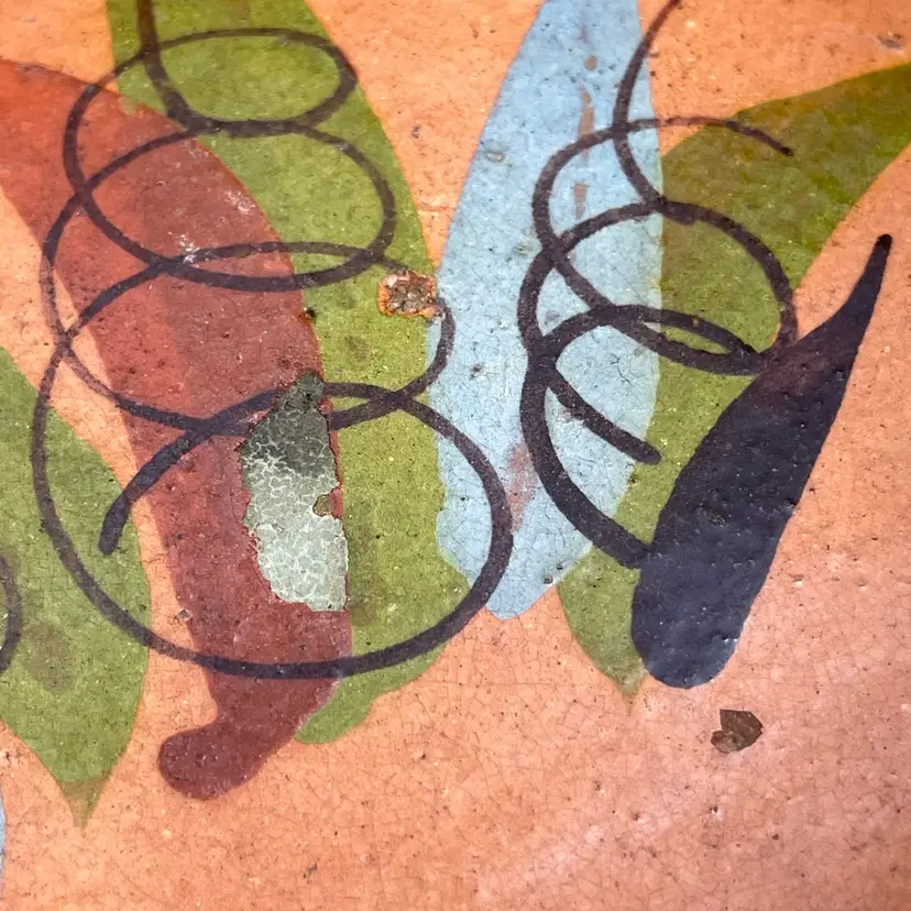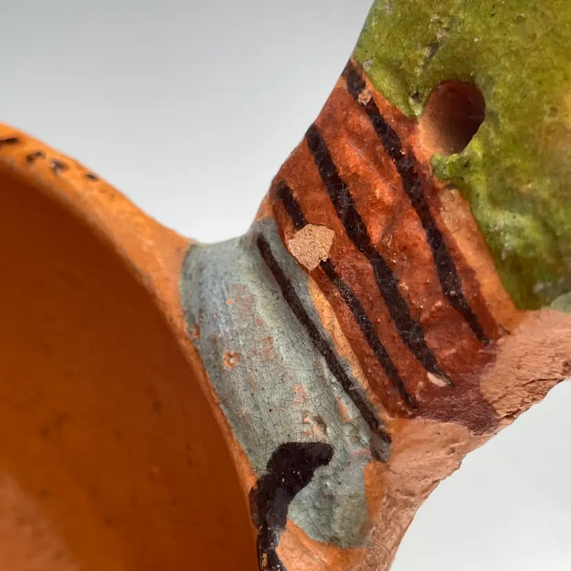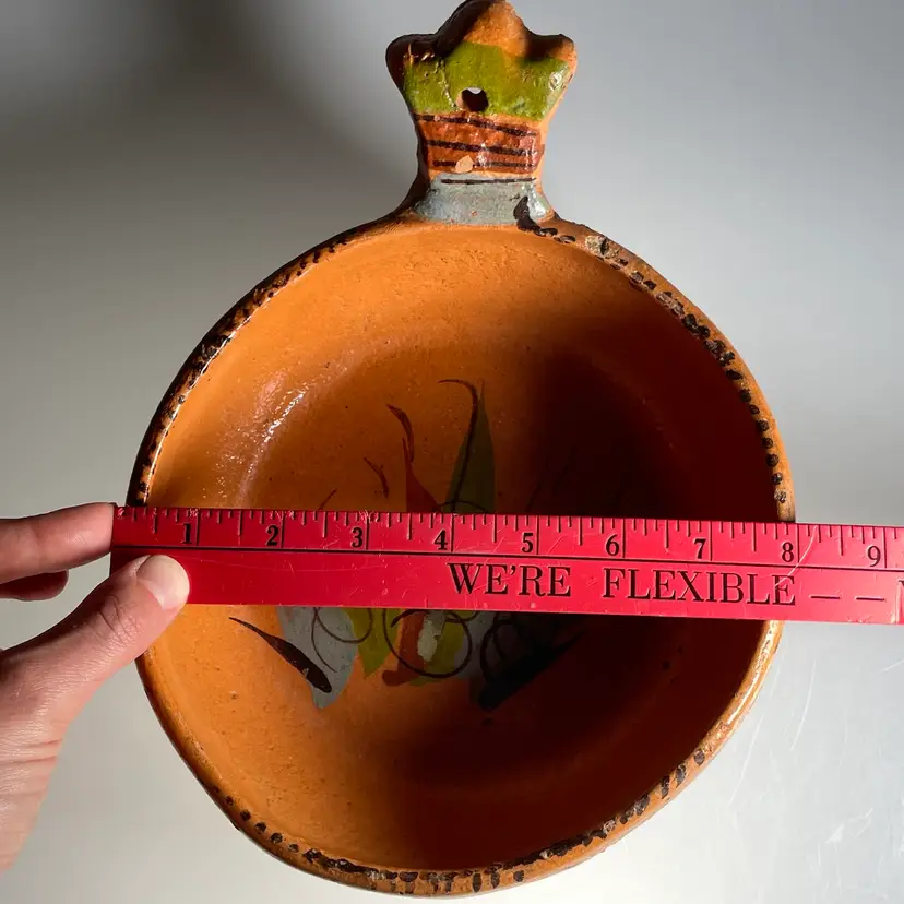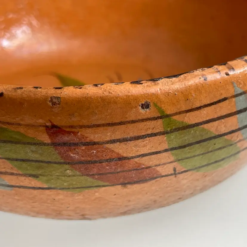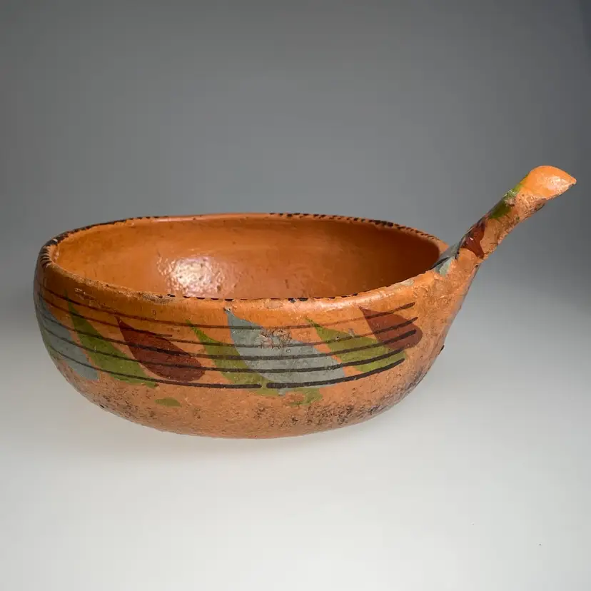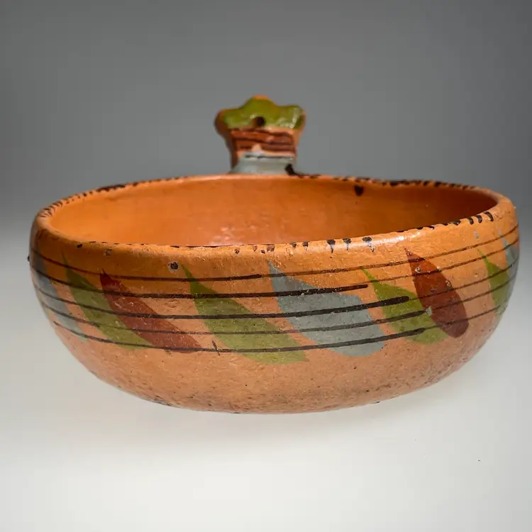 Good Preowned - visible wear and/or minor flaws present. 1 larger rim chip (pictured), followed by some smaller chips and expected imperfections from this handmade ware throughout. Some of the clay body is exposed under chipped paint, and glaze shows some crazing. No cracks. Bottom of pan shows it has been lovingly used as cookware in the past. Can live on as a storied decorative piece.