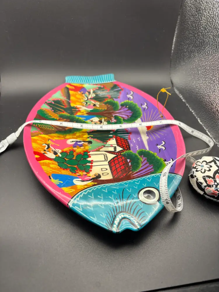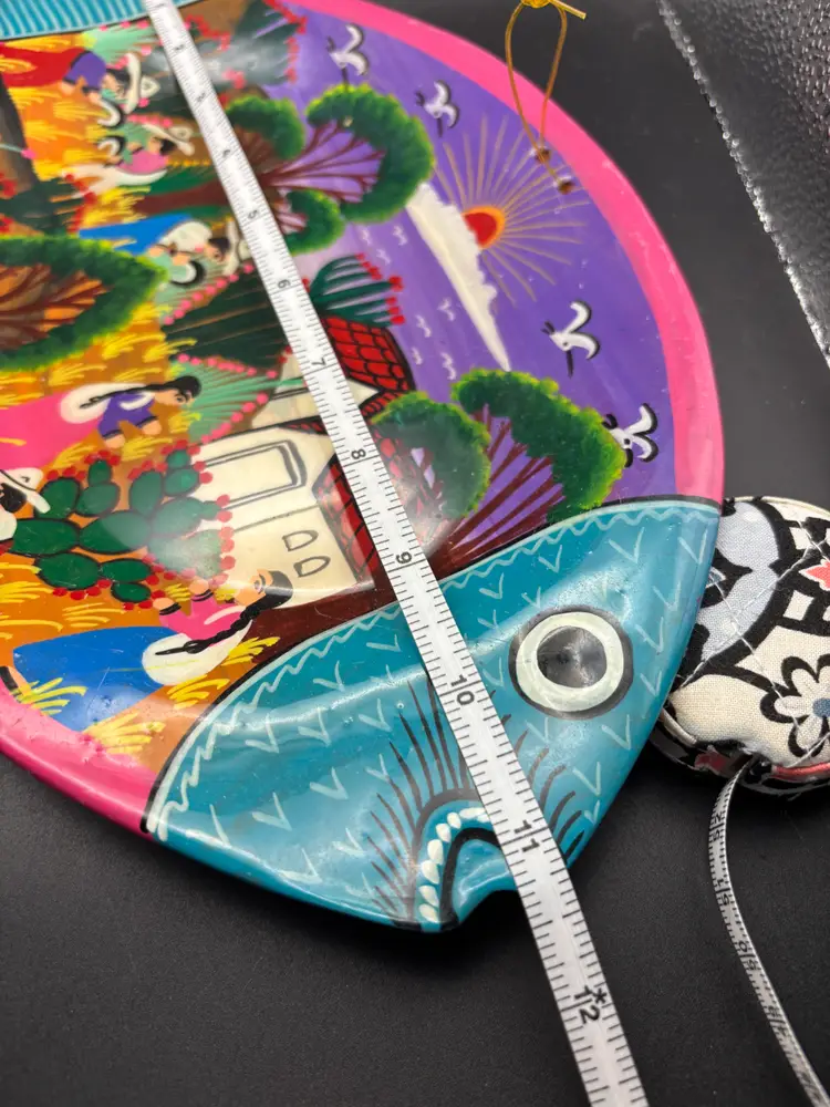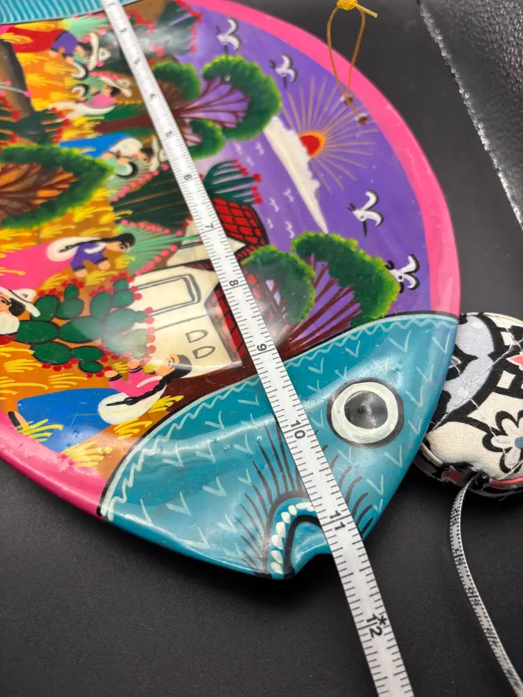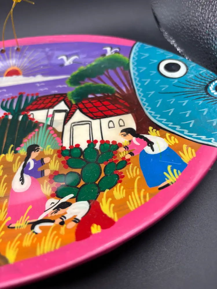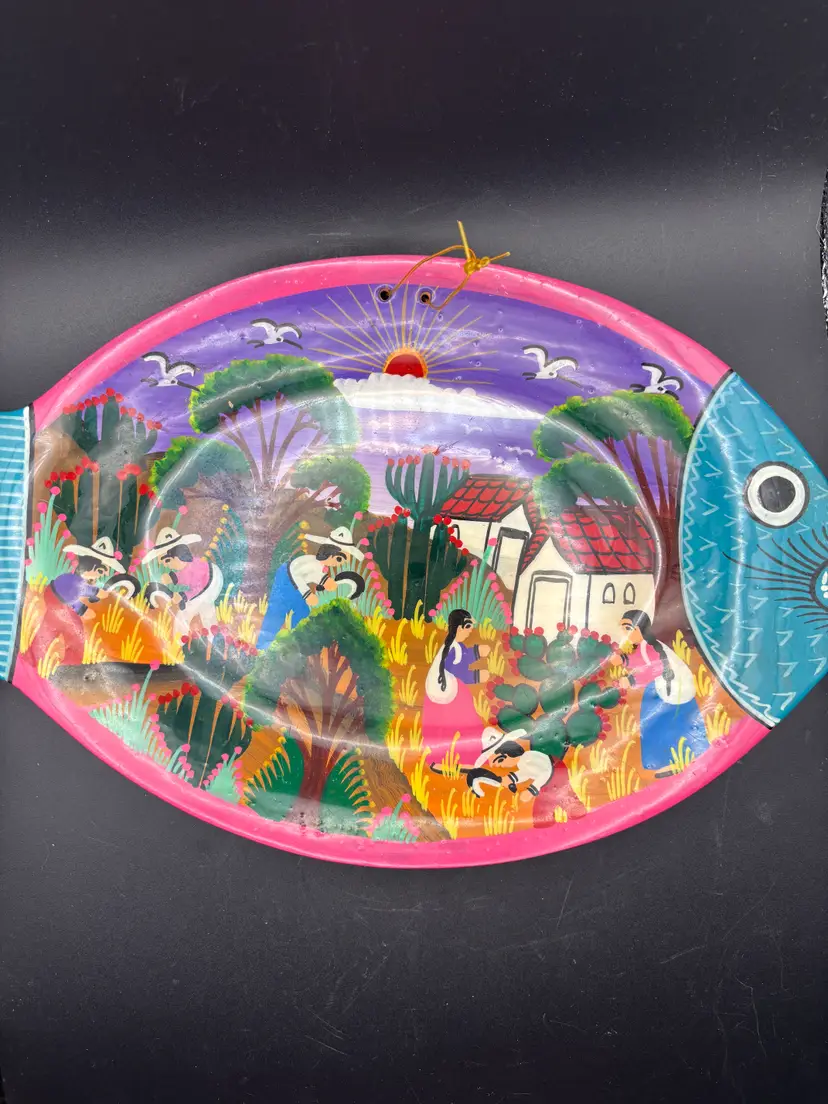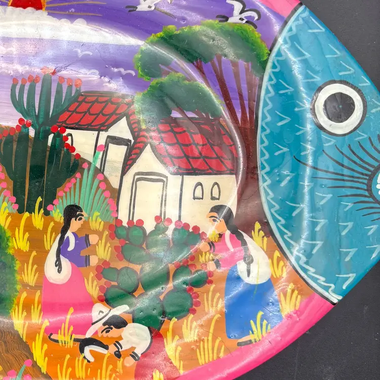 This vibrantly colored fish-shaped plate, likely made of terracotta, depicts a lively Mexican folk art scene. This type of pottery is often referred to as a "Mexican Fish Story Plate" or "storyteller pottery" because the painted imagery tells a narrative.