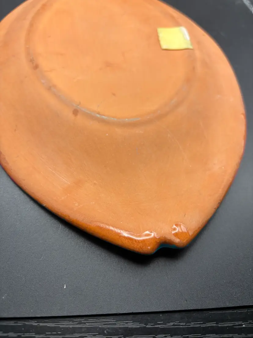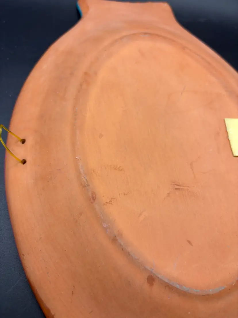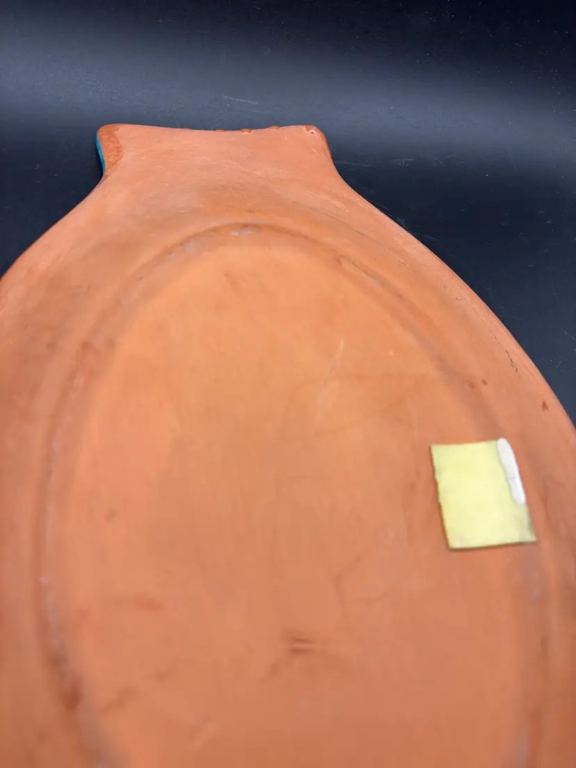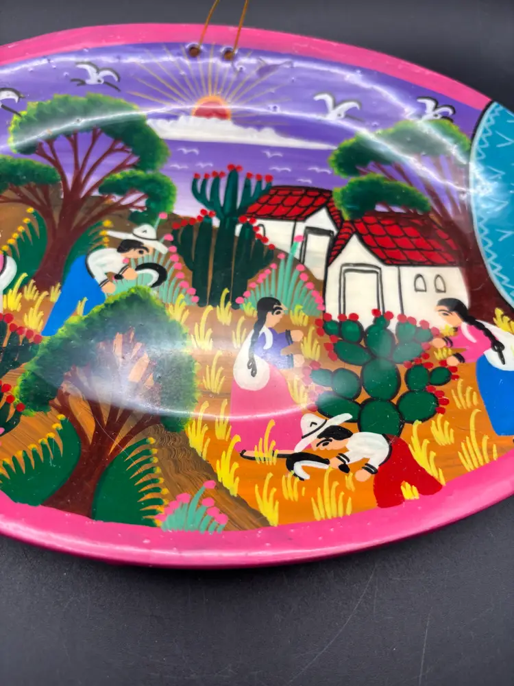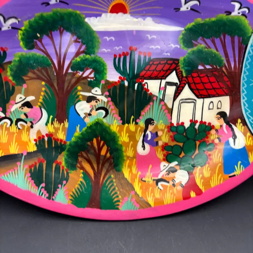 This vibrantly colored fish-shaped plate, likely made of terracotta, depicts a lively Mexican folk art scene. This type of pottery is often referred to as a "Mexican Fish Story Plate" or "storyteller pottery" because the painted imagery tells a narrative.