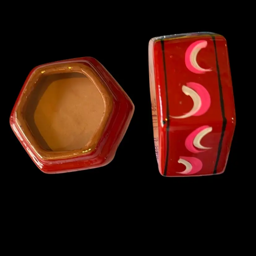 Beautiful and vibrant folk art hand painted trinket box. Marked Mexico on the bottom. No chips or cracks. There is glaze drip on the interior. Measures 3 1/2 inches at its longest and 2 inches tall.