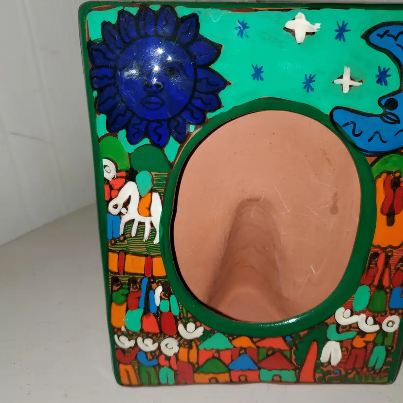 This beautiful Mexican Folk Art Easel Frame is a stunning piece that will add a touch of ethnic charm to any room. The hand-painted terracotta design features a sun and moon with a green background, like Telavera, adding a unique touch to your collection. The frame is perfect for displaying your favorite art, and the intricate details make it a true work of art itself.
