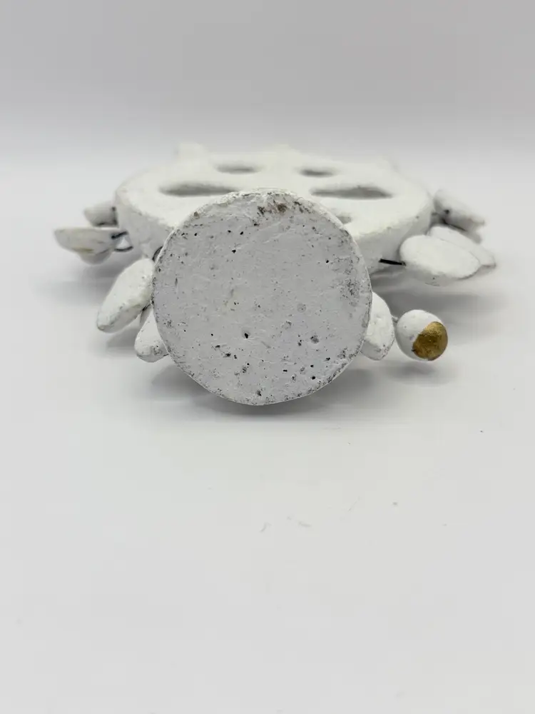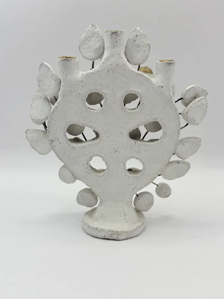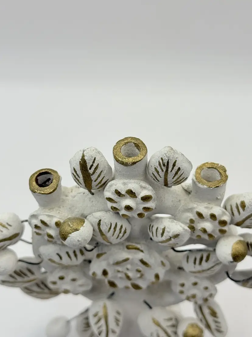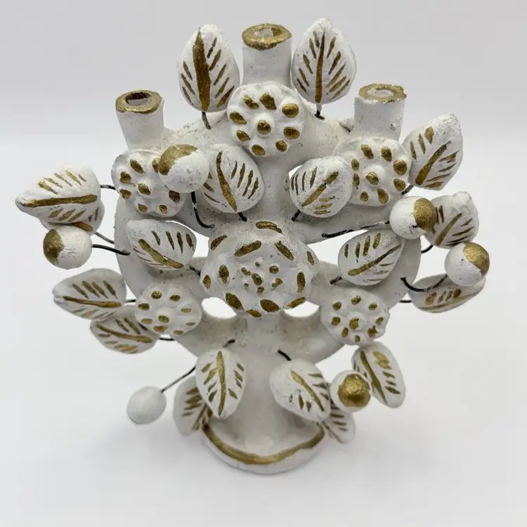 Small collectible handmade Mexican pottery candleholder in a beautiful gold and white combination. Traditionally given as wedding gifts. No chips or cracks Approximately 5”x 5”