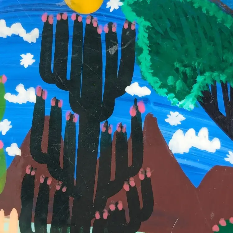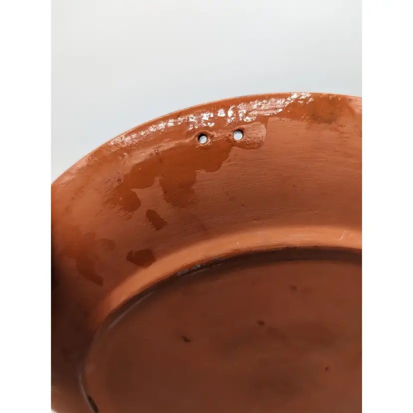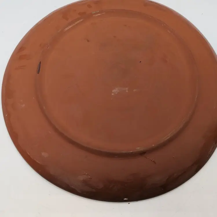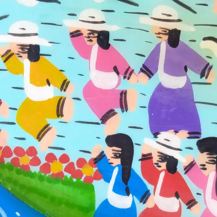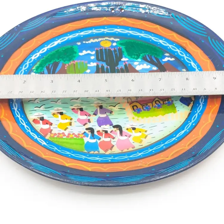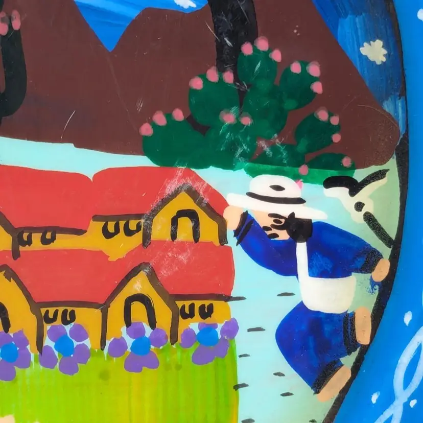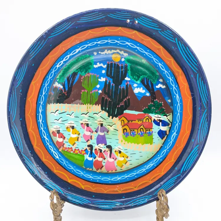 A gorgeous work of vintage Mexican folk art. The plate depicts people, houses, flowers and fruit, and is approximately 10" in diameter. Handmade and ready to hang.