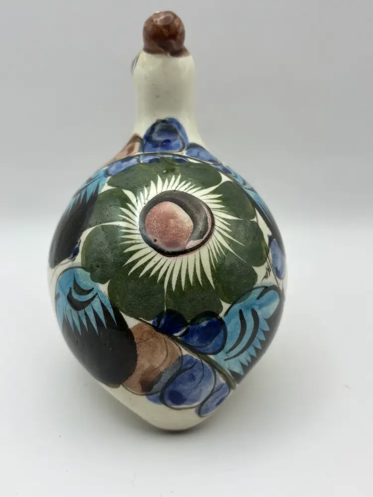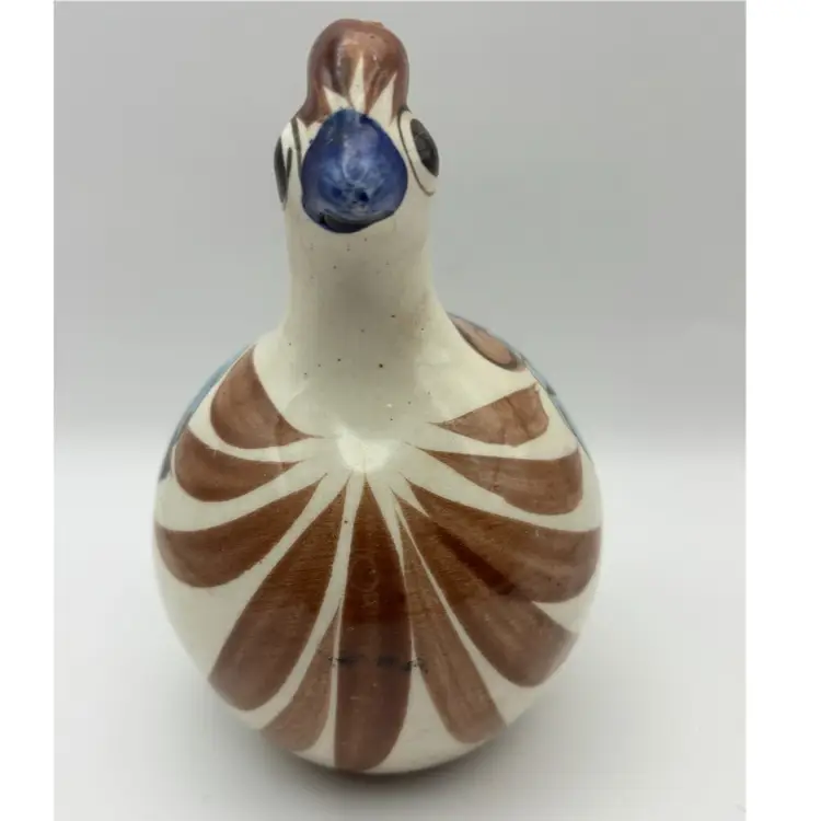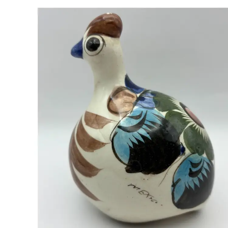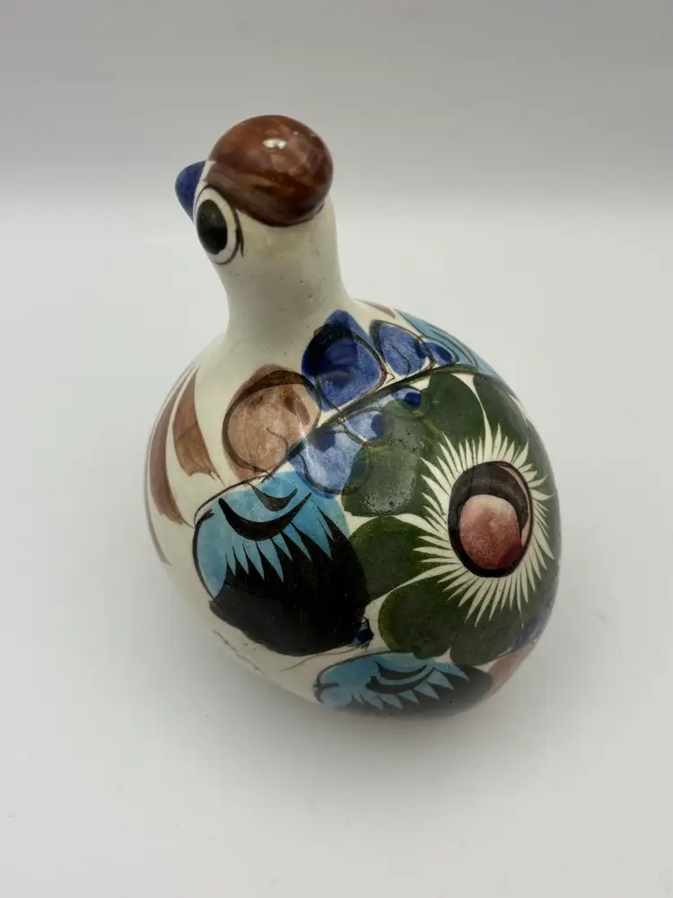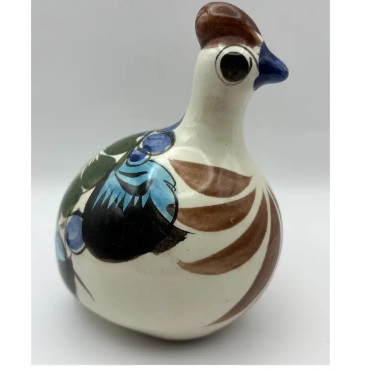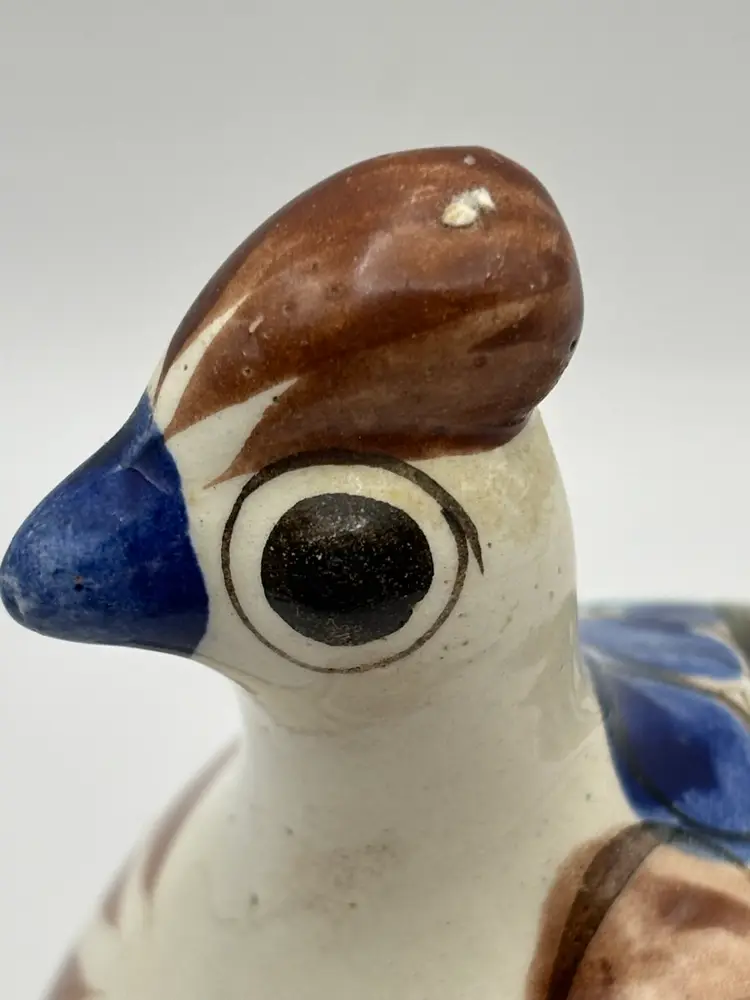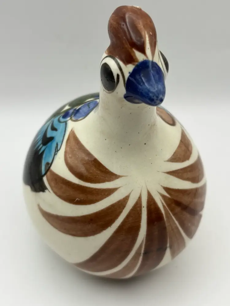 Tonala pottery quail bird in nice earthy colors Has a small glaze imperfection on comb. Can be touched up. 5” tall. 4” wide