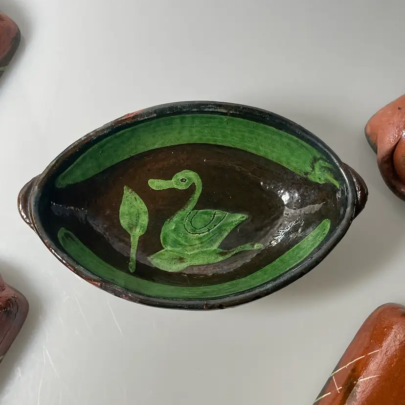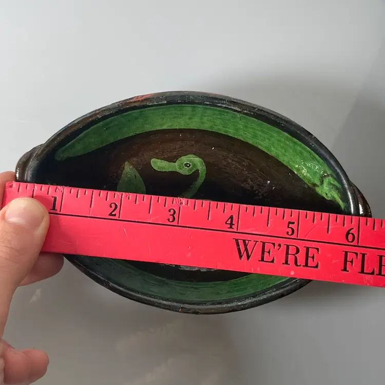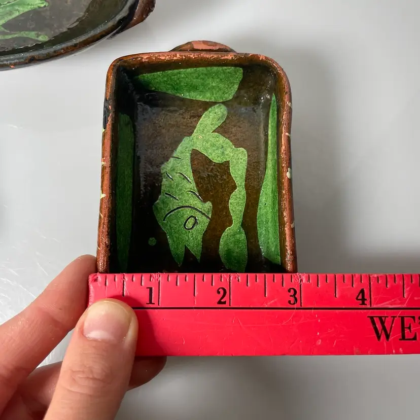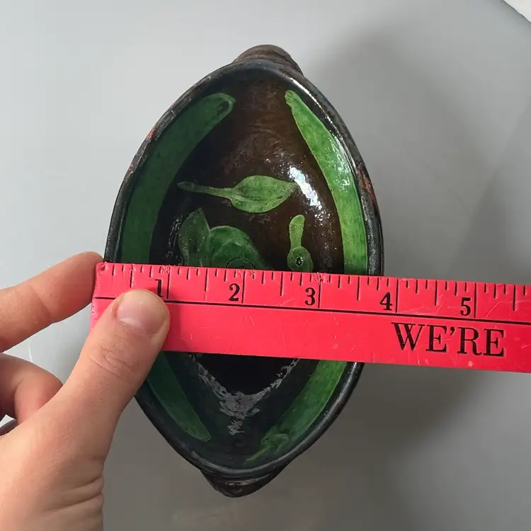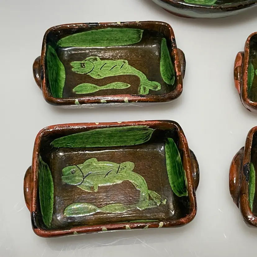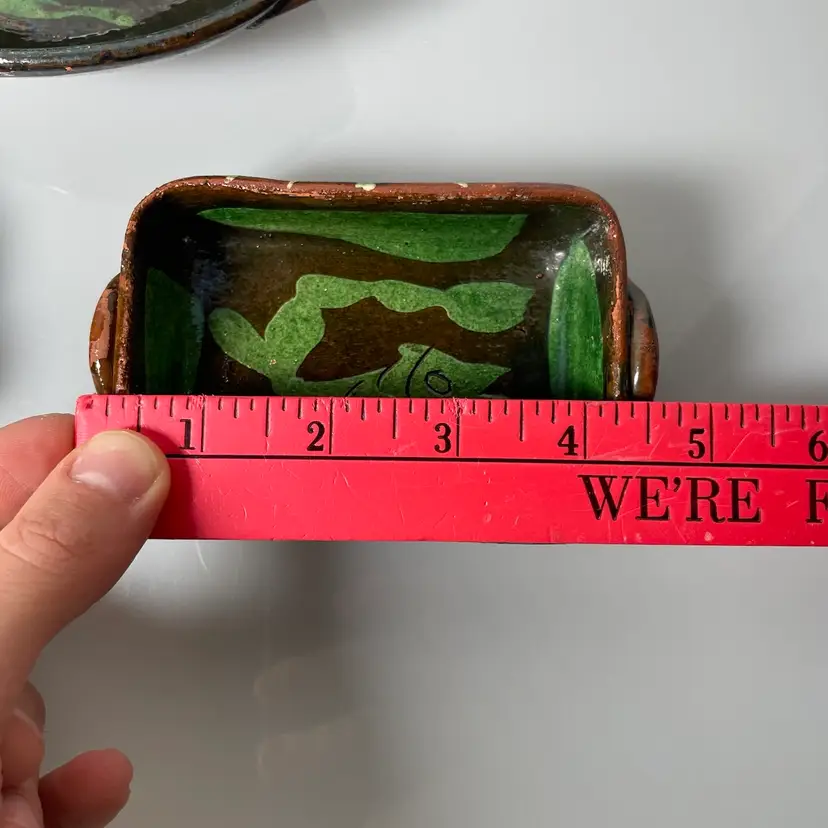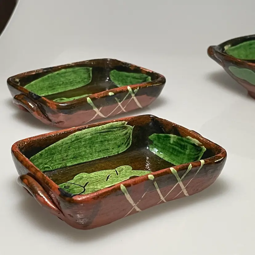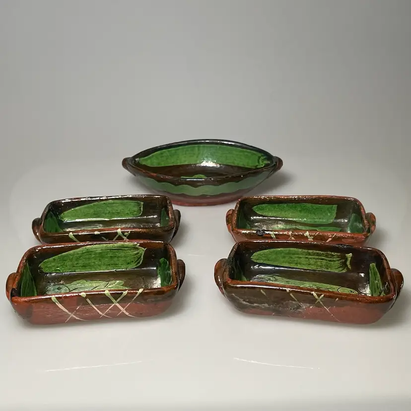 Measurements are approximate: the oval bowl is 6.25 inches long, 3.75 inches wide and 1.5 inches tall. The rectangular sauce bowls are approx. 4.75 inches long, 3 inches wide, 1 inch tall