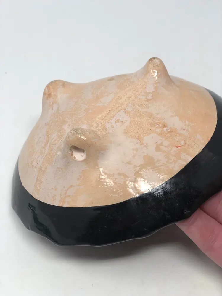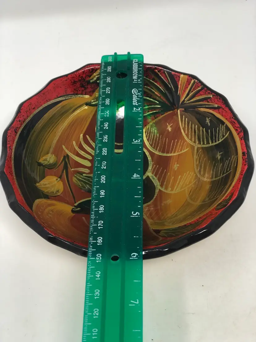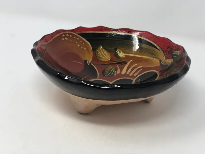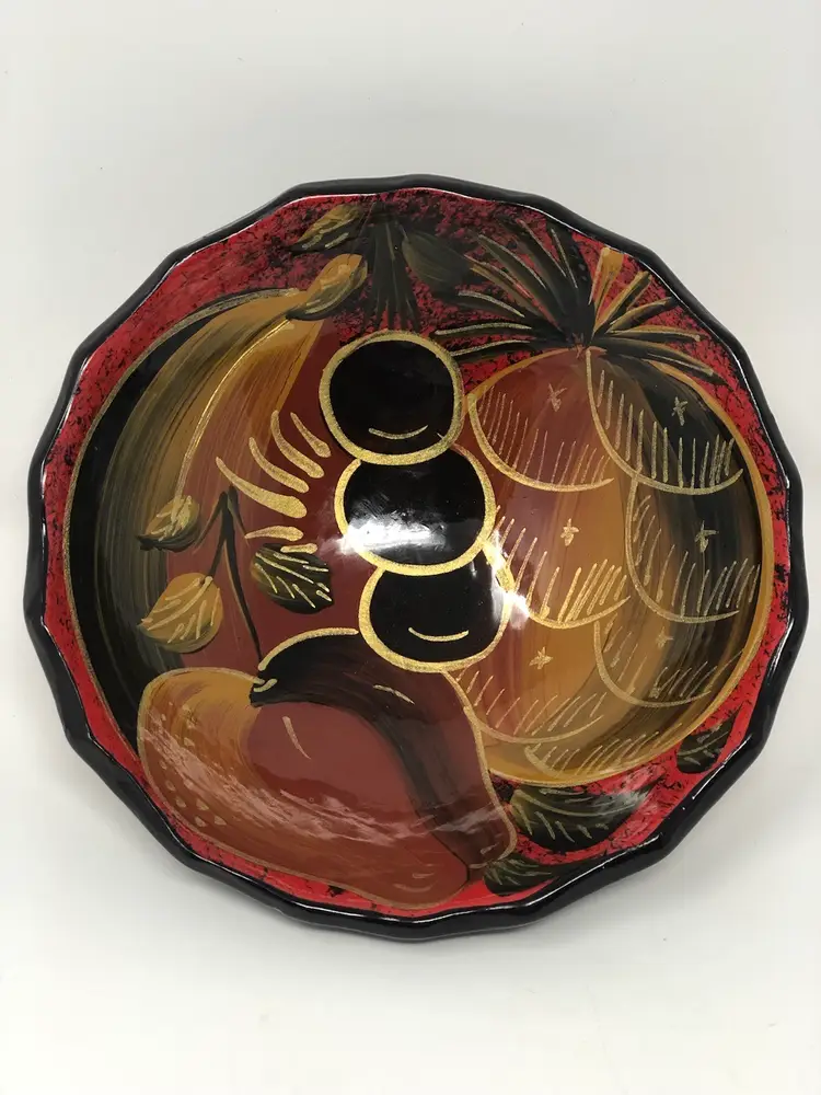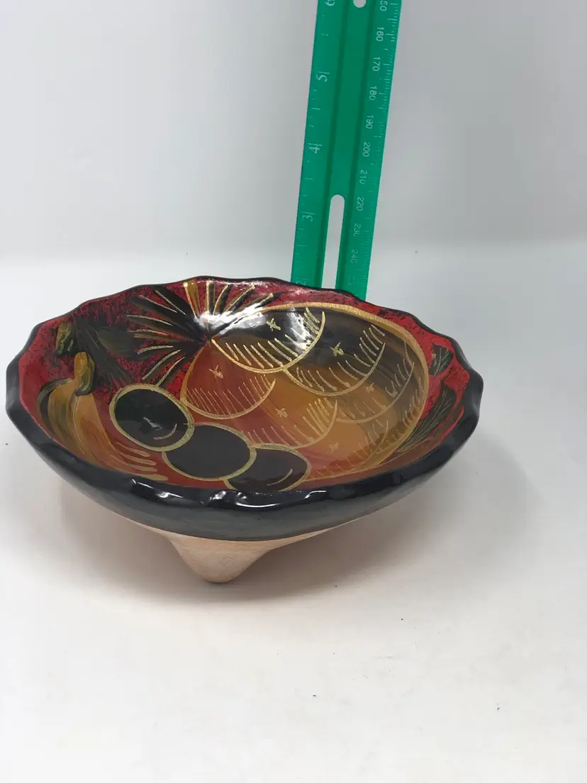 5 1/2” pottery bowl features hand painted fruit outlined in gold. 3 footed bowl in excellent condition no chips or cracks