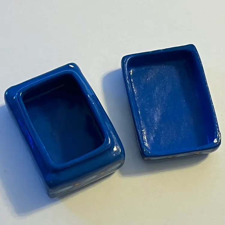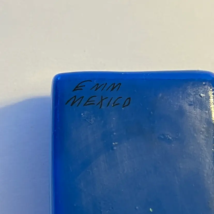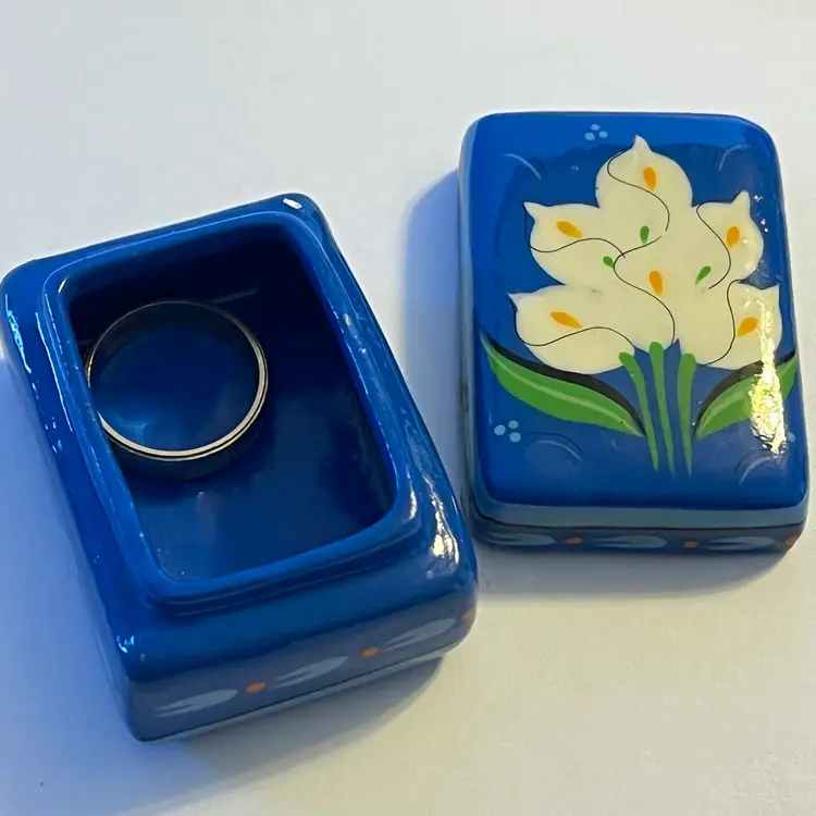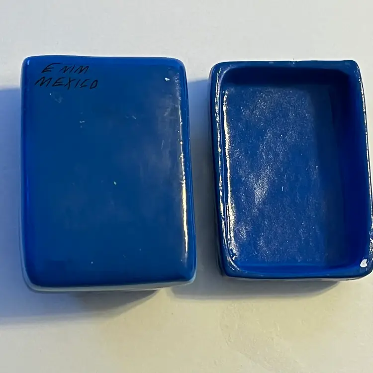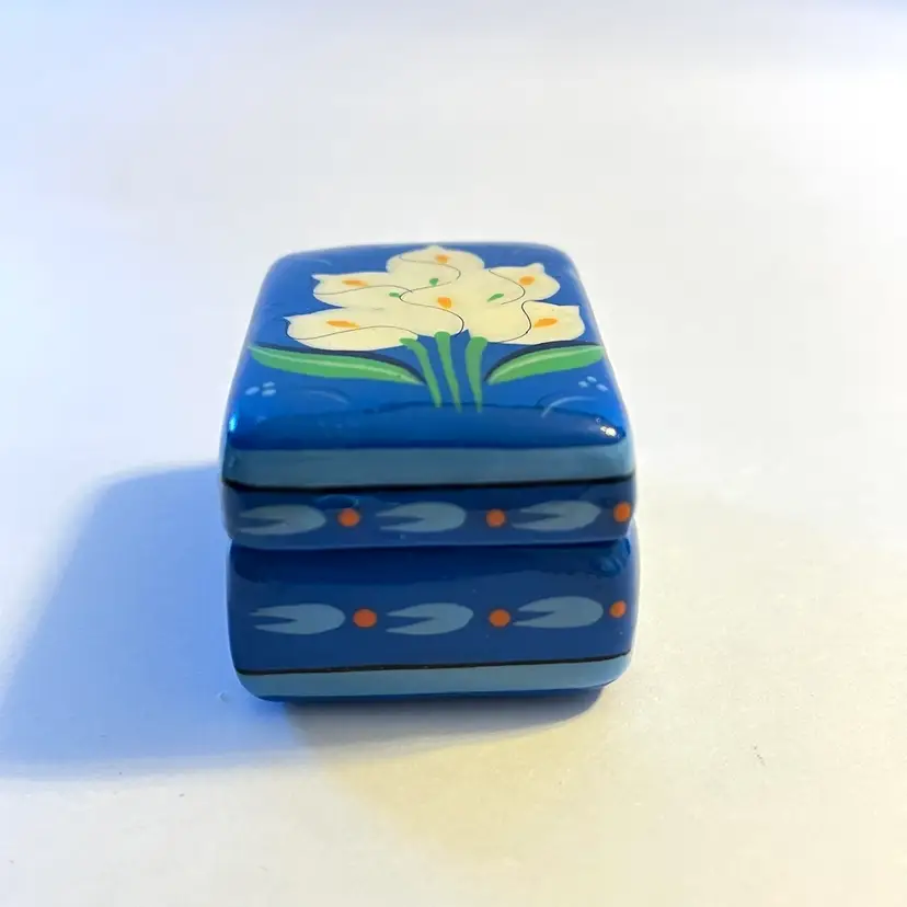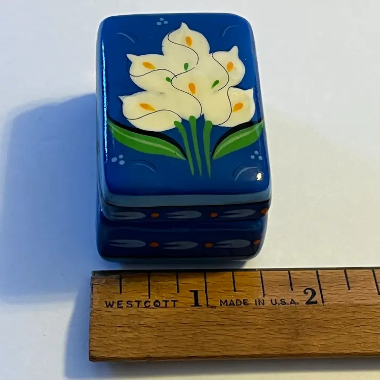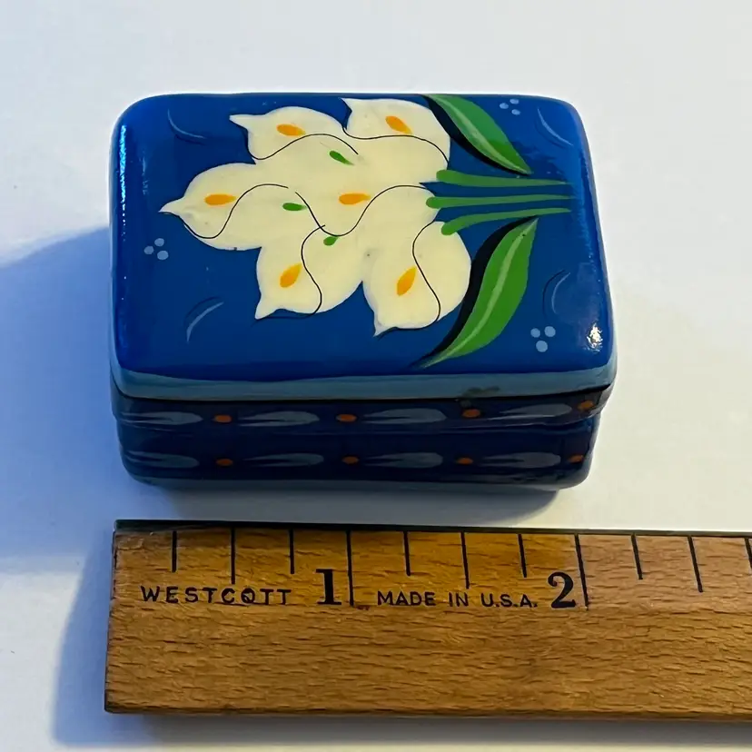 This charming little Mexican pottery box features hand painted calla lilies on the lid, painted in soft white with yellow centers against a palette of aqua and blue. Made in the Talavera‑style folk‑art tradition, it shows the bright colors, organic brushwork, and warm character typical of regional studio pottery. Perfect for holding rings, pills, or tiny keepsakes, it measures approximately 2 inches long, 1.5 inches wide, and 1.25 inches tall.