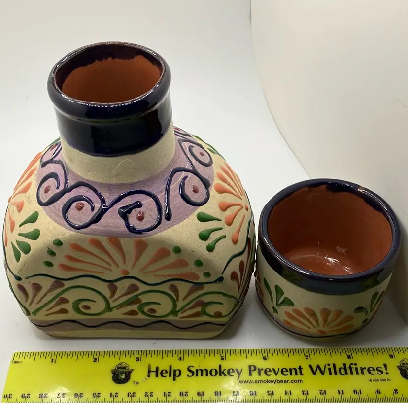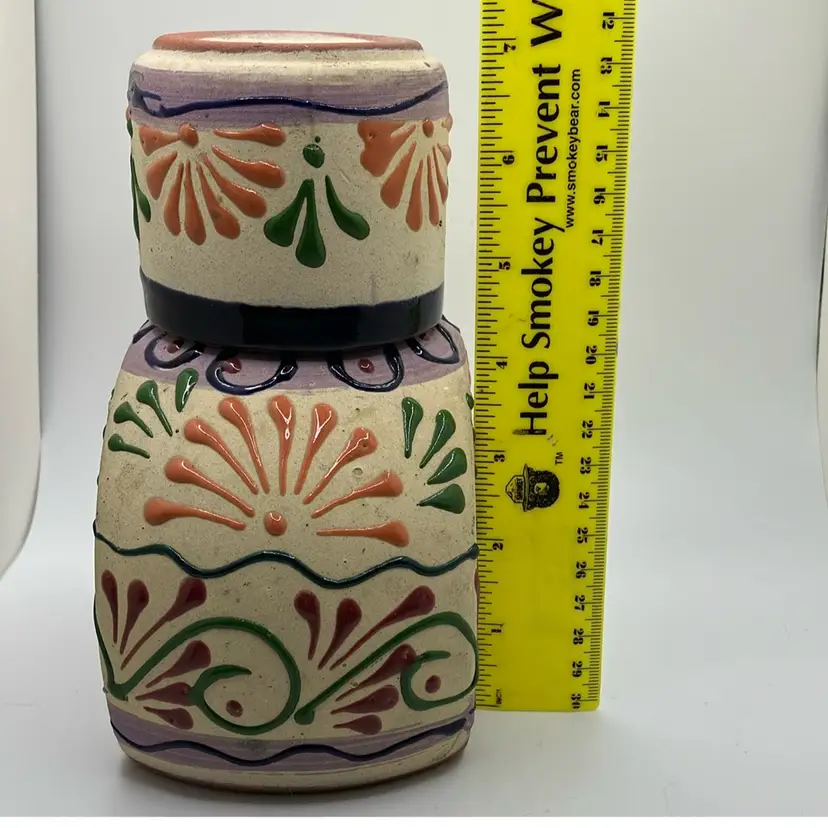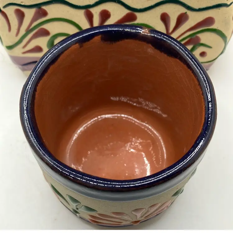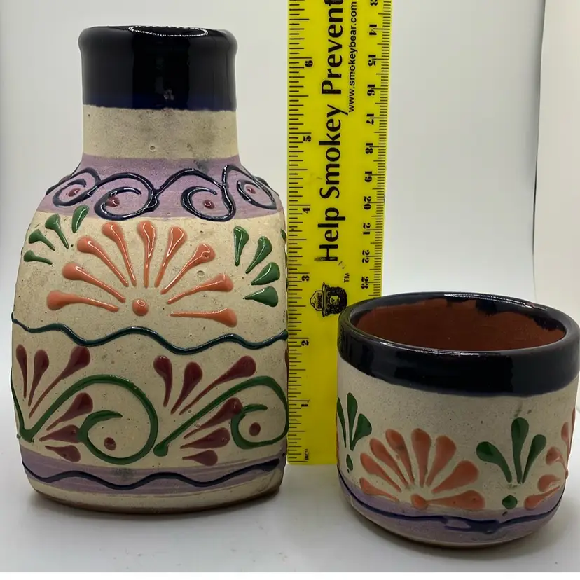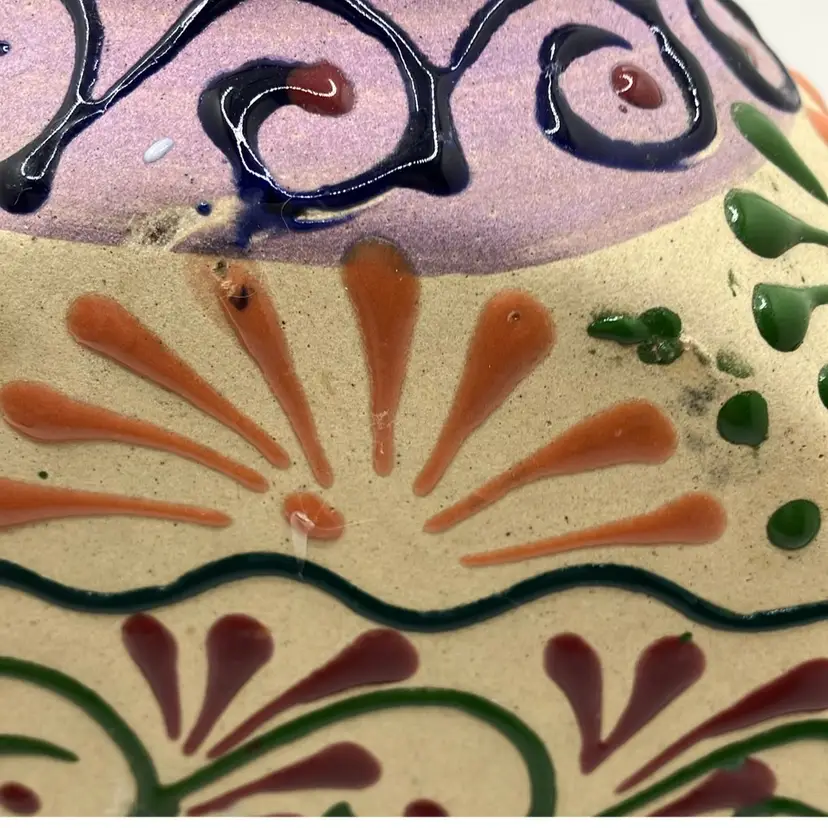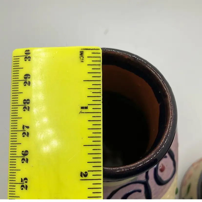 Good condition- a couple spots of smudged paint and tiny glaze miss on rim of cup. No chips or cracks.