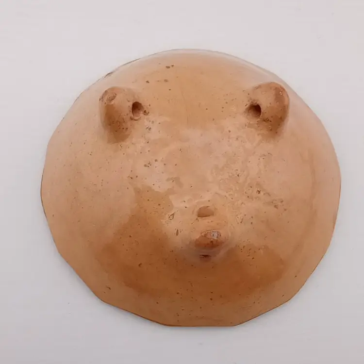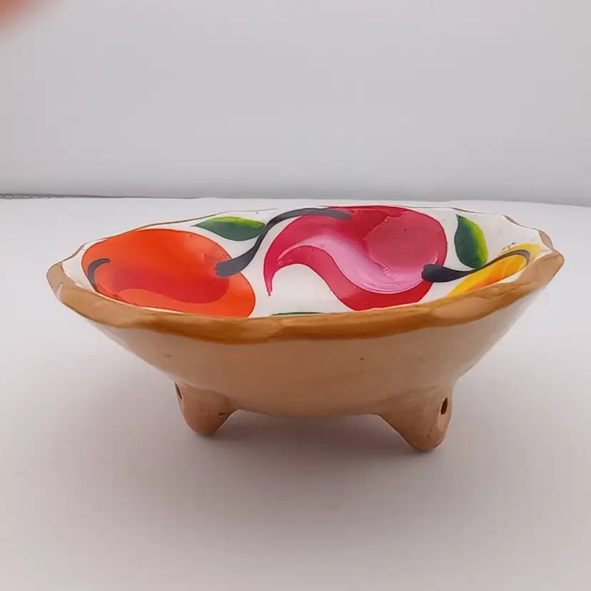 This salsa dish from Mexico has a vibrant pepper decoration and three tiny feet. It's just under 4" across and 1.5" tall and is in excellent condition with no chips or cracks.