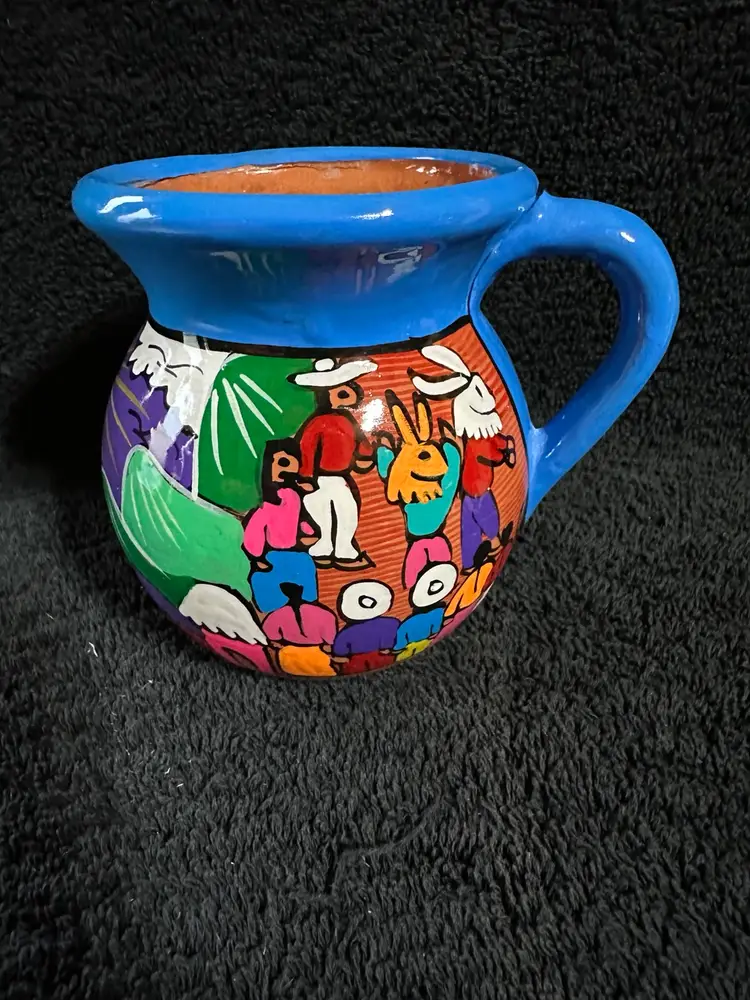 This beautiful redware pottery mug is a unique piece of Mexican artwork, perfect for collectors of Latin American culture. Handmade with care, this mug showcases the talent of traditional Mexican artisans. It features a stunning story-telling design that depicts the rich heritage and history of Mexico.