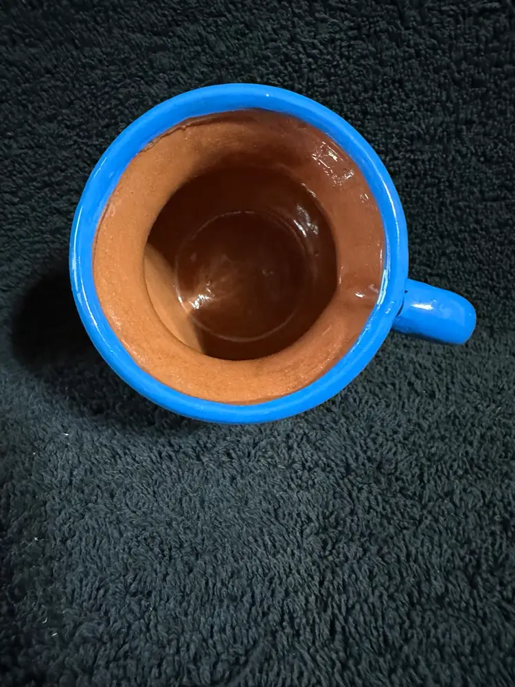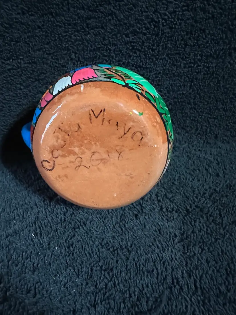 Crafted in Mexico, this mug is a true representation of the country's skilled craftsmen. The intricate details of the design and the artist's signature add to its authenticity. This collectible piece is perfect for anyone who appreciates the beauty of Mexican art and the stories it tells. It measures 4 1/4” x 5” with the handle. It is signed on the bottom costa maya? 2018. It has no chips or cracks.