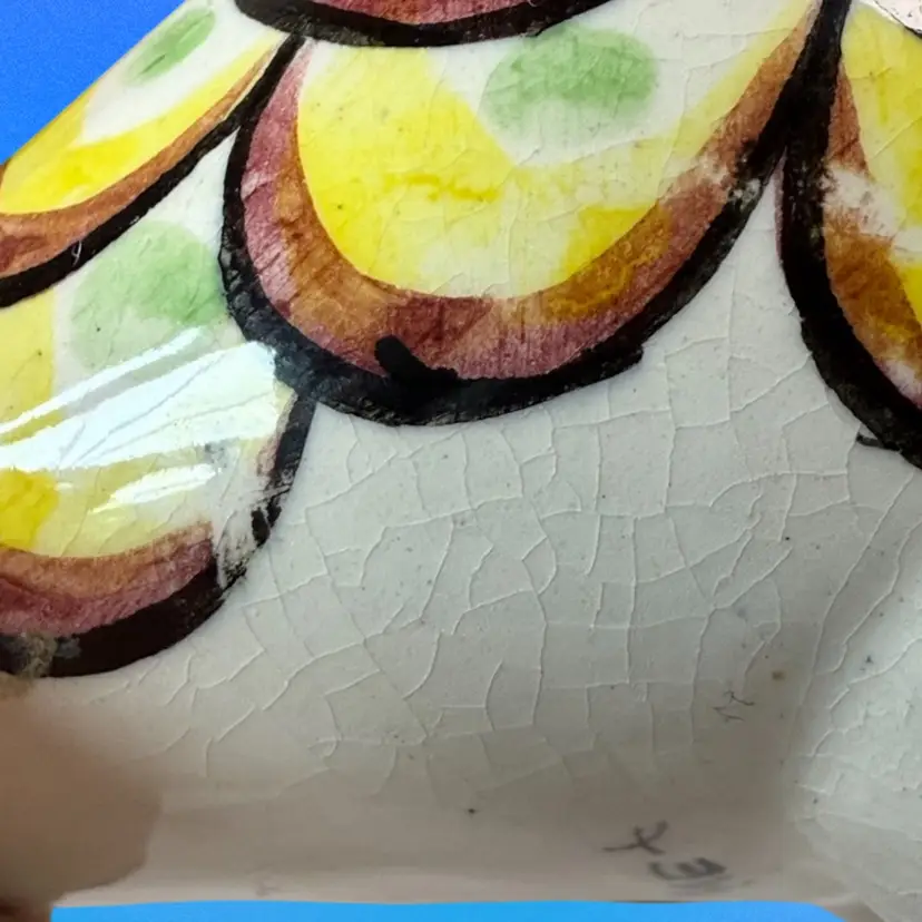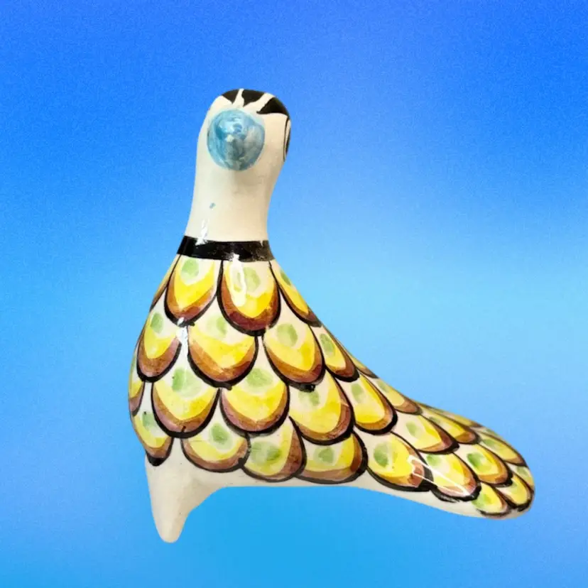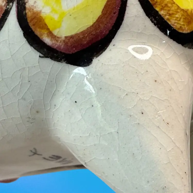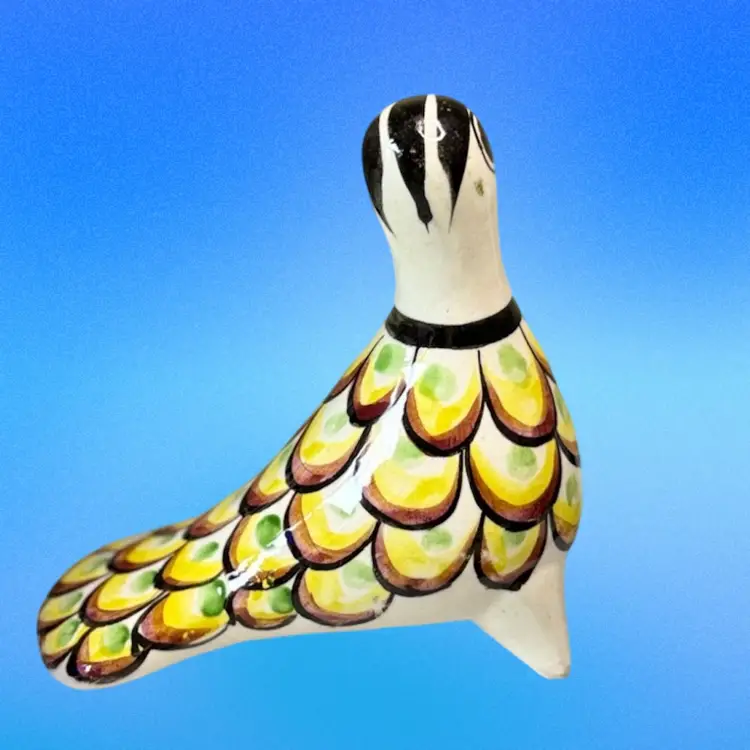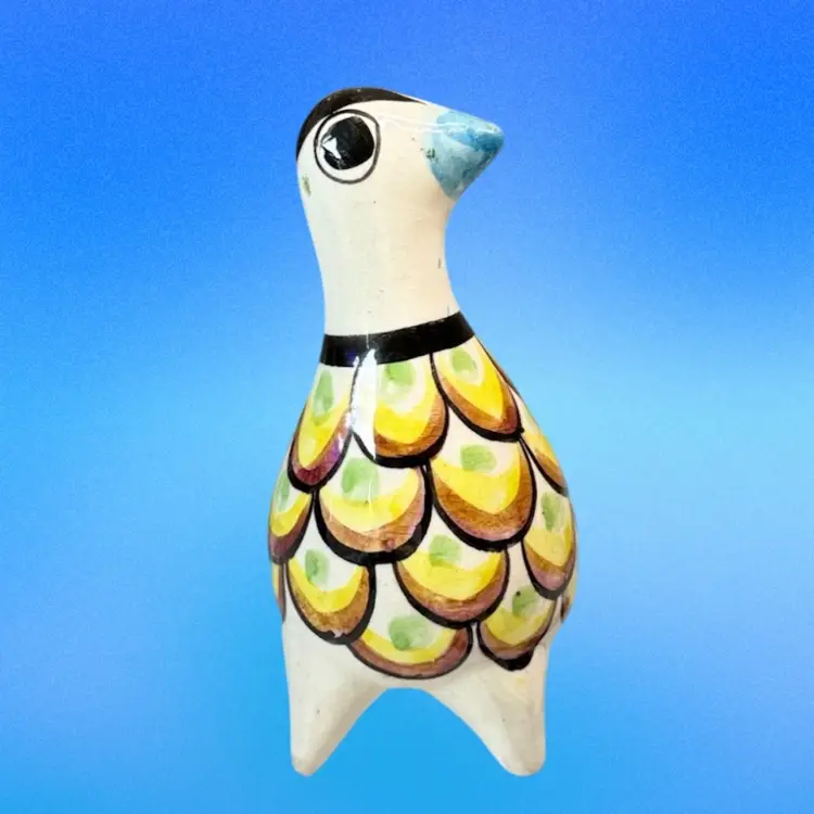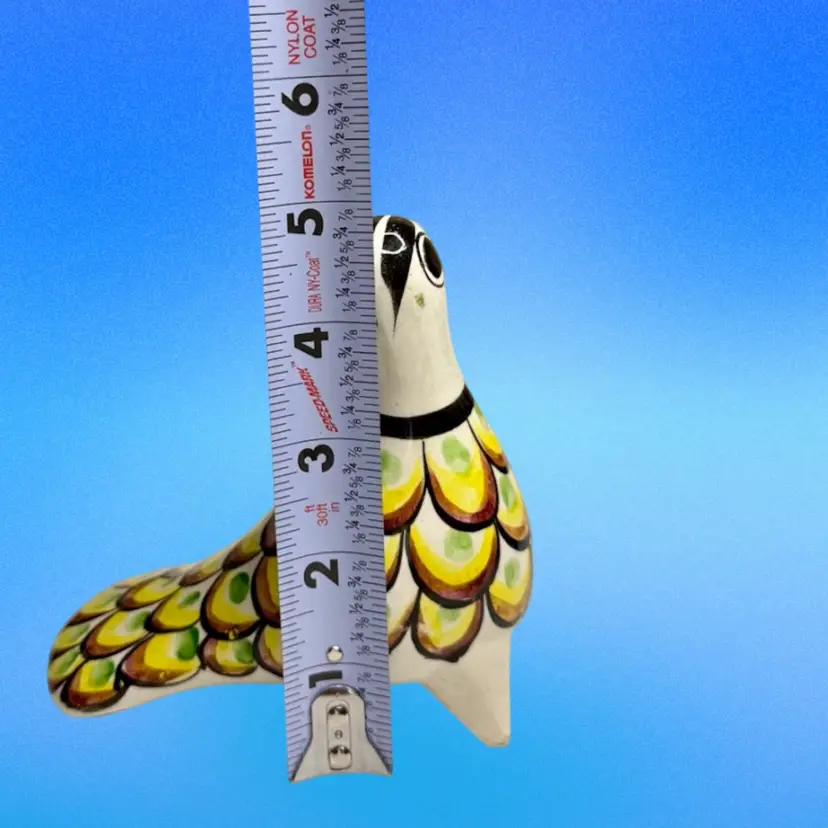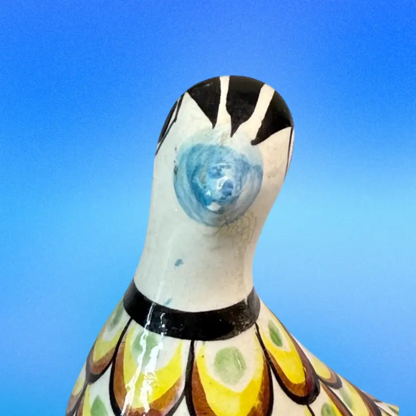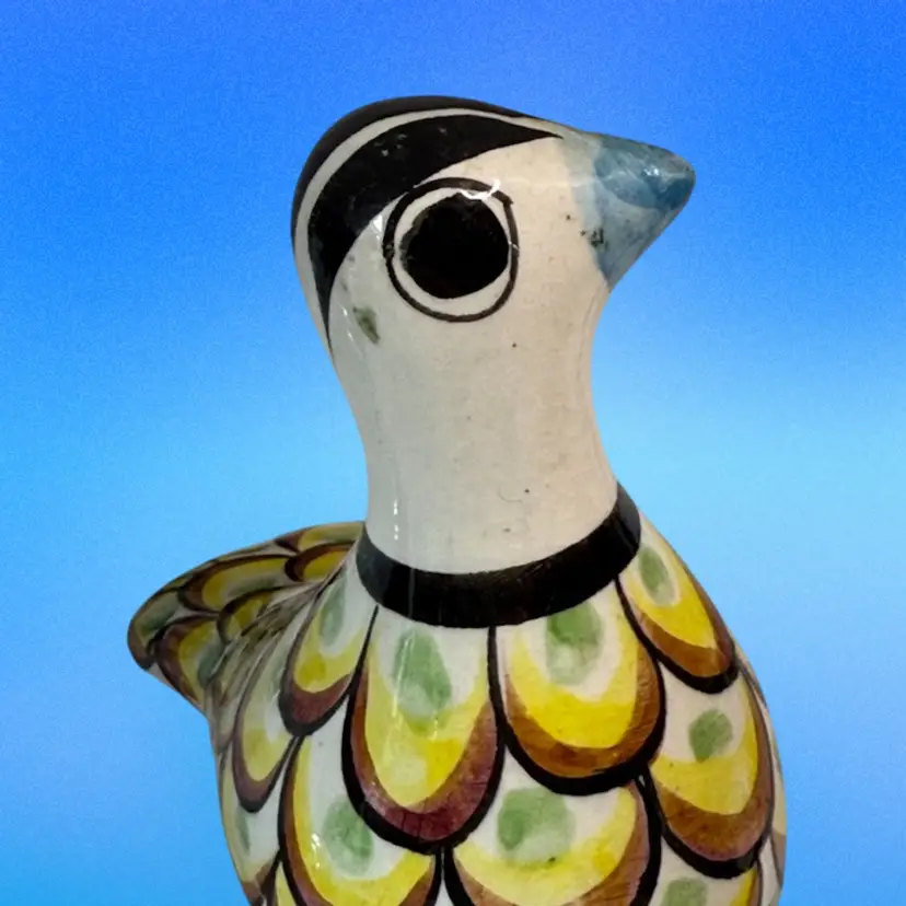 Fancy feathered Tonala bird. Condition: Crazing from age, paint spot on head and neck, no others issues noted. Please see pictures for condition and measurements as they are part of the description. Thank you for looking