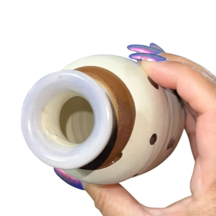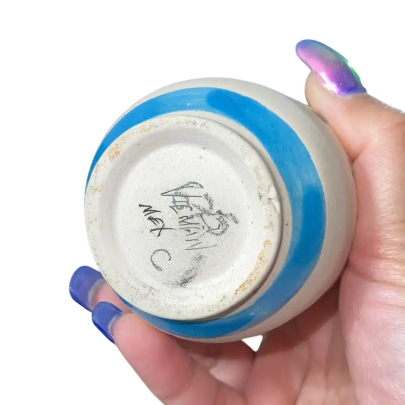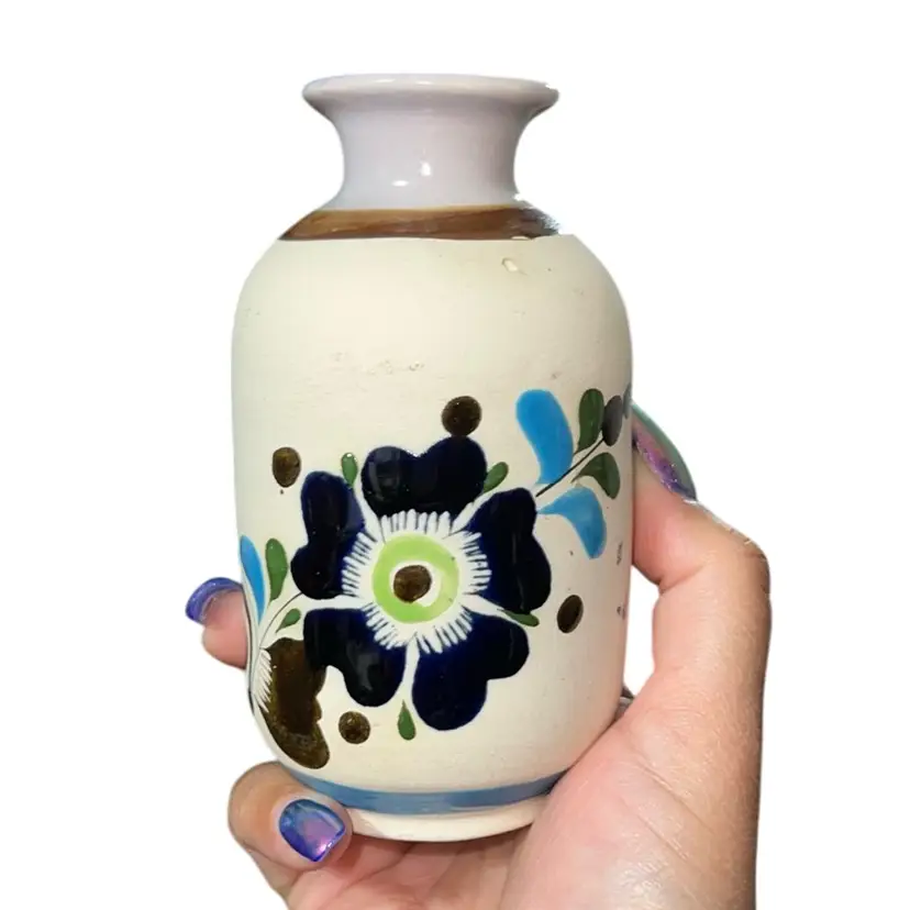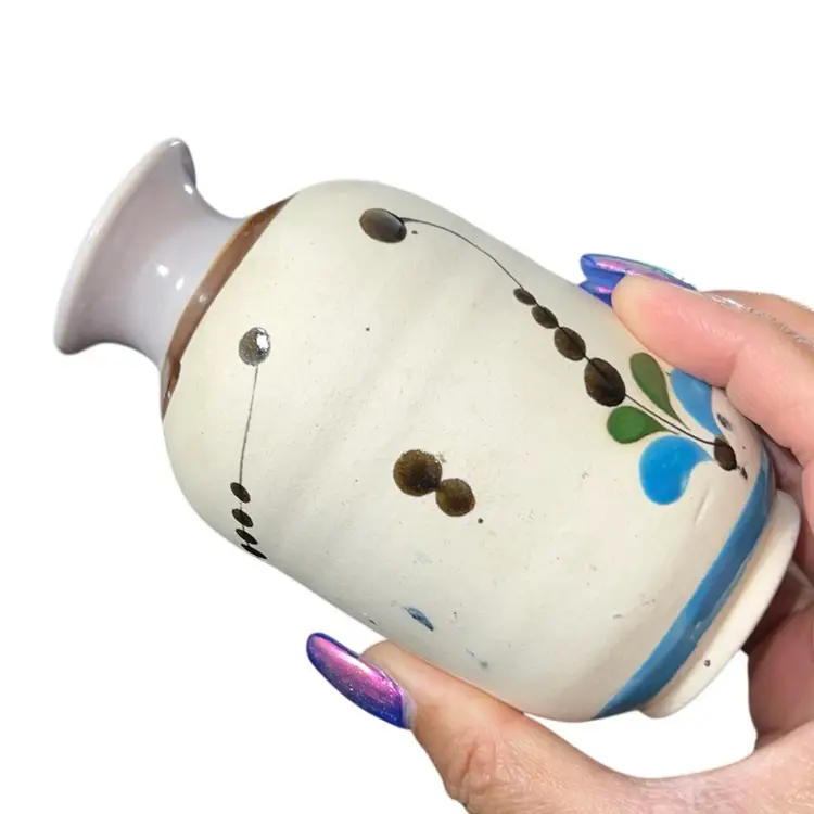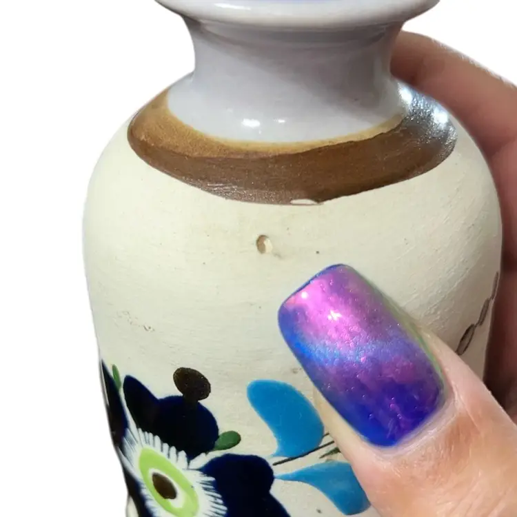 no chips or cracks. Gorgeous little bud vase. There is a very small puncture close to the top. Please see photo. Likely happened during production. One and a half inches in diameter and 4.75 inches tall.
