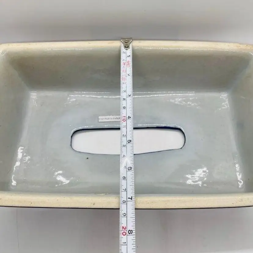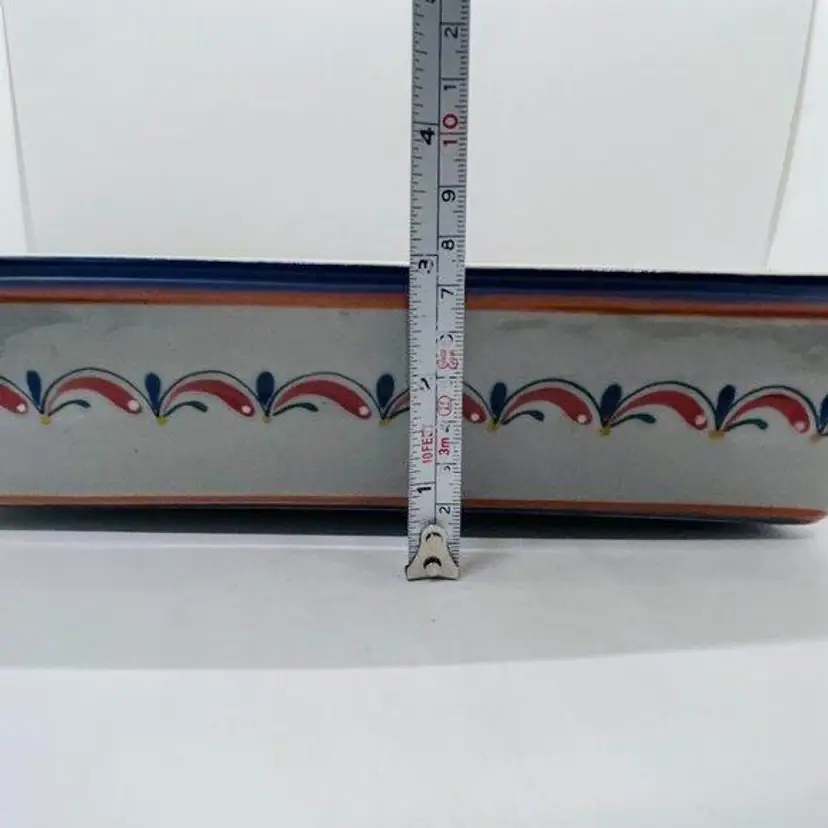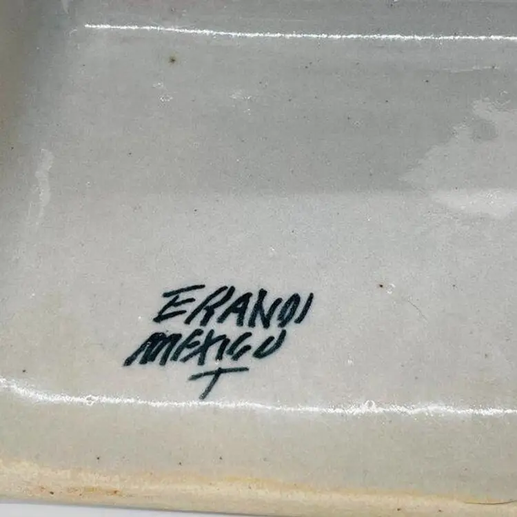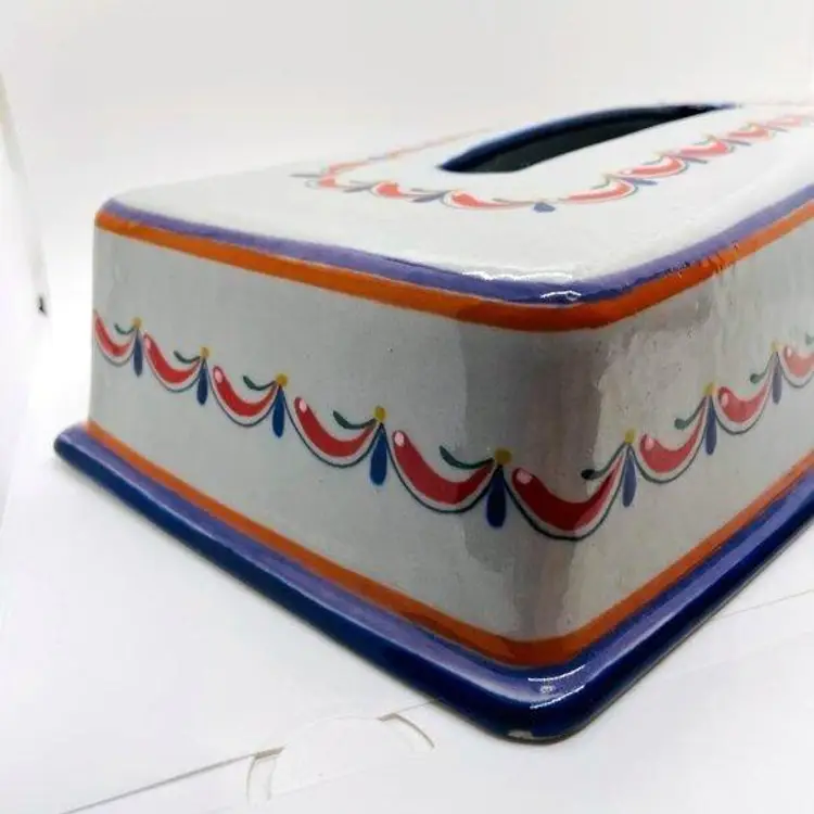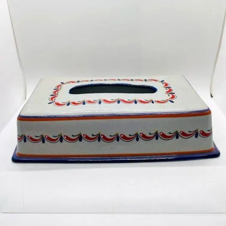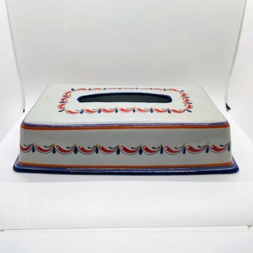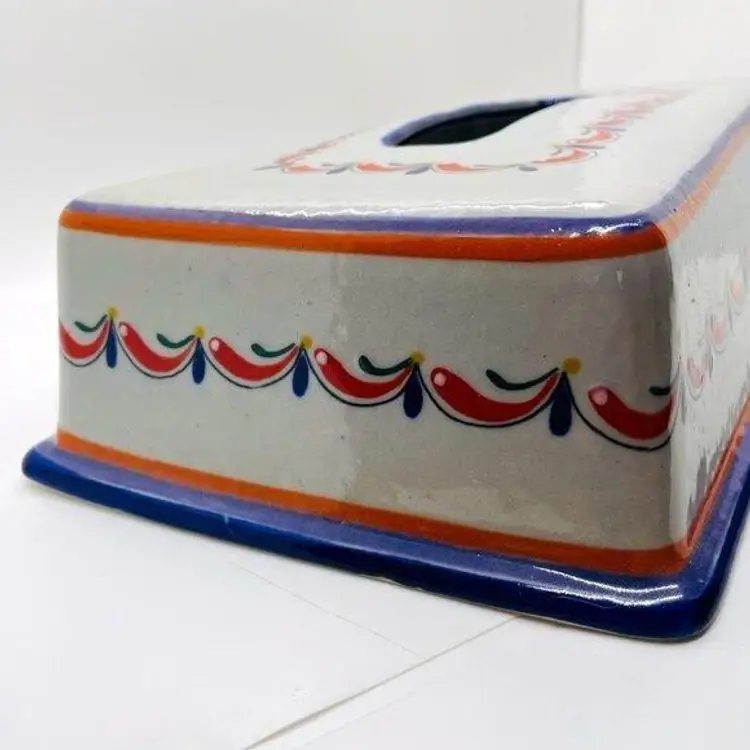 Keywords: Mexican, Mexico, Tonala, Talavera, Pottery, Stoneware, Ceramic, Rectangular, Tissue, Cover, Holder, Handmade, Hand Painted, Marked, Signed, Gray, Grey, Blue, Red, Orange, Green, Yellow, Home, Decor, Accent, Decorative, Bathroom, Living Room, Bedroom, Garland