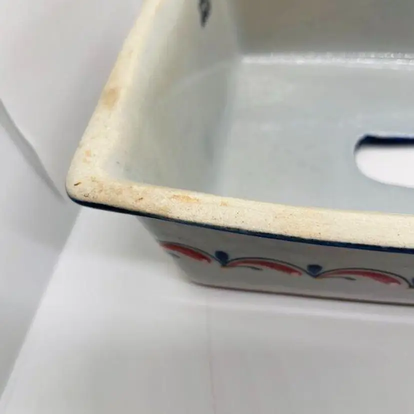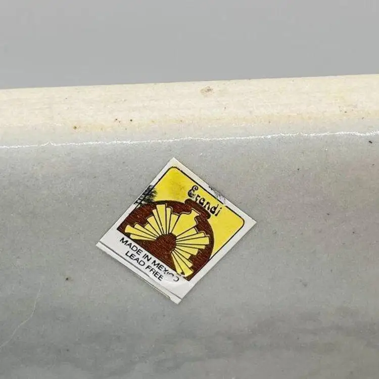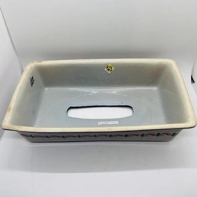 Mexican Tonala Pottery Stoneware Rectangular Tissue Box Cover Holder. Grey with a blue and orange trim/ border and a red, blue, green, and yellow garland along the sides and the top around the hole. Made by Erandi, marked and stickered. No chips or cracks. Shows some signs of light wear and use. The top is not perfectly flat, there is a bow up towards the middle. Please see pictures.